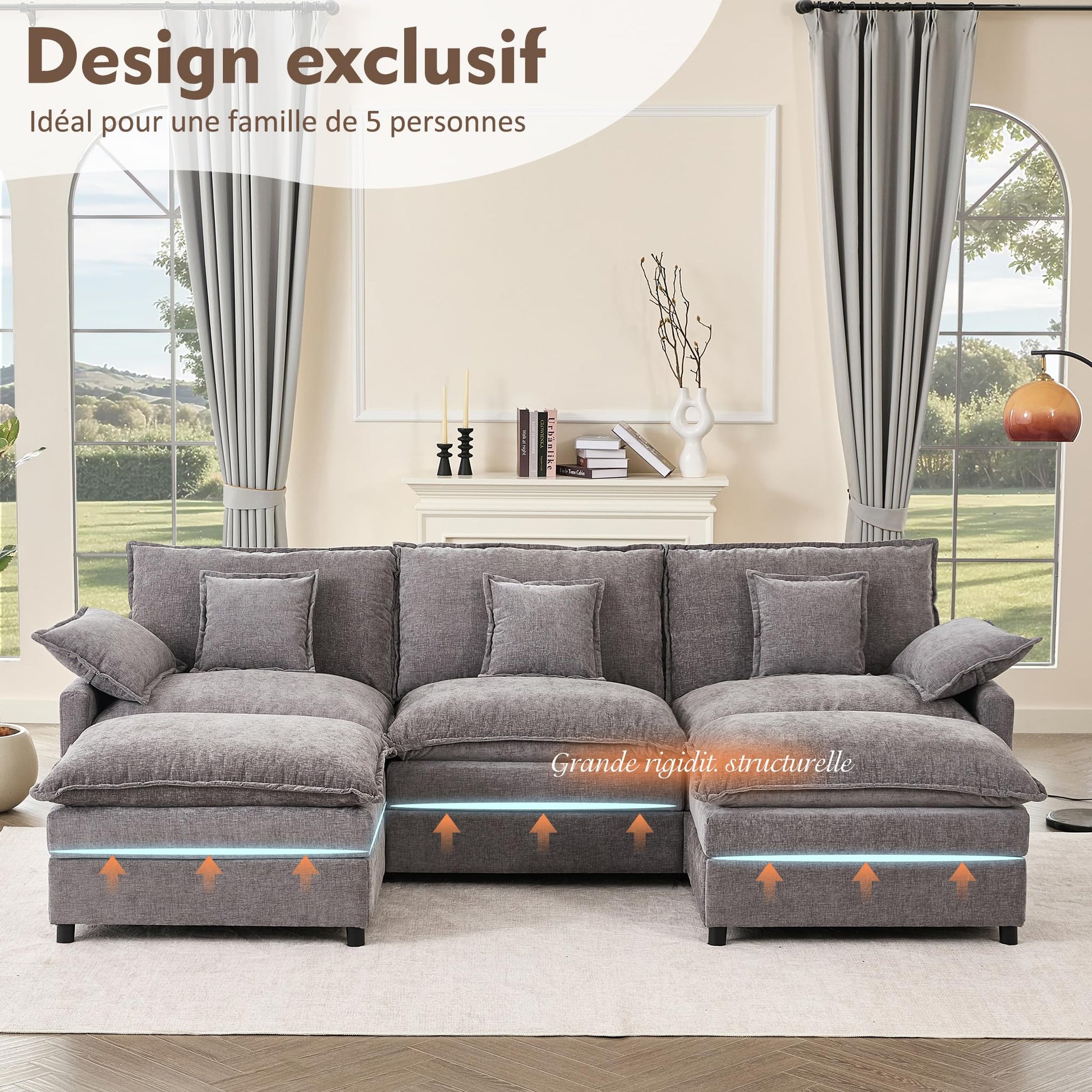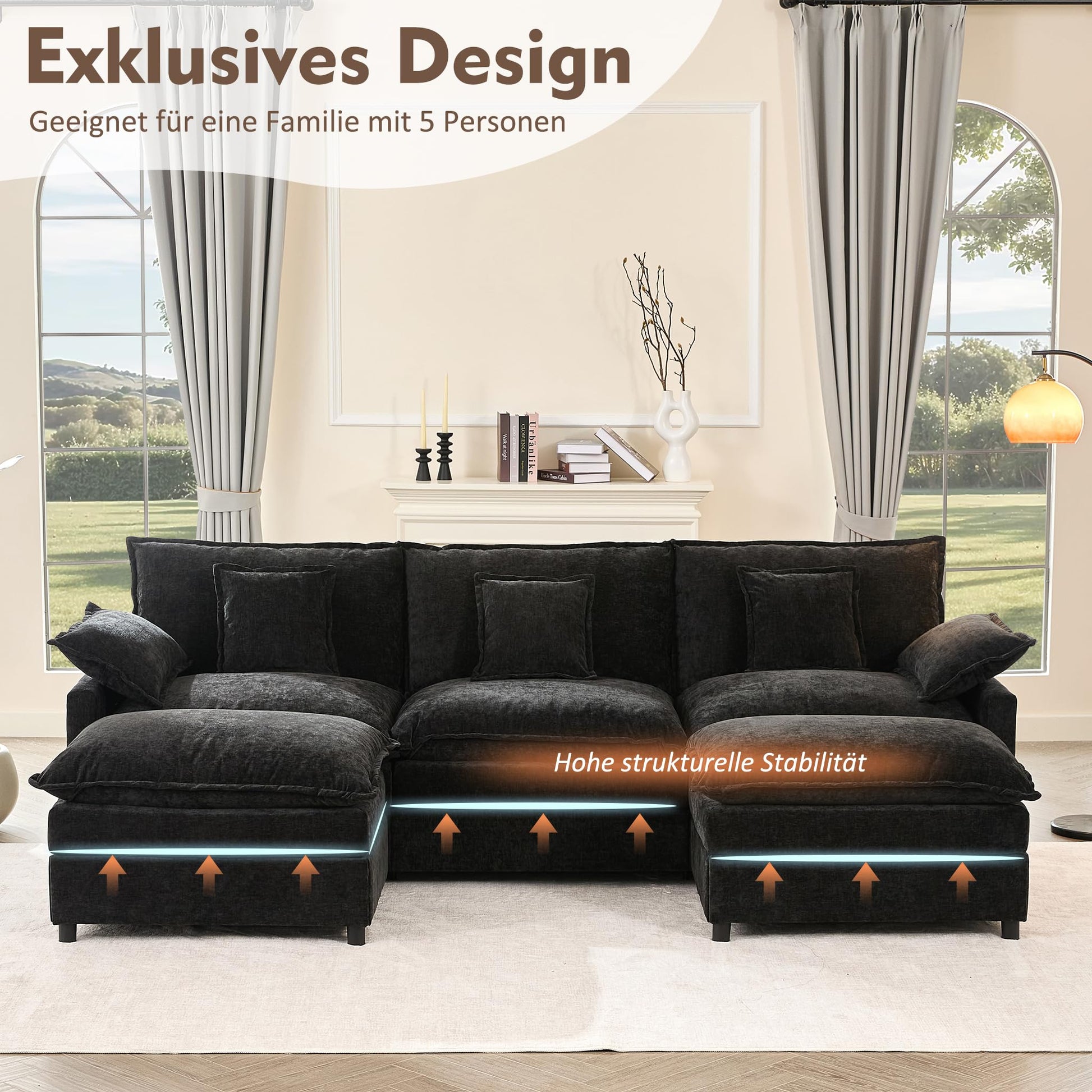 - Vielseitig einsetzbar: Diese U-förmige Wohnlandschaft passt sich flexibel verschiedenen Räumen an – ob Wohnzimmer, Wohnung, Schlafzimmer, Gästezimmer oder Kinderbereich. Die großzügig gepolsterte Fläche bietet einen gemütlichen Ort zum Entspannen, Lesen oder Spielen und macht das Sofa zu einem multifunktionalen Möbelstück für die ganze Familie.