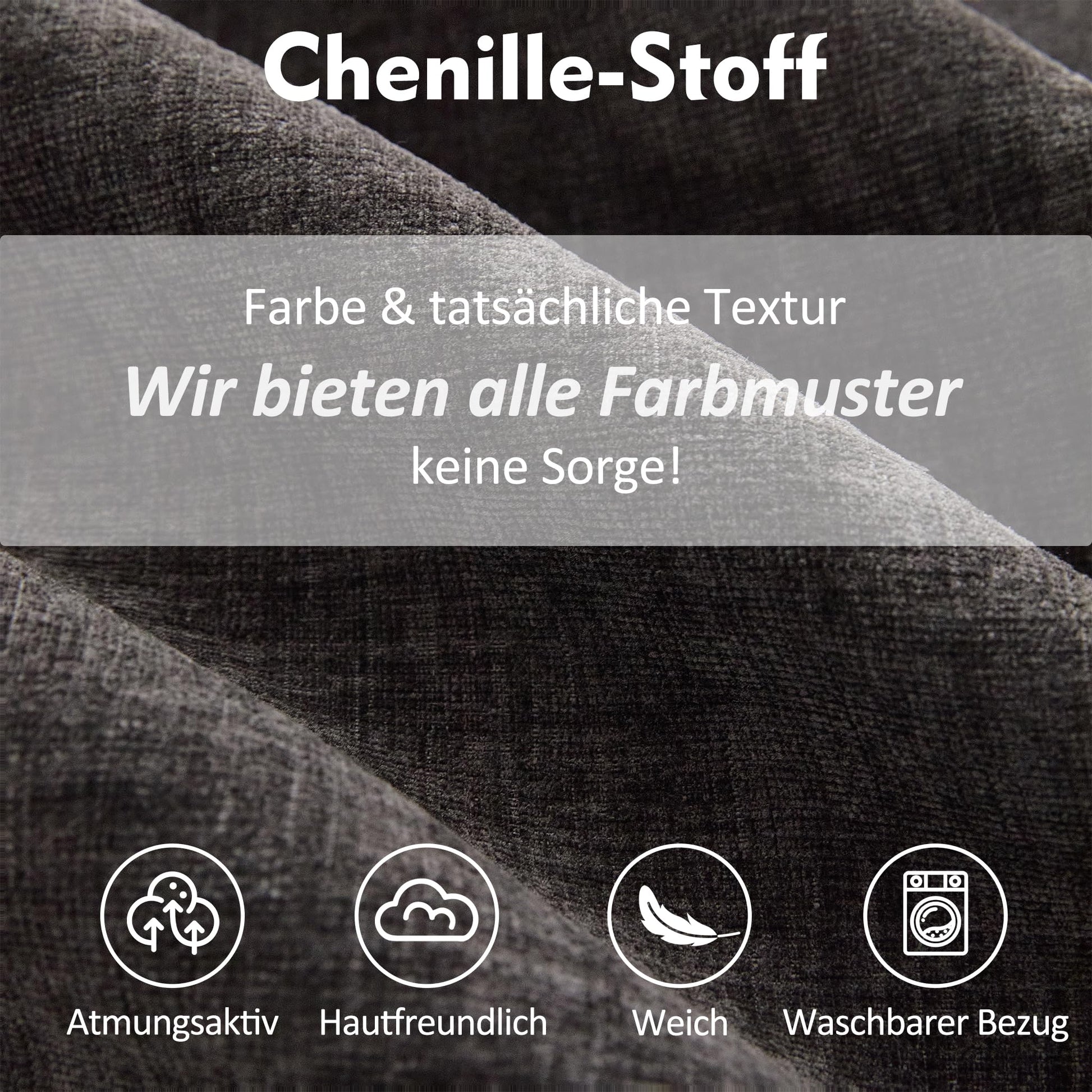 - Weicher Chenille-Stoff: Der Bezug aus weichem, flauschigem Chenille-Stoff kombiniert elegantes Design mit Alltagstauglichkeit. Das strapazierfähige Material ist maschinenwaschbar und trocknergeeignet. Seine glatte Oberfläche und der dezente Glanz harmonieren perfekt mit modernen Einrichtungsstilen – insbesondere im beliebten Cloud-Couch-Look. Kostenlose Stoffmuster in verschiedenen Farben helfen bei der Auswahl.