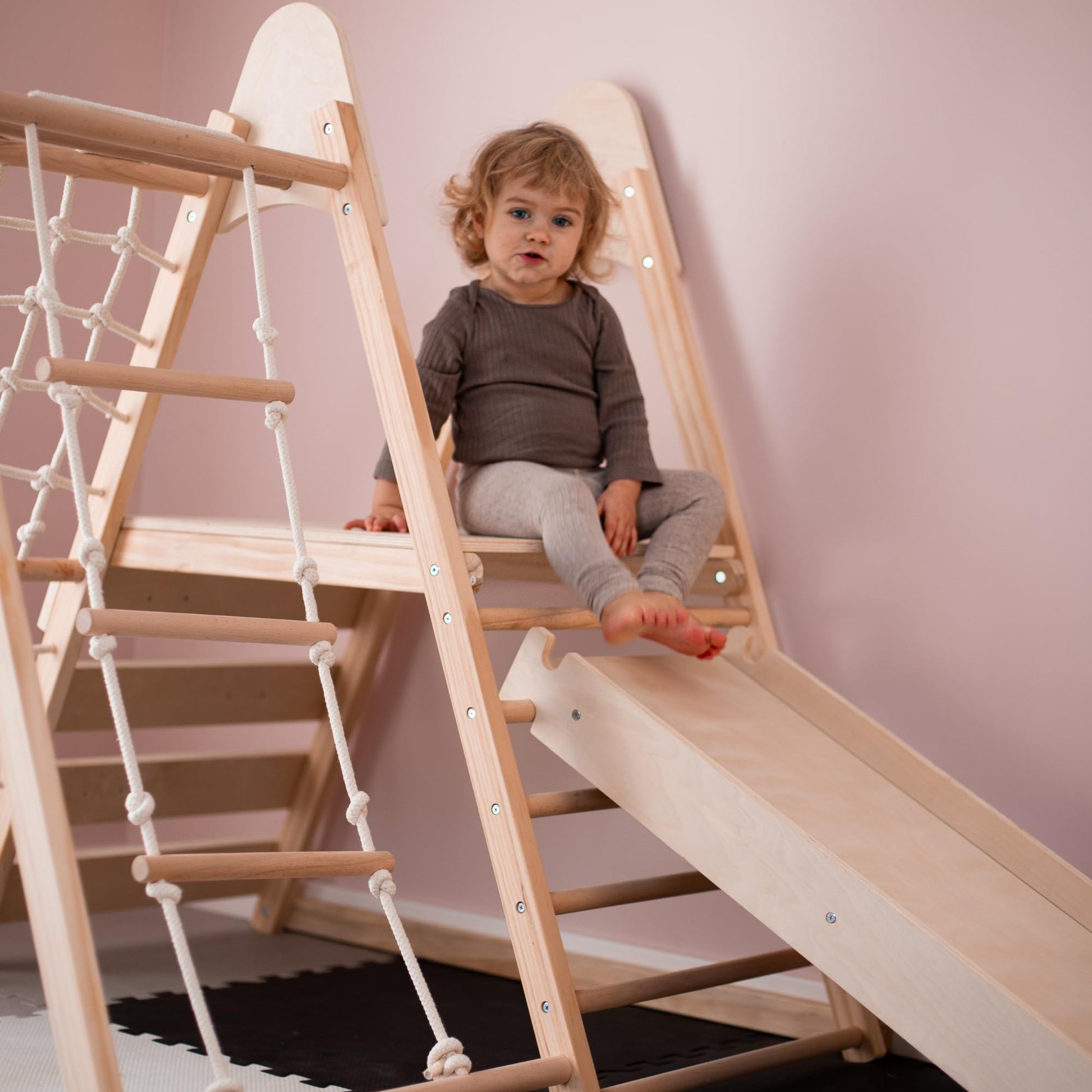 The 5-in-1 wooden playground is a dream come true for little climbing enthusiasts. Equipped with a climbing net, ladder, slide, climbing wall and swing, it quickly becomes the centre of home entertainment and allows your toddler to actively spend time in their room.