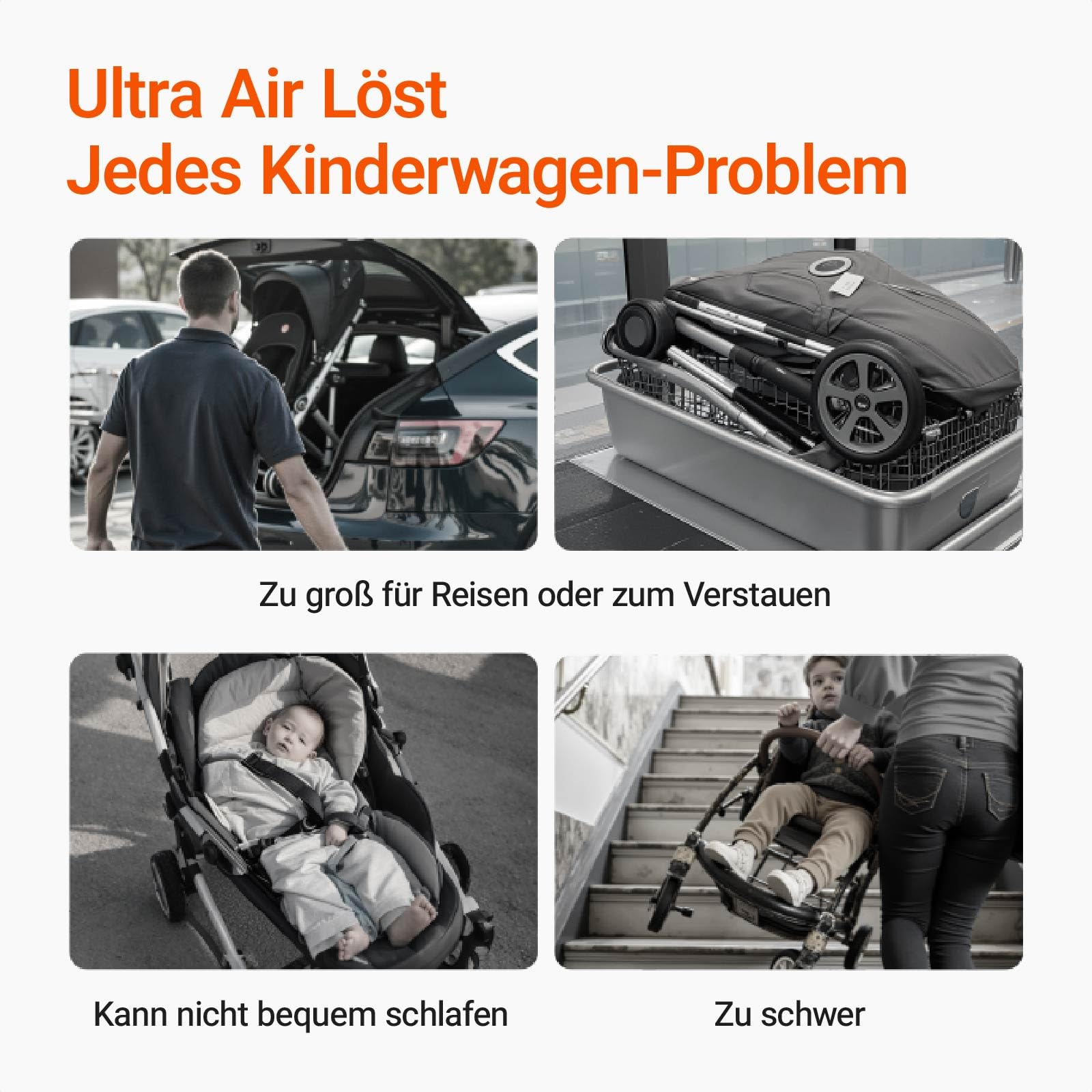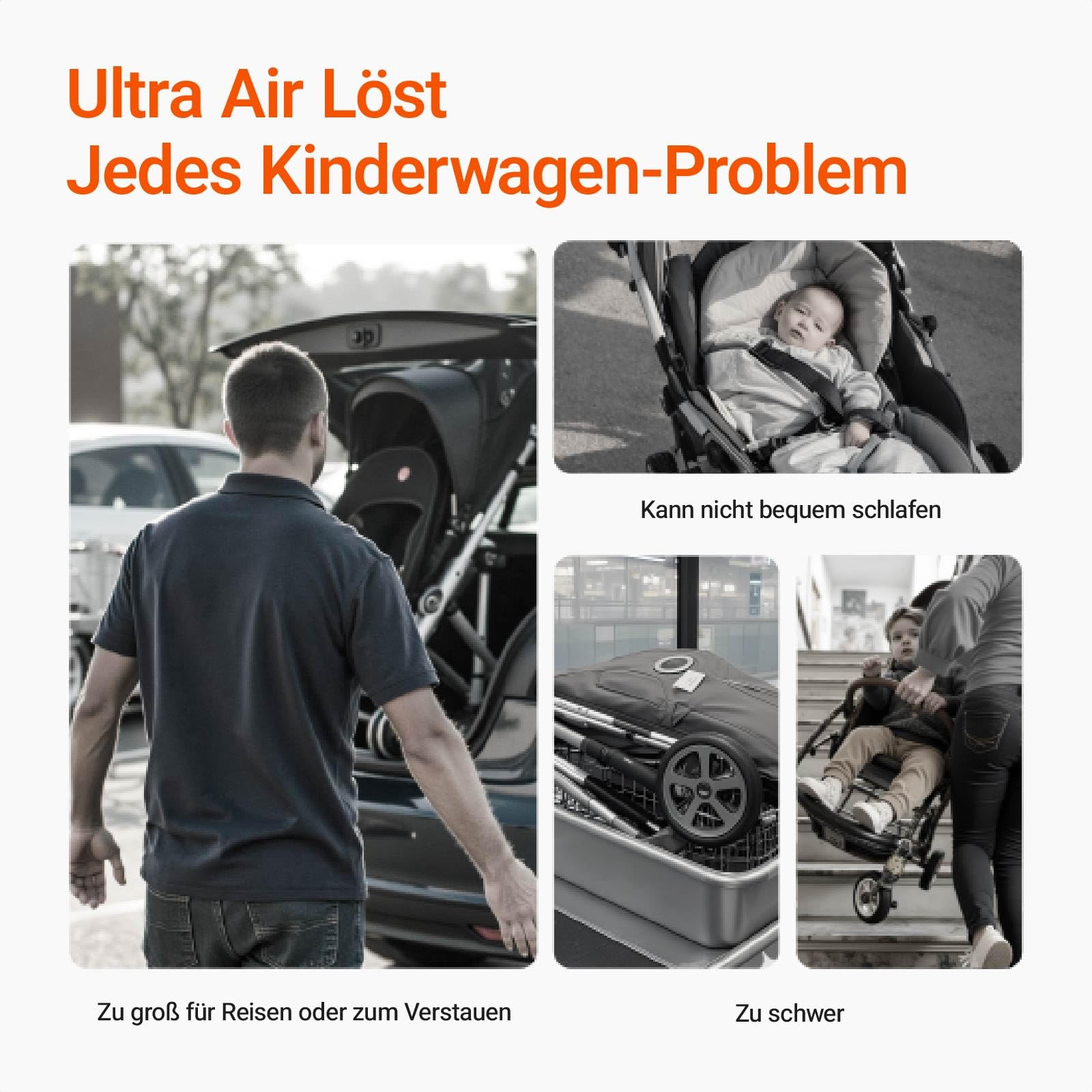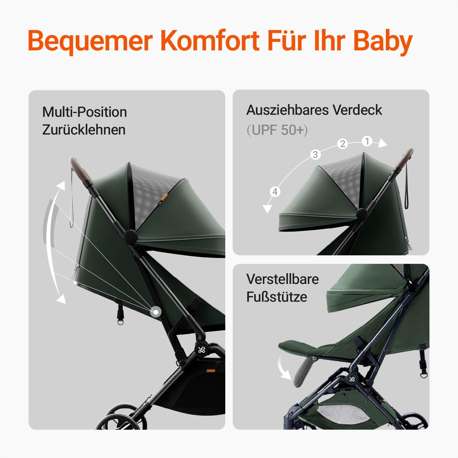 - Sun protection and comfort: The umbrella pram is equipped with a UV-protected hood that protects your baby from harmful sun rays and creates a comfortable shade area for your baby. The adjustable UPF 50+ tent can be easily adjusted to different viewing angles of the sun, so you can safely and comfortably practice outdoor activities at any time