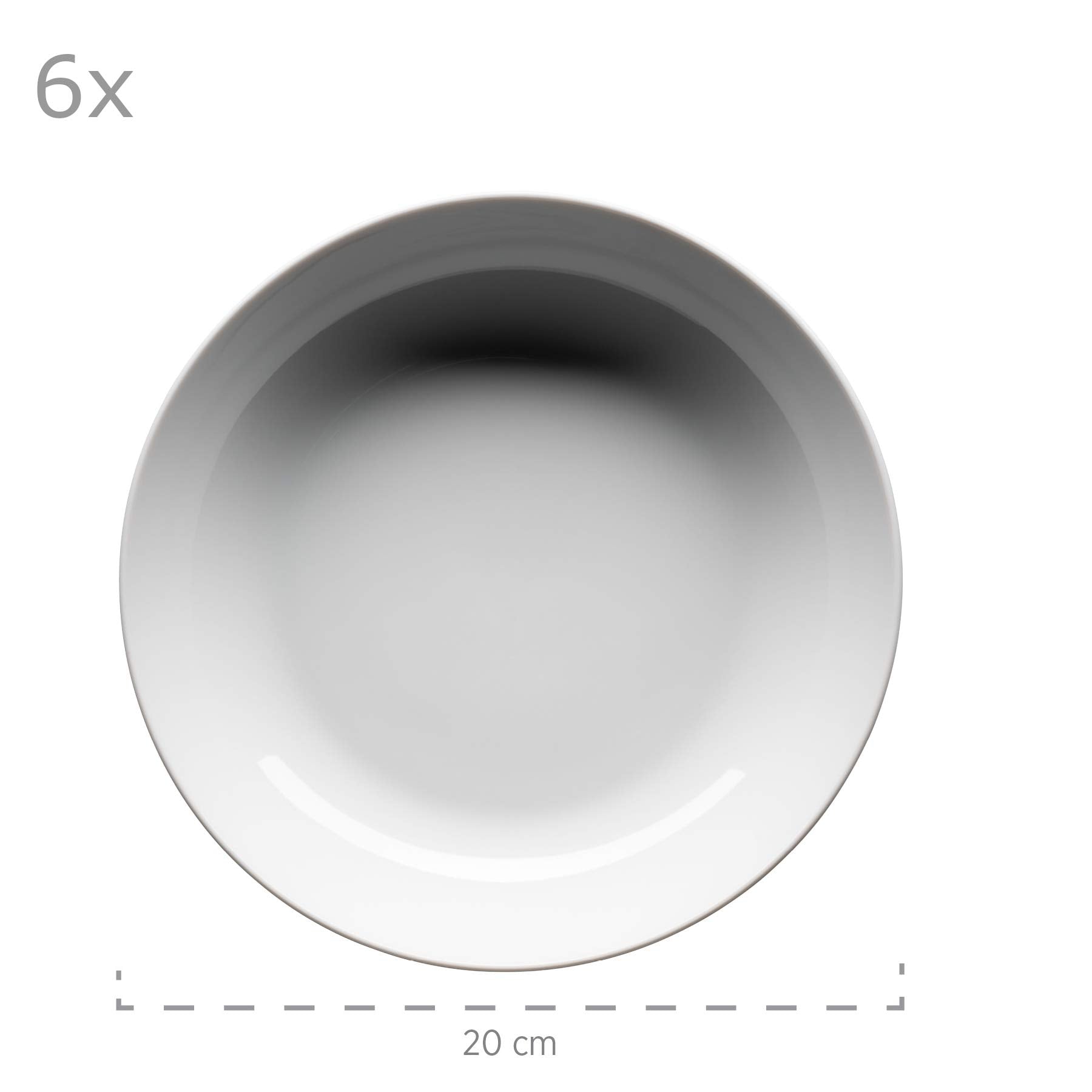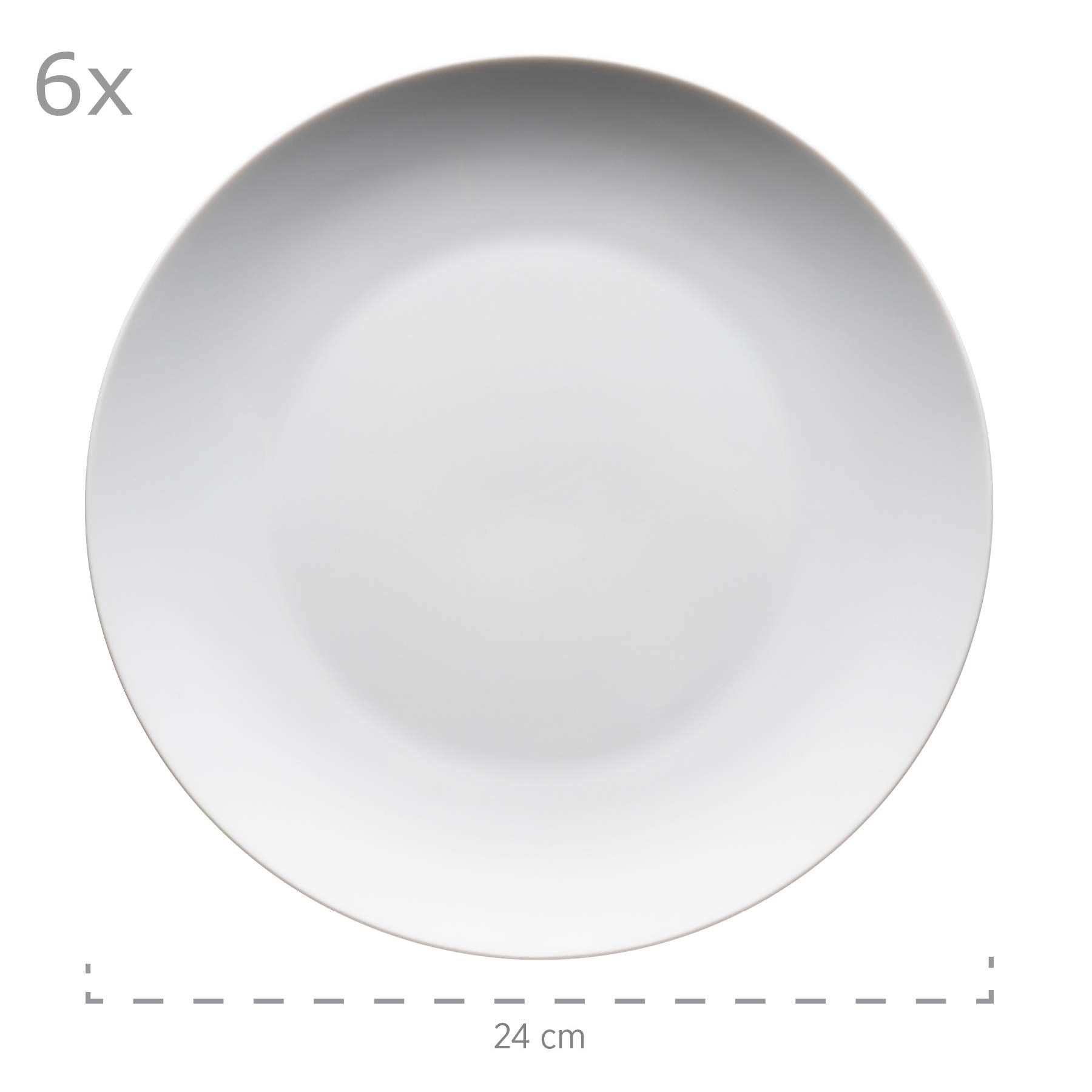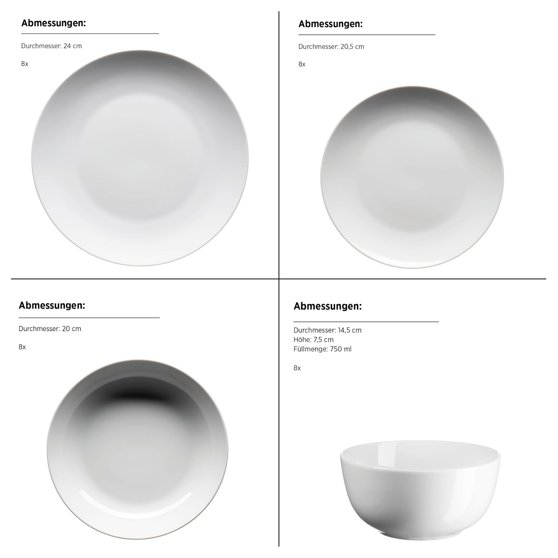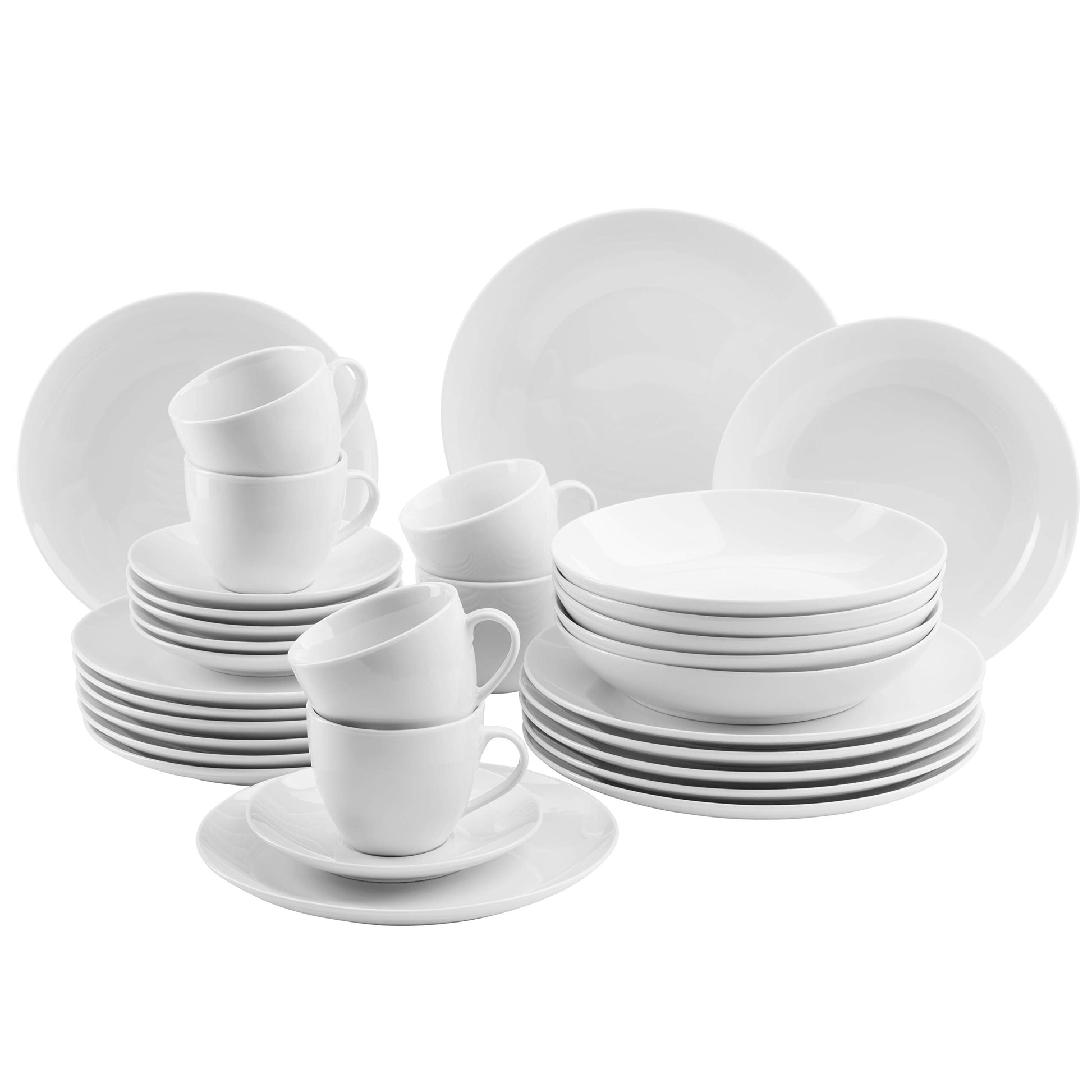 - Dieses 30-teilige Service Set für 6 Personen aus Porzellan in Weiß besteht aus 6x Essteller flach (Ø 24 cm), 6x Suppenteller tief (Ø 20 cm), 6x Dessertteller bzw. Frühstückteller (Ø 20,5 cm), 6x Müslischale (Ø 14,5 cm, 750 ml) und 6x große Kaffeetasse (290 ml)