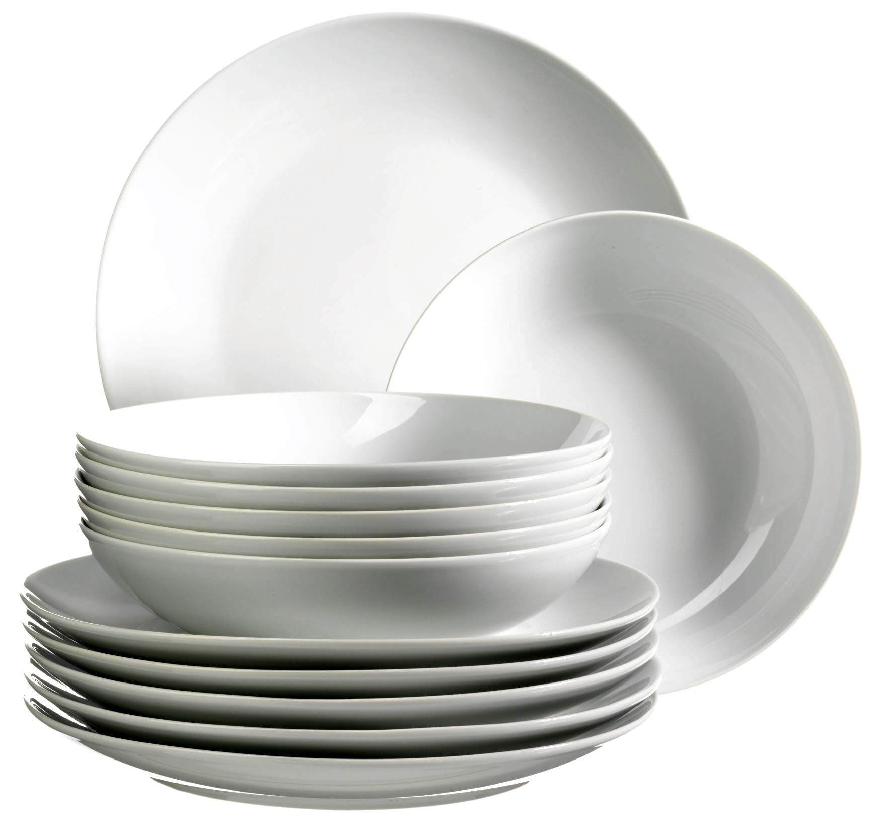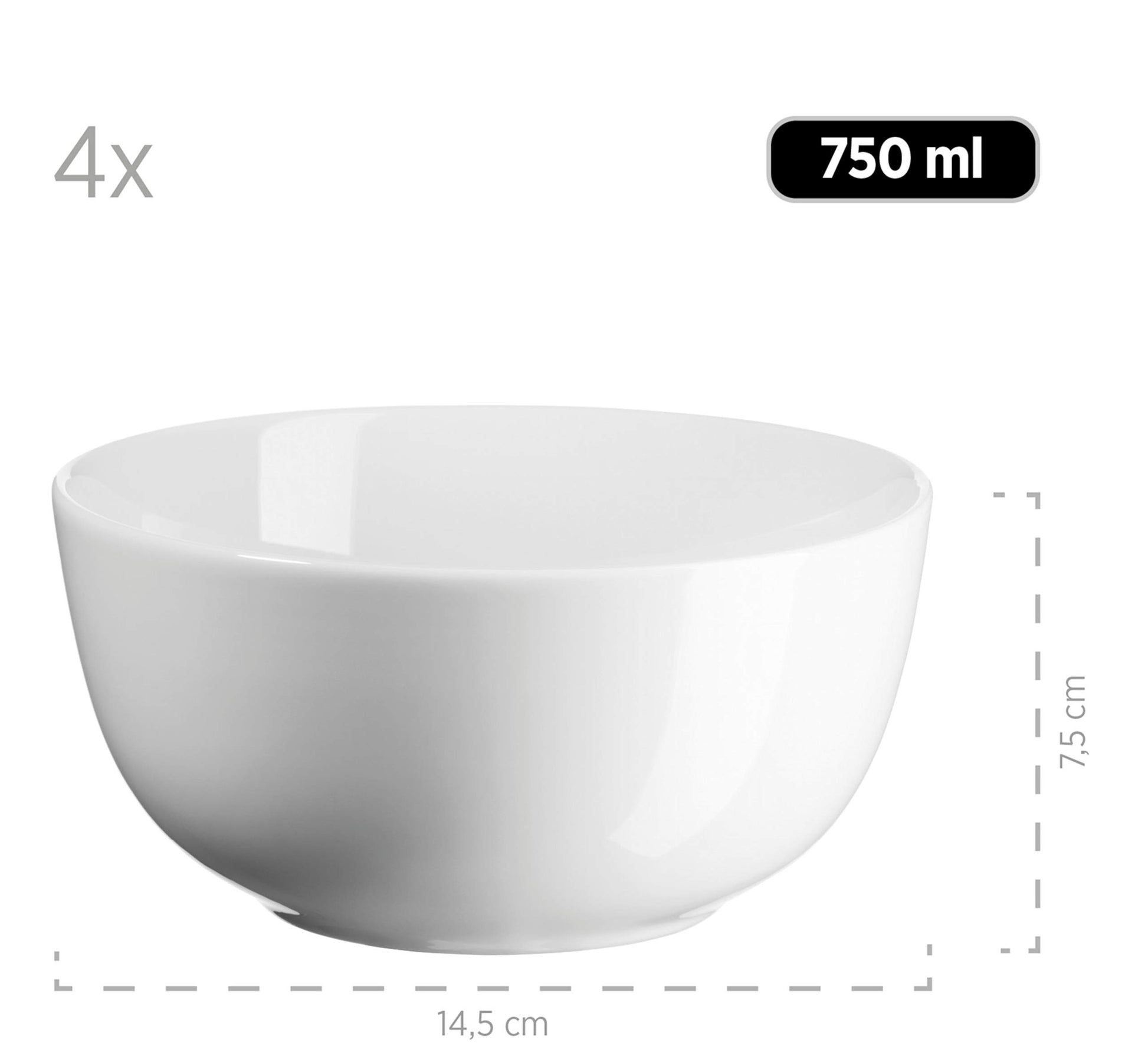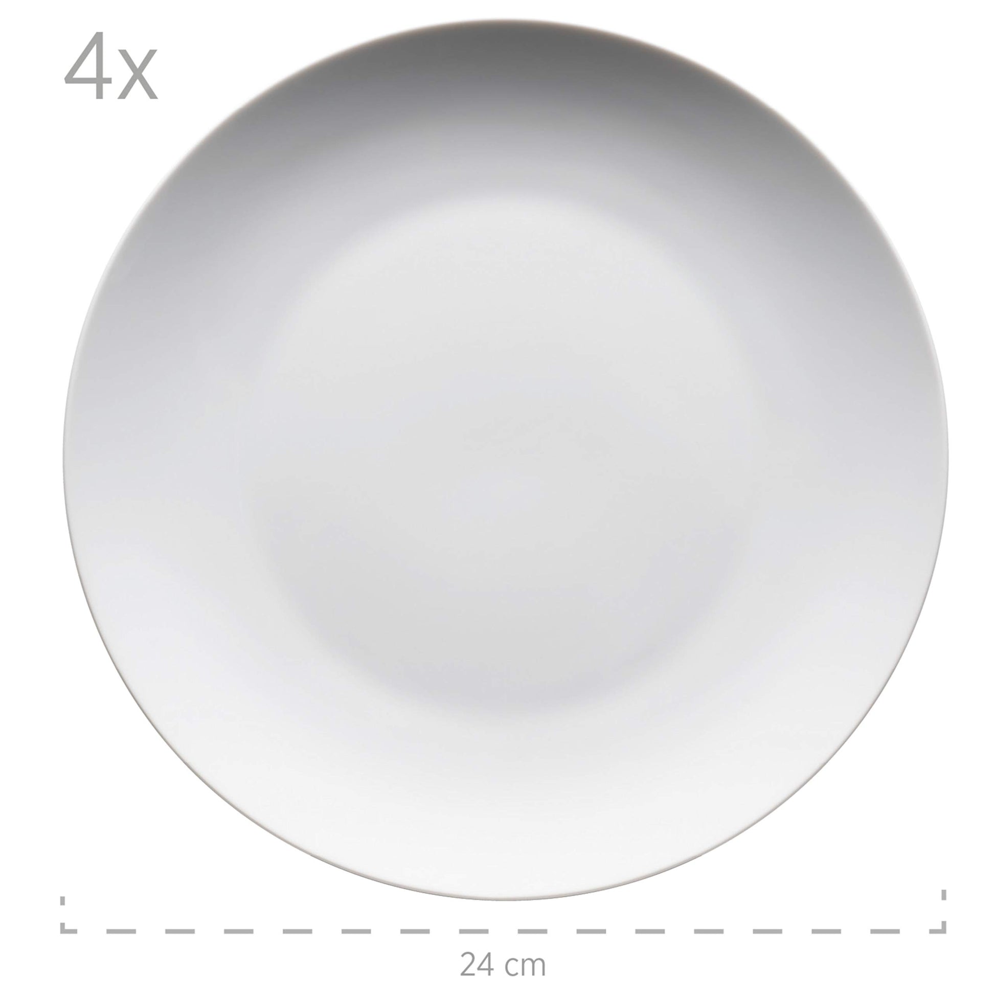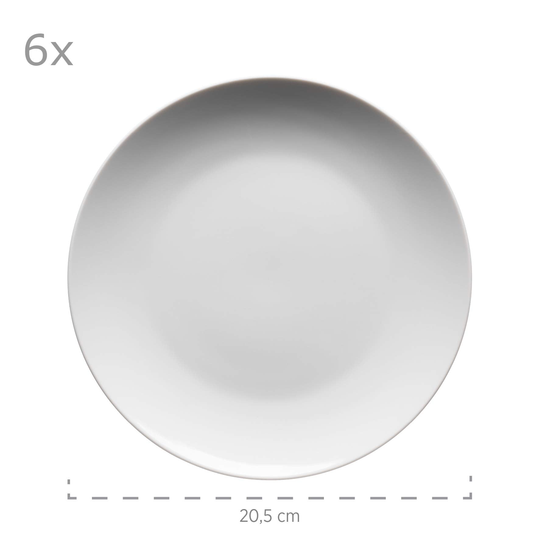 - Dieses 30-teilige Service Set für 6 Personen aus Porzellan in Weiß besteht aus 6x Essteller flach (Ø 24 cm), 6x Suppenteller tief (Ø 20 cm), 6x Dessertteller bzw. Frühstückteller (Ø 20,5 cm), 6x Müslischale (Ø 14,5 cm, 750 ml) und 6x große Kaffeetasse (290 ml)