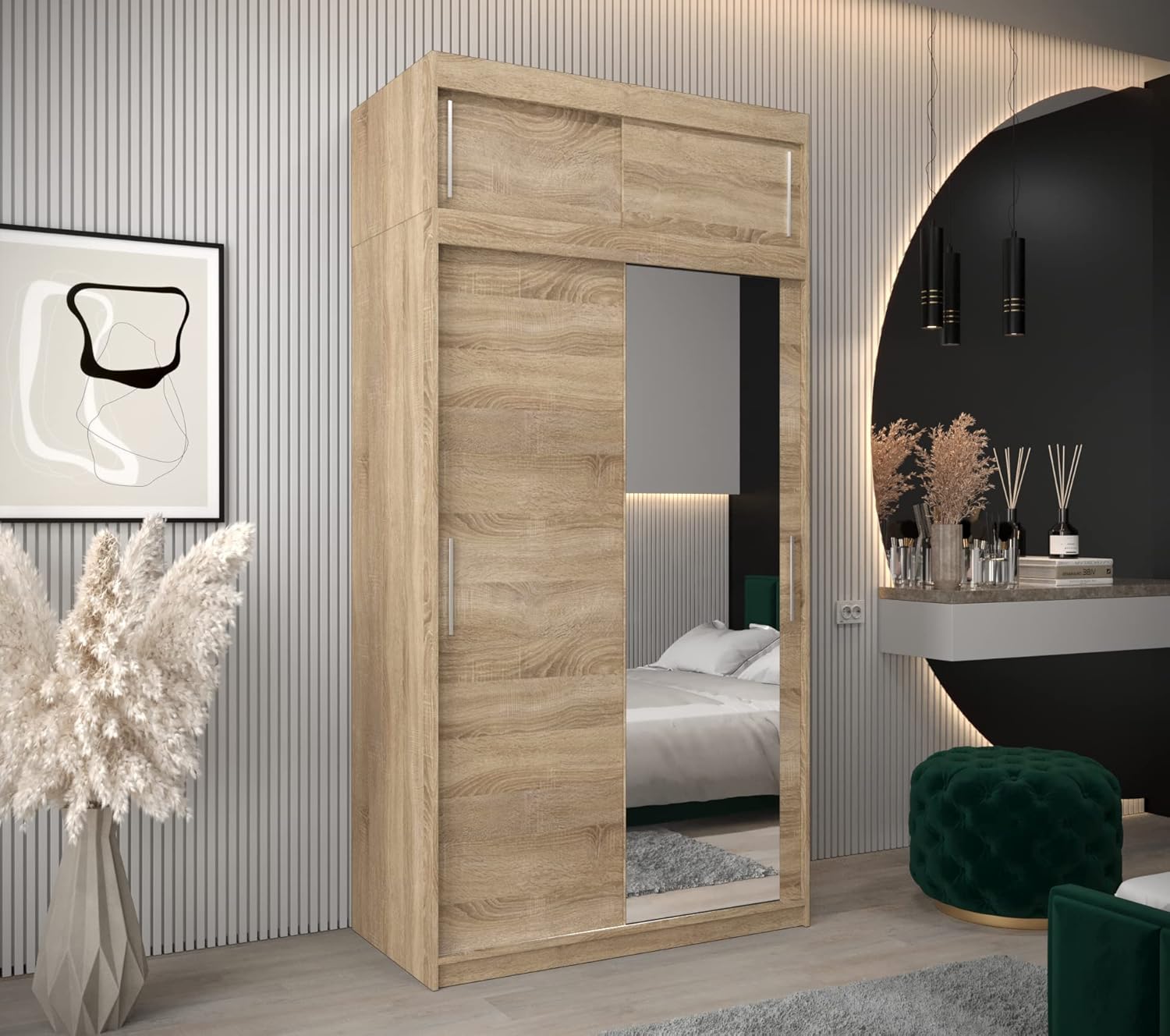 - Langlebige Materialien: Der Kleiderschrank mit Schiebetüren (Garderobe) besteht aus 16 mm dickem, massivem Laminat, während die Kanten sorgfältig mit langlebigem und beschädigungsbeständigem 0,5 mm starkem PVC-Furnier versehen wurden. Die Vorderseite ist mit einem polierten Spiegel versehen und die Griffe sind aus Kunststoff. Der Wohnzimmerschrank ist mit Schiebetüren auf Aluminiumschienen ausgestattet.