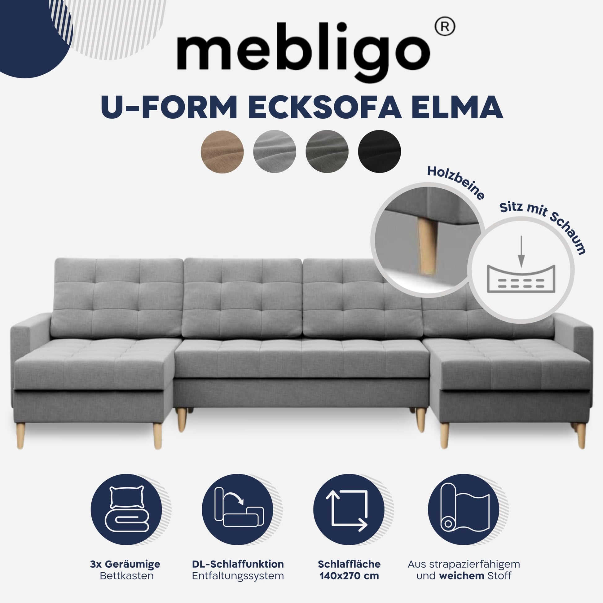 Mebligo - Elma Corner Sofa with Sleep Function and Bed Box (light grey)