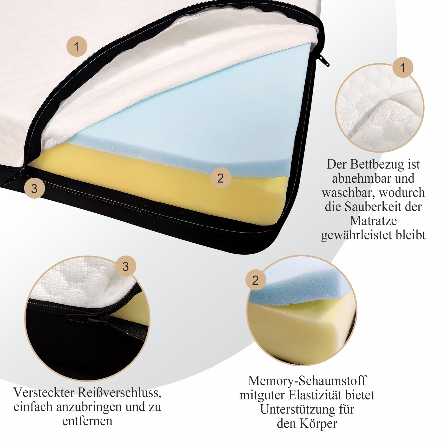 - Our Memory Matratzen mattresses measuring 180 x 200 x 20 cm are known for their excellent support and durability. The H3 hardness of the mattress provides a stable foundation that can withstand a lot of body weight without losing its shape. The fast spring back also ensures that the mattress retains its good quality even over a long period of time and is therefore sufficiently firm. The mattress topper is essential for a restful sleep and does an excellent job of supporting seven areas of the body, giving you a high-quality and restful sleeping experience.