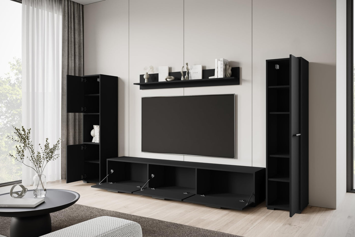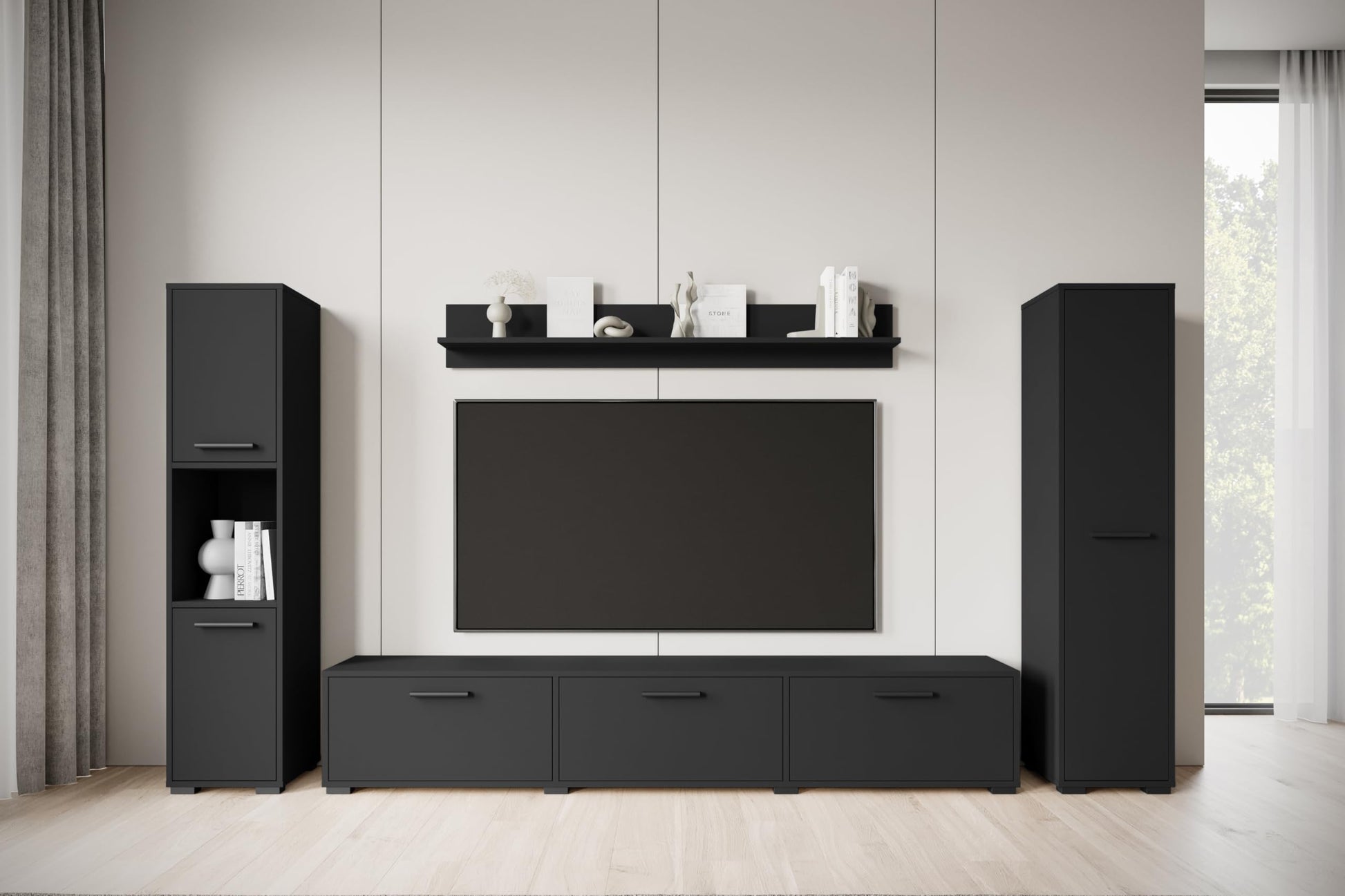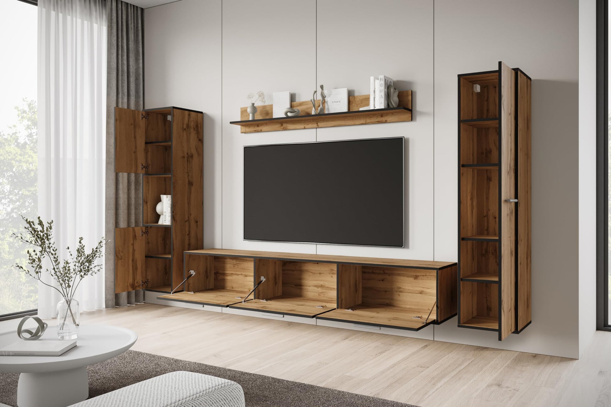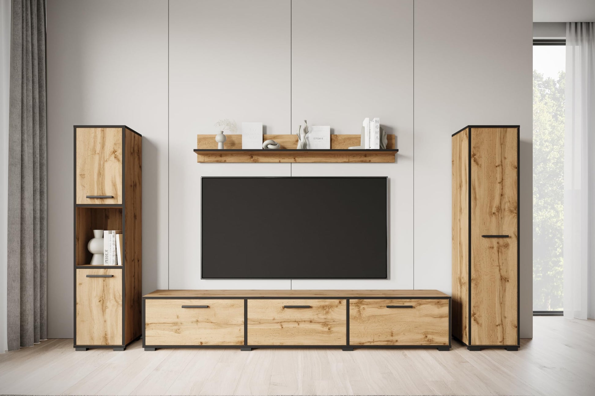 MINIO go for it - Living Room Wall Unit 4-Piece Toga, Living Room Furniture Set, 1x TV Lowboard, 2x Tall Cabinet, 1x Wall Board, Living Room Furniture Complete, Living Room Set - Colour Wotan Oak