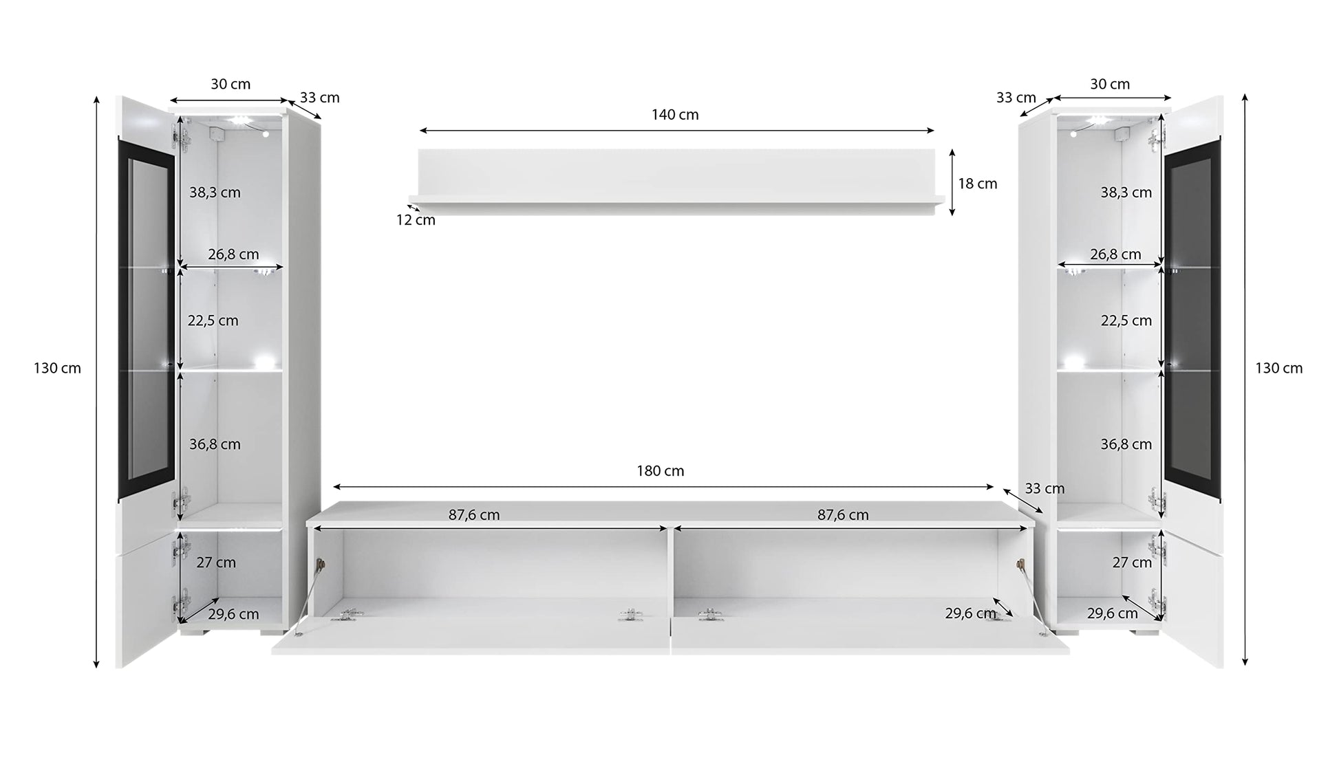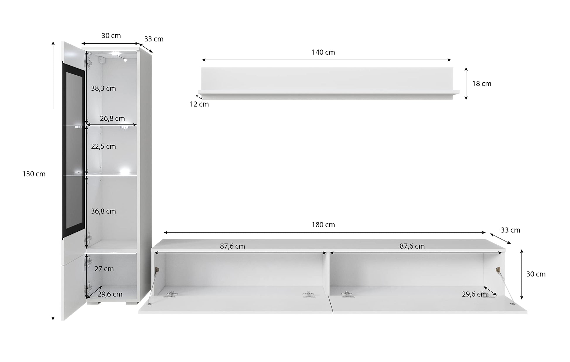 - Dimensions: 2 x tall display cabinet: Width 30 cm x height 130 x depth 33 cm. Lowboard: Width 180 cm x height 30 x depth 31 cm wall cabinet, long: Width 140 cm x height 18 x depth 12 cm. In our range you will find this product in many colours and with LED lighting.