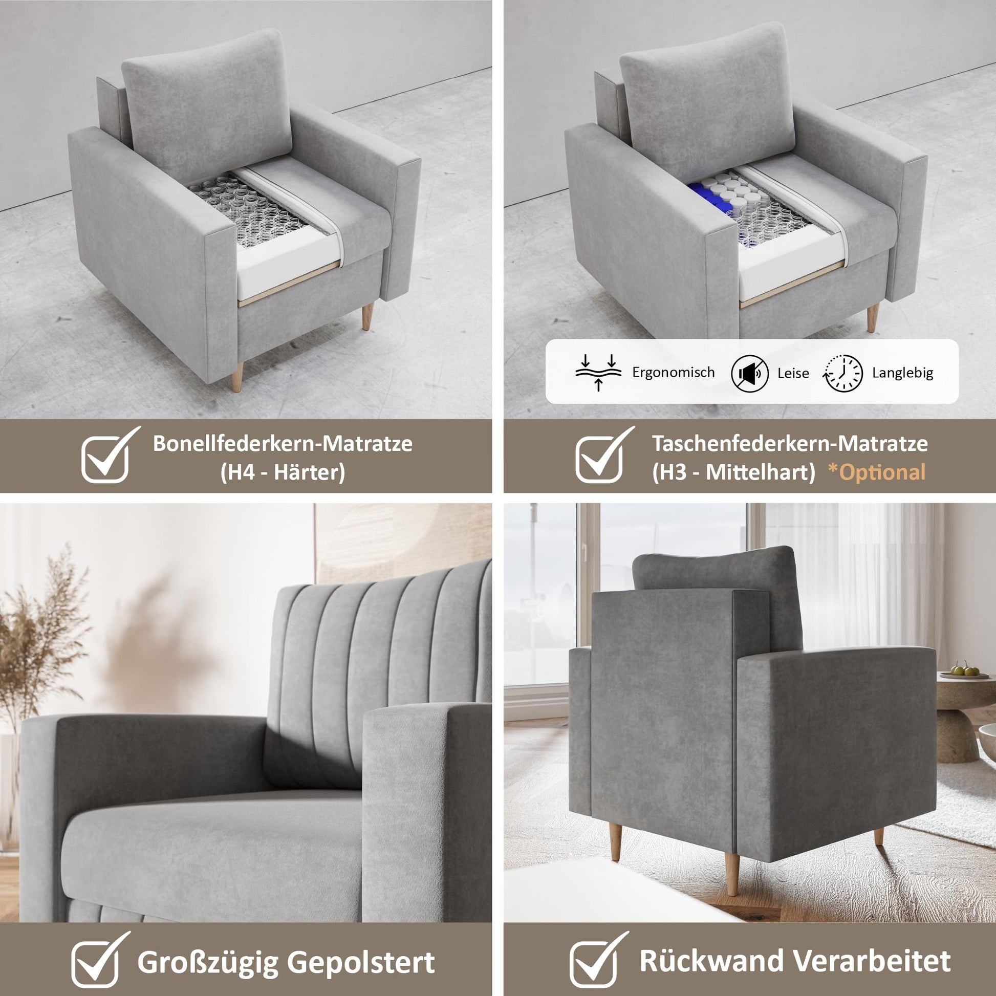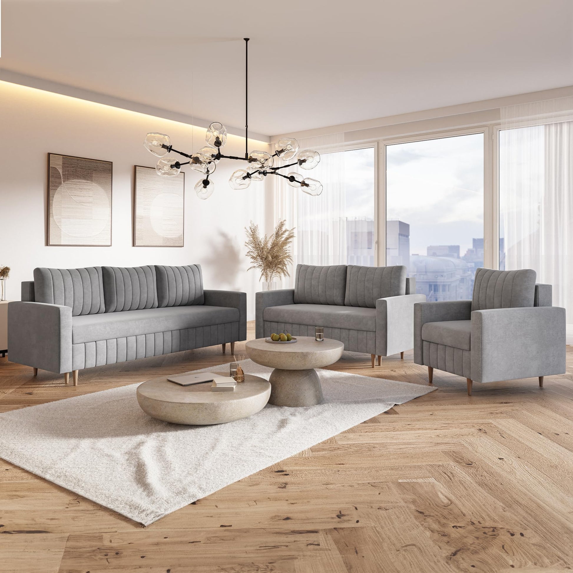 MOTIVENA Leo Sofa Set, Sofa Set 3 2 1 Living Room, Sofa 3 2 1 Set, Couch Set, Futon Set, Living Room Couch Set, Couch 3 2 1 Set, Bonell Spring Core (H4), Velvet, Grey Light Grey