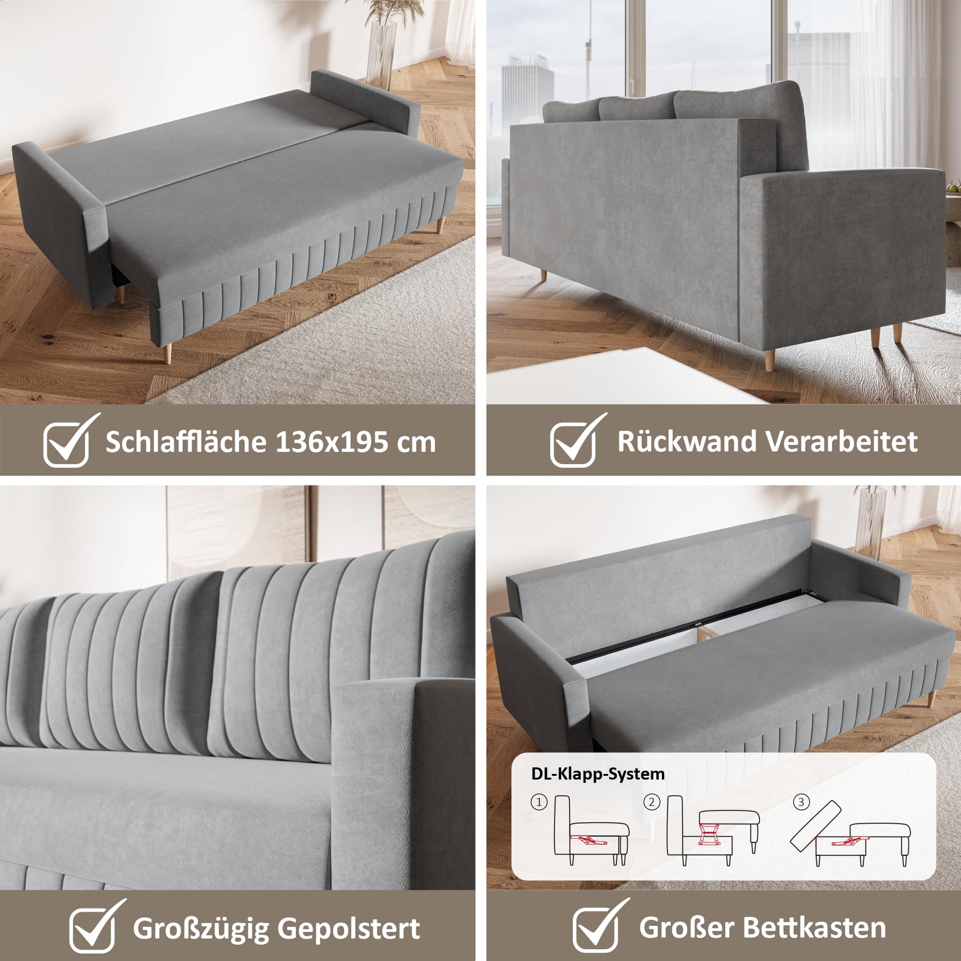 - Relaxing sleep for guests – the benches, both and backrests are made with a high-quality spring core and offer guests a restful and balanced sleep when unfolded. The sofa 3 seater and 2 seater set is available with pocket spring mattress (H3 - medium hard) and Bonell spring mattress (H4 - hardener)