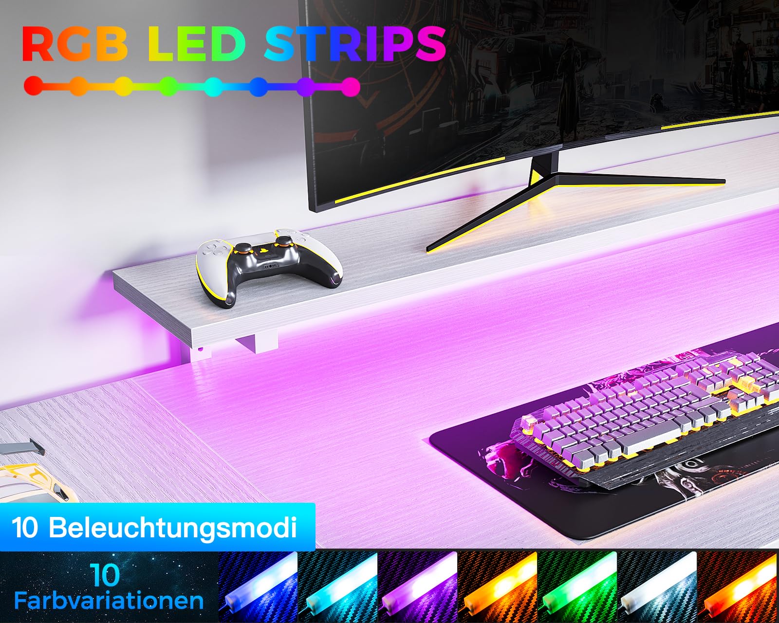 - U-desk with LED lights: This desk is equipped with LED lighting with 10 colours and 10 lighting modes to create an immersive gaming atmosphere. It has a memory function that ensures that the LED lights remain in the last mode when switched on. Customise your room and create an immersive gaming atmosphere.