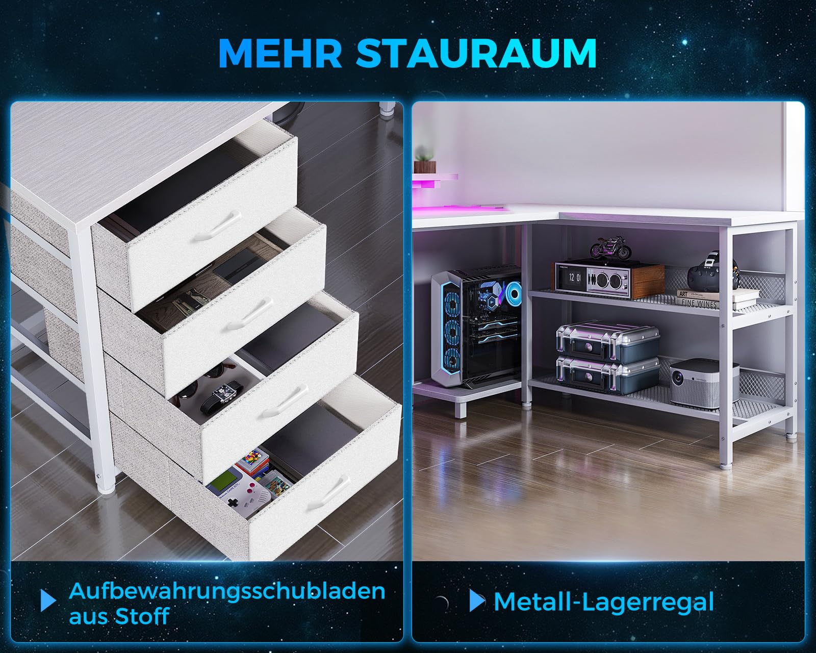 ODK Corner Desk with 4 Drawers and Storage Space, 167 x 102 cm Reversible Corner Desk with 2 Sockets and 2 USB Charging Ports, Gaming Desk with LED and Monitor Stand for Home Office, Black
