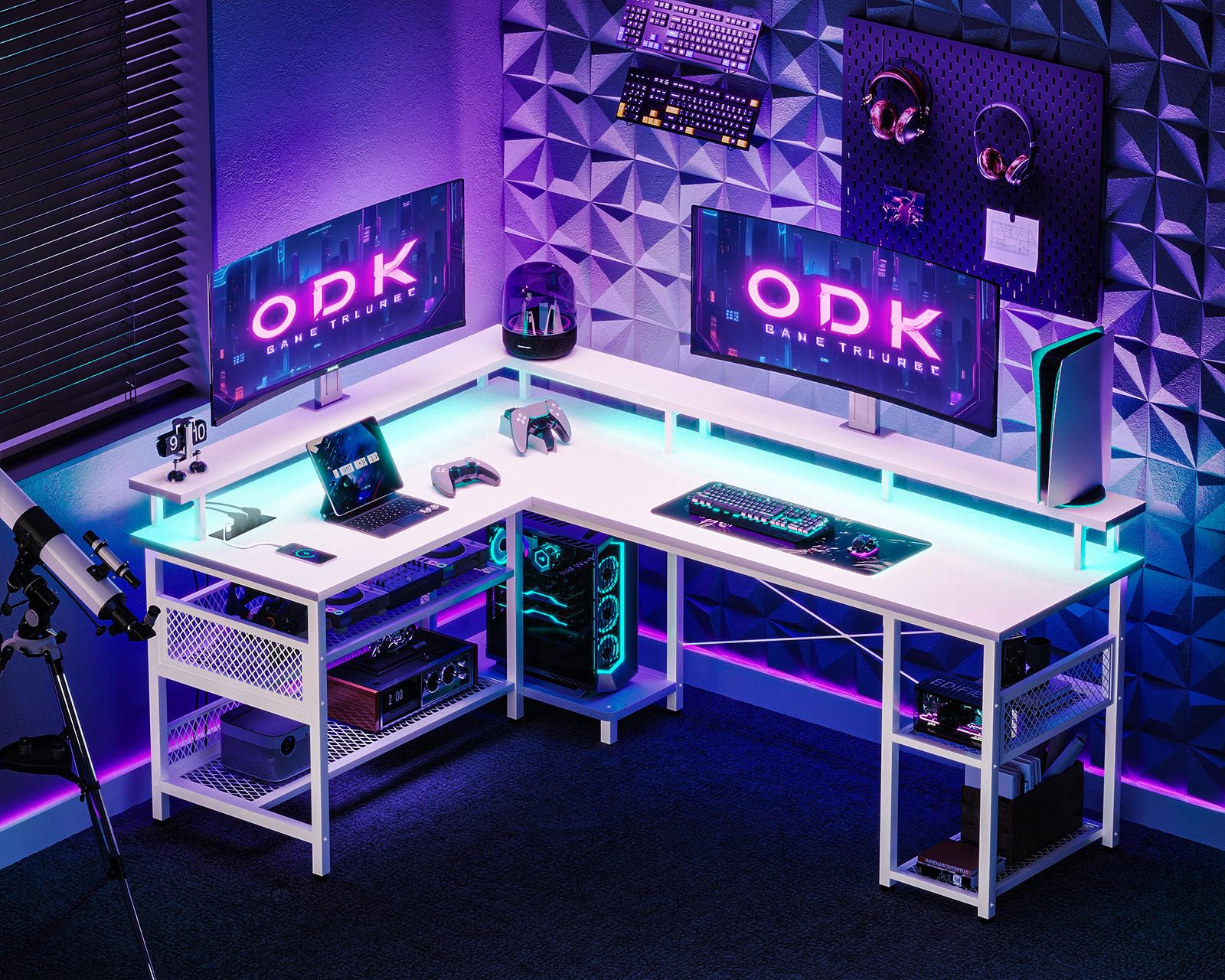 ODK Gaming Table with LED, Reversible Gaming Desk with 2 Sockets and 2 USB Charging Ports, Large Corner Desk with Mesh Shelf, Carbon Fibre Black, 168 x 120 cm