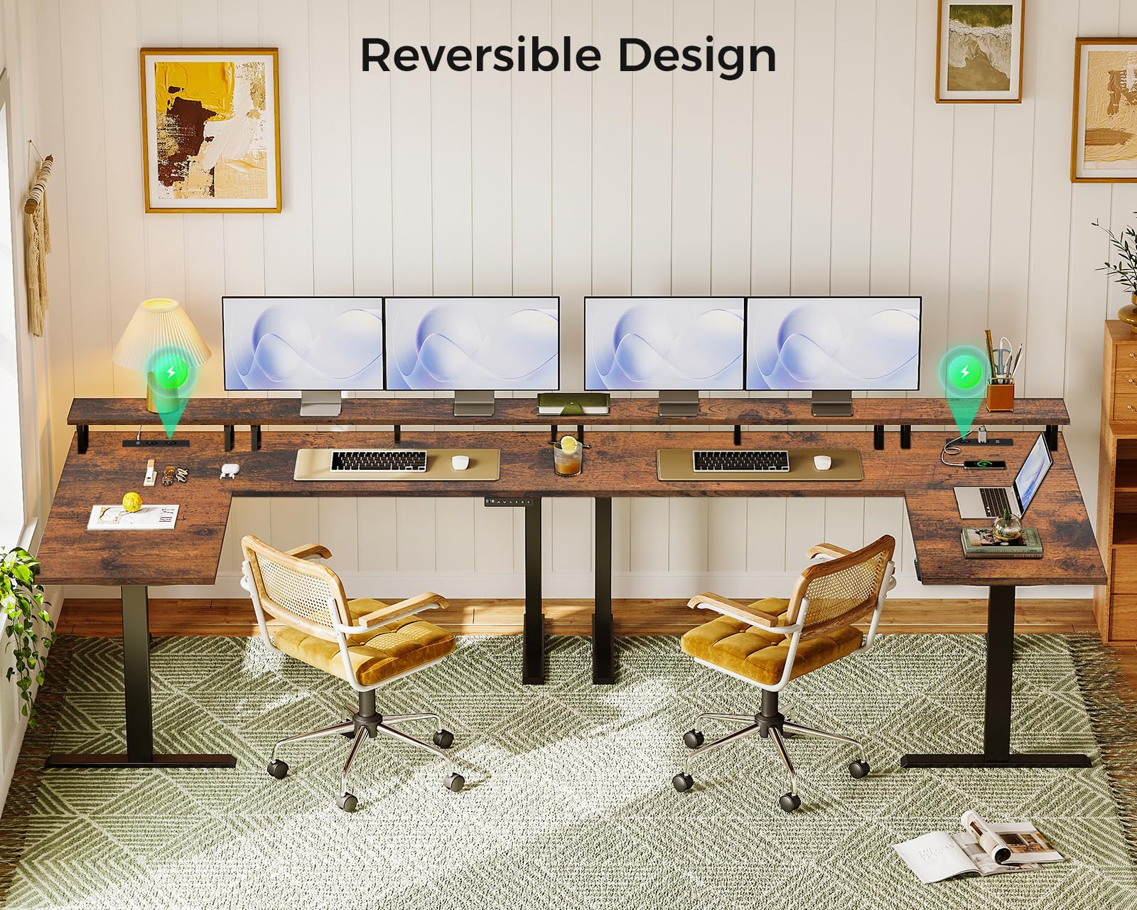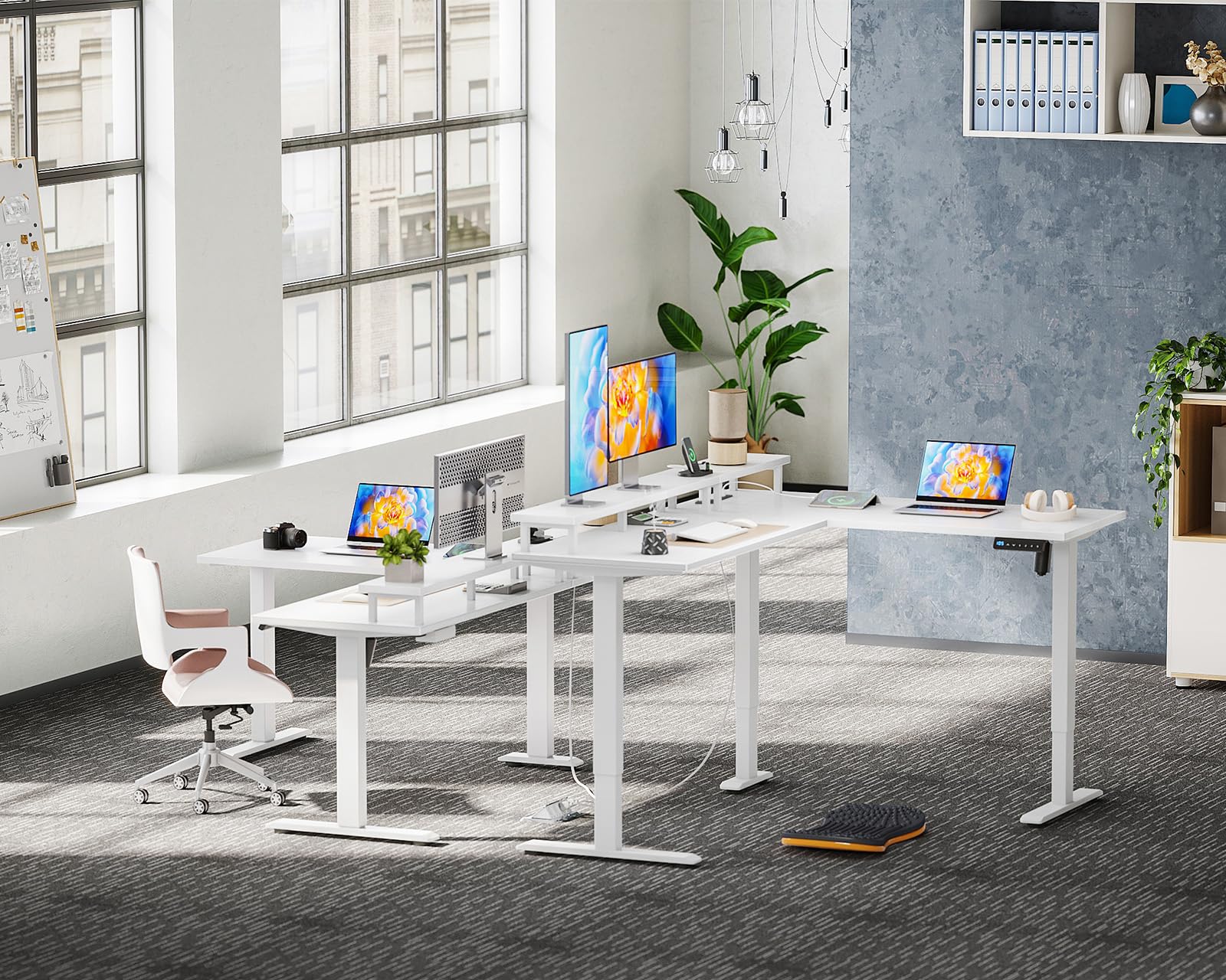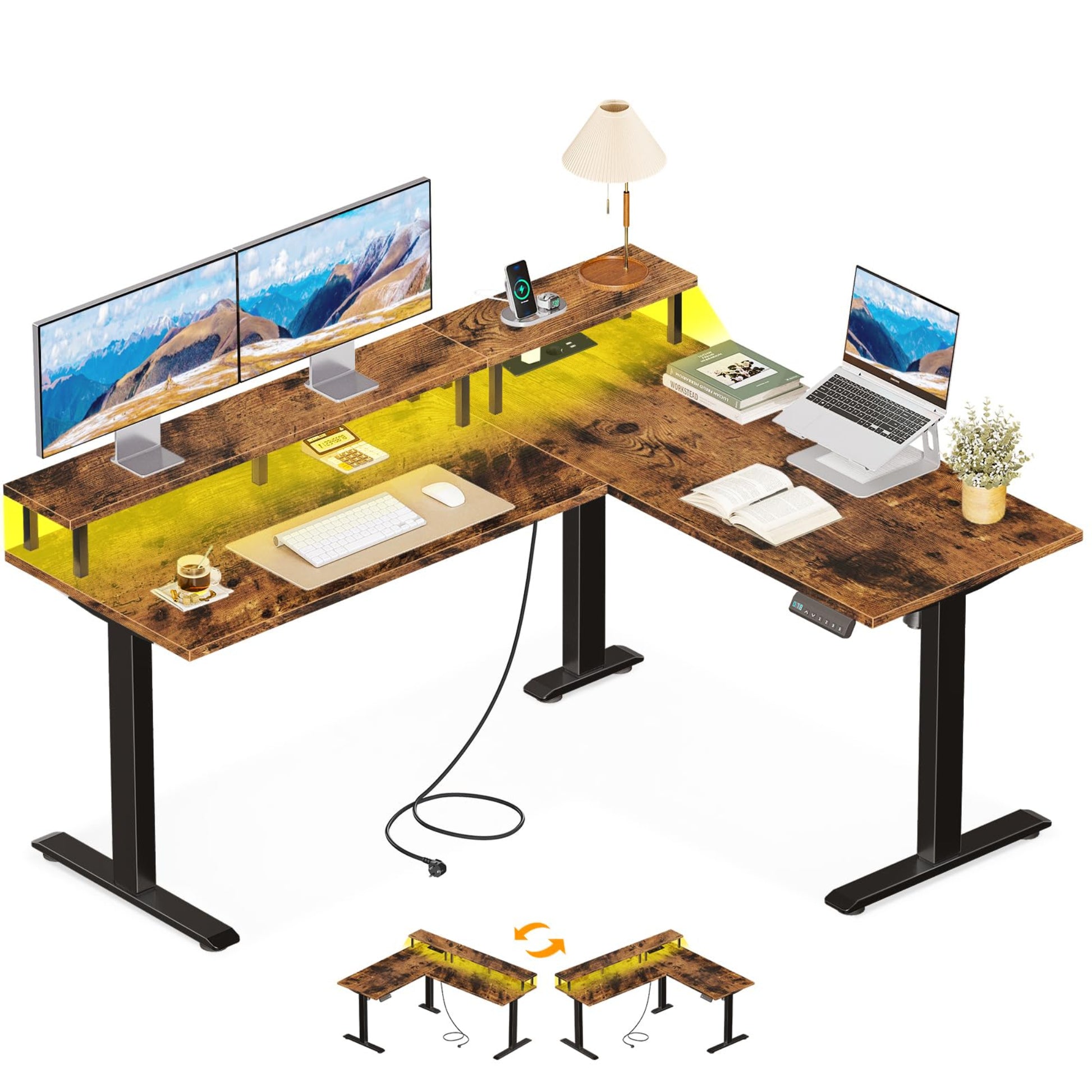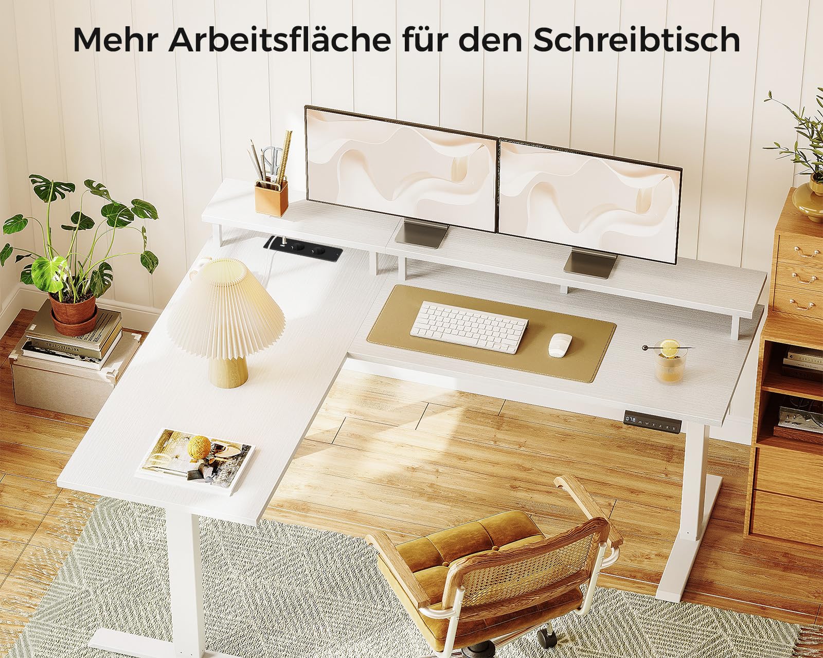 - Large desk L shape and flexible divider design: the electric desk is equipped with a 150 cm long L-shaped monitor stand. The left and right sides can be installed reversibly depending on the room layout. Combine work and leisure in one room and increase efficiency and comfort. This office desk makes perfect use of corners, saves space while remaining practical.