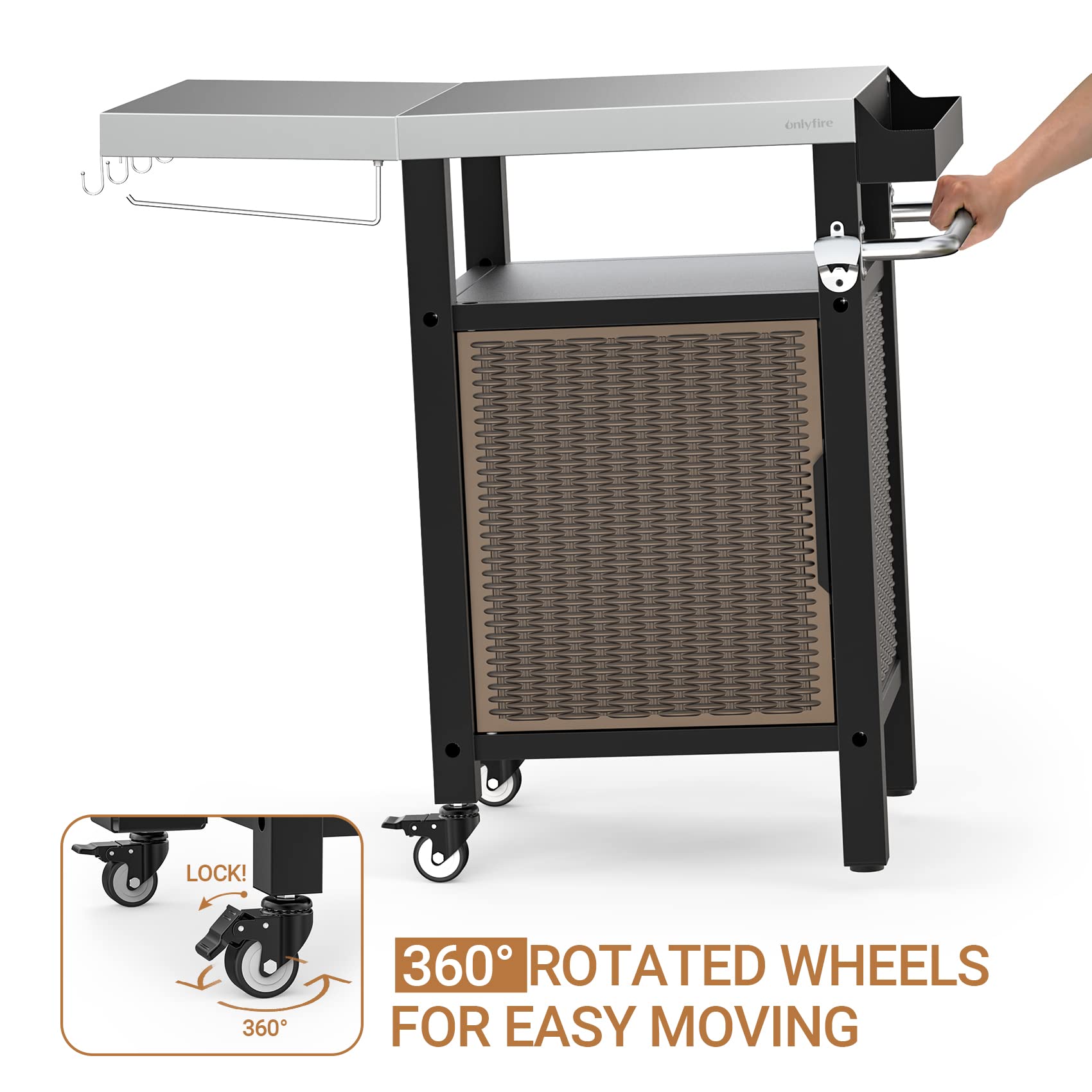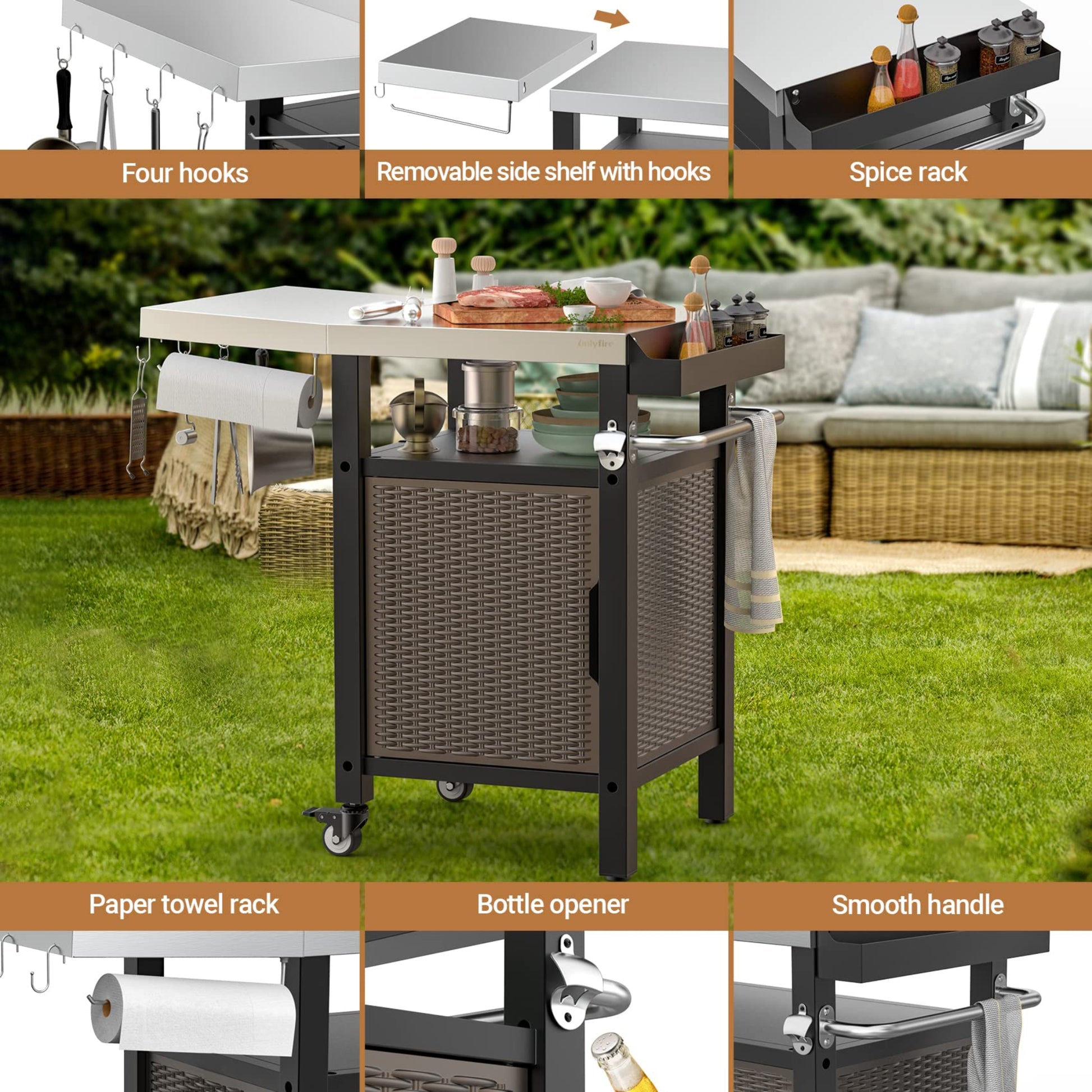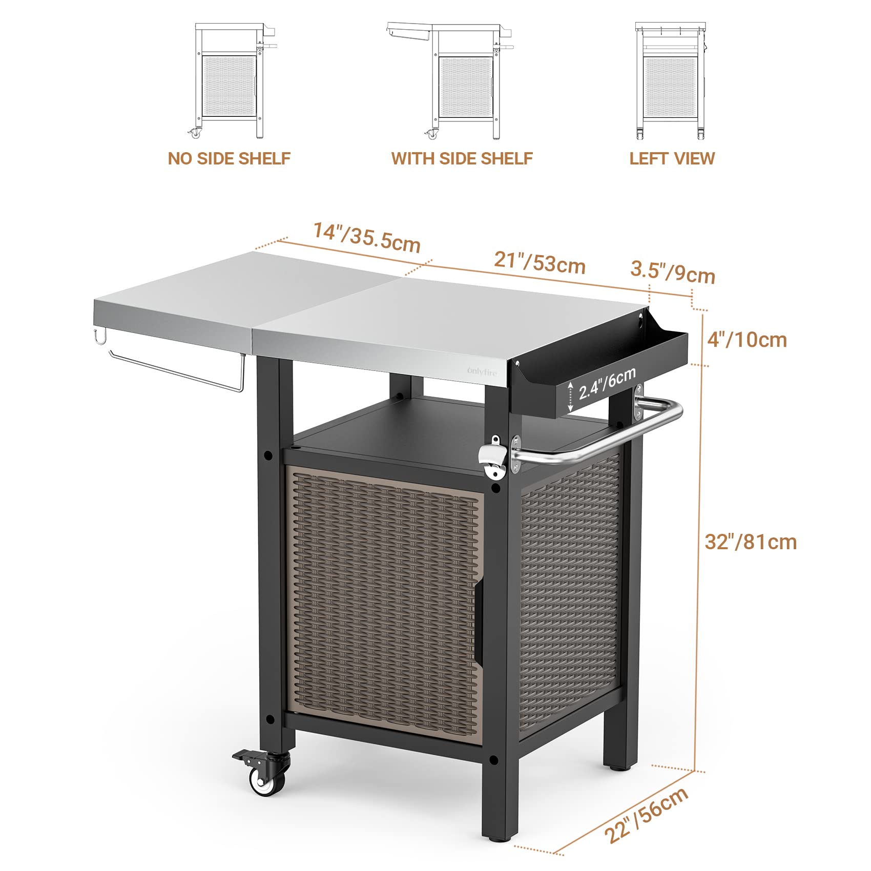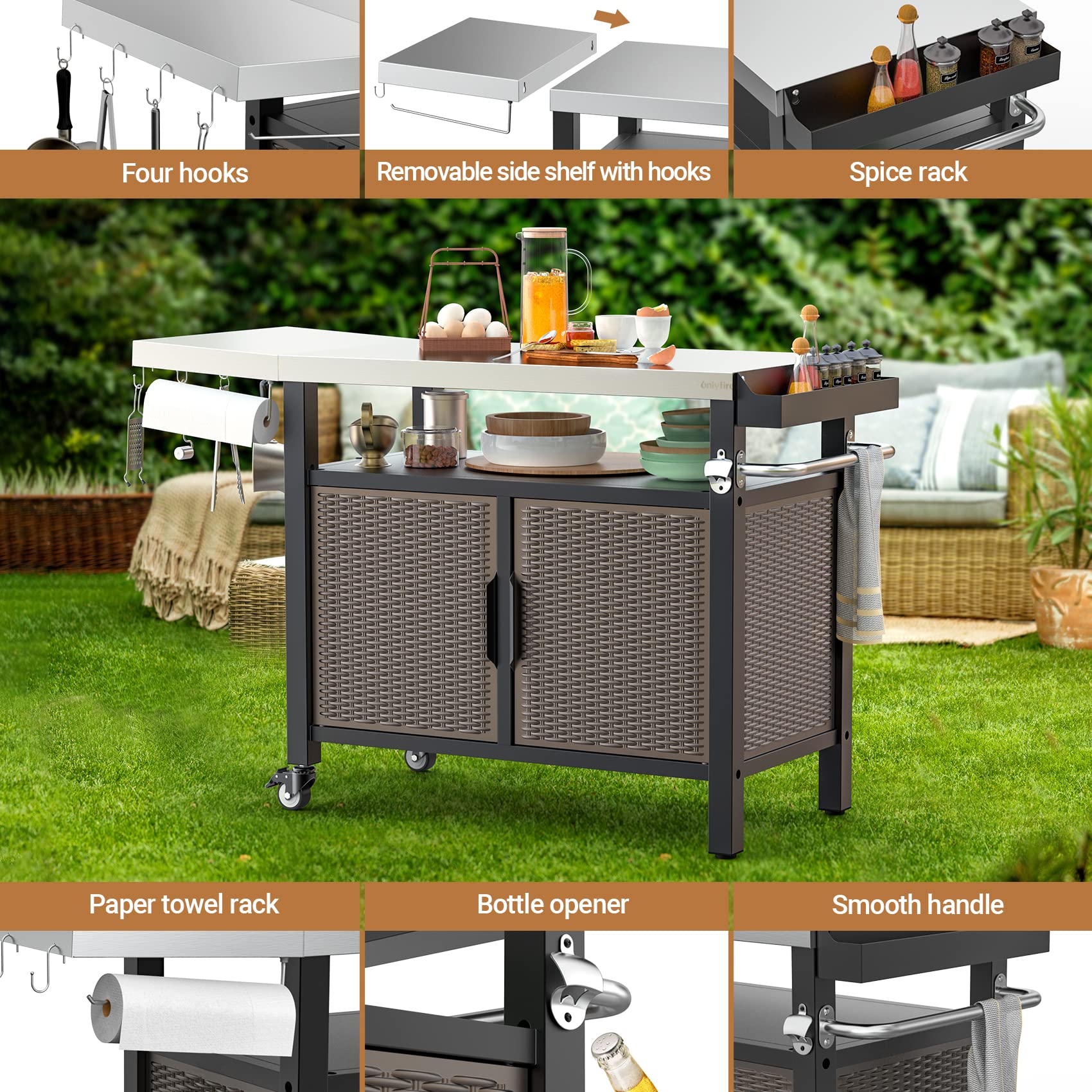 - Multifunctional: The barbecue trolley has 4 hooks, a paper towel holder, a bottle opener, a spice rack and a removable side shelf for everything you need for grilling. Making grilling more convenient and easier, and you can enjoy your favorite drink while you grill.