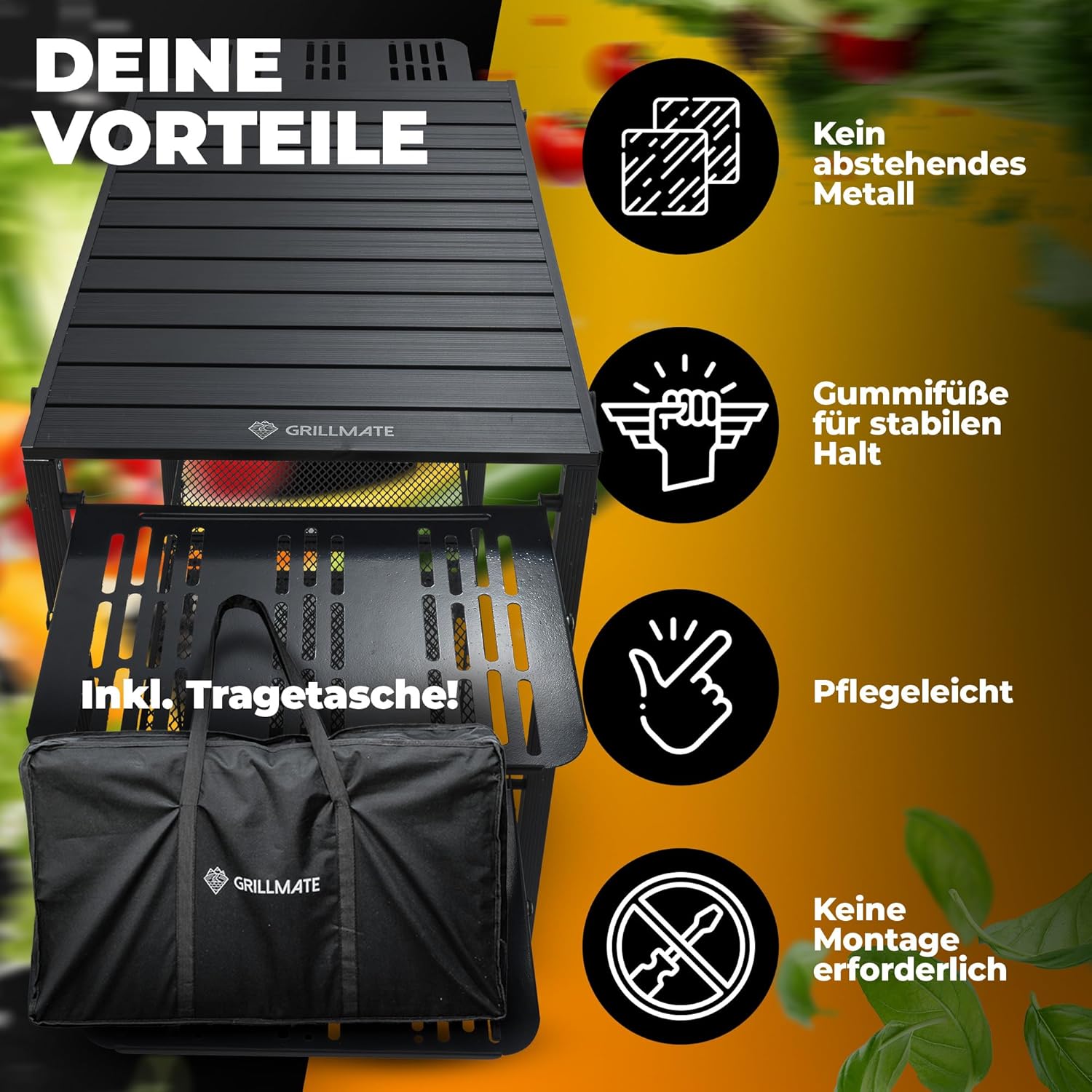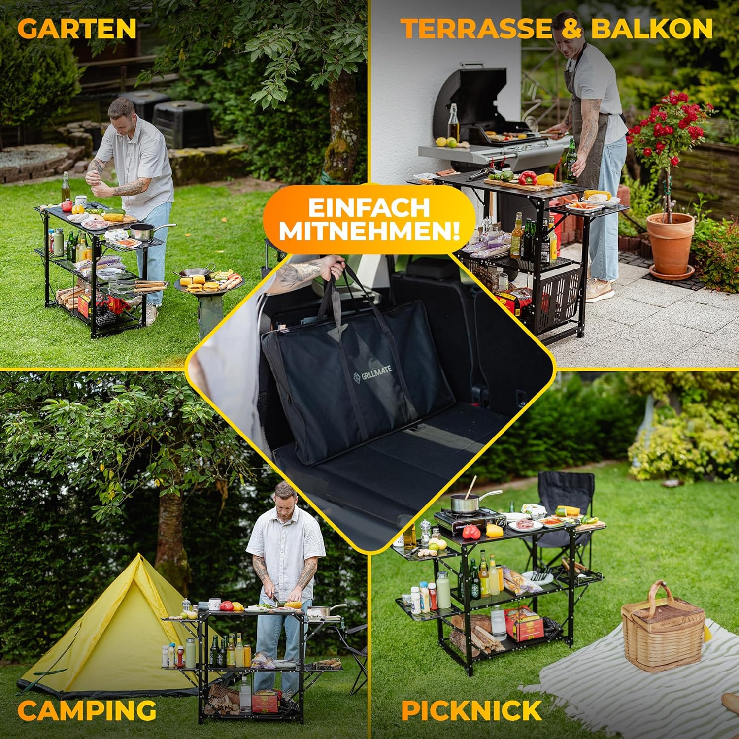 - Safe set: Do you know the problem of unstable and fluctuating grill tables? With the GRILLMATE you say goodbye to unstable conditions. Its robust construction guarantees the necessary stability so you can concentrate fully on grilling.
