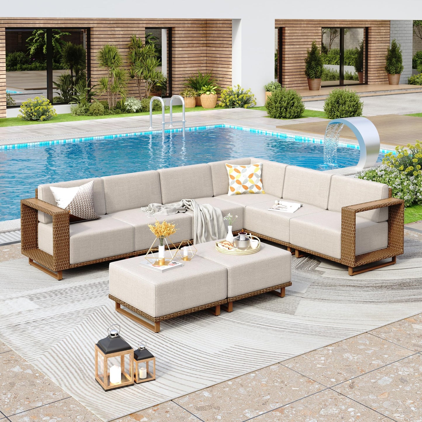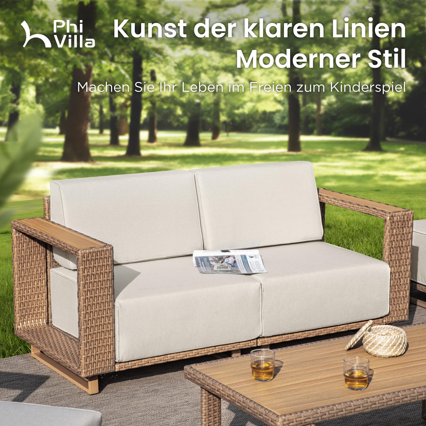PHI VILLA Rattan Gartenmöbel Set Balkonmöbel für 6, Lounge Möbel Outdoor Sofa Sets für Garten und Terrasse, Allwetter Gartensofa Terassenmöbel Außen mit Dicken Weißen Kissen und Ergonomischem Design