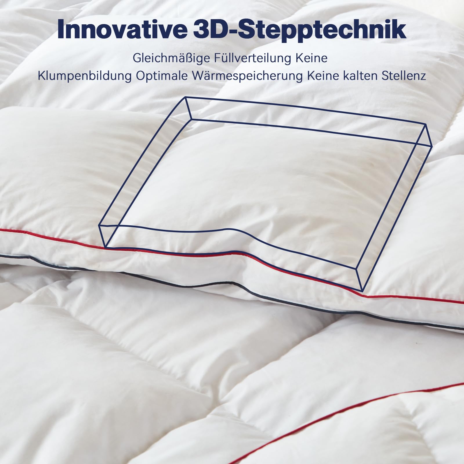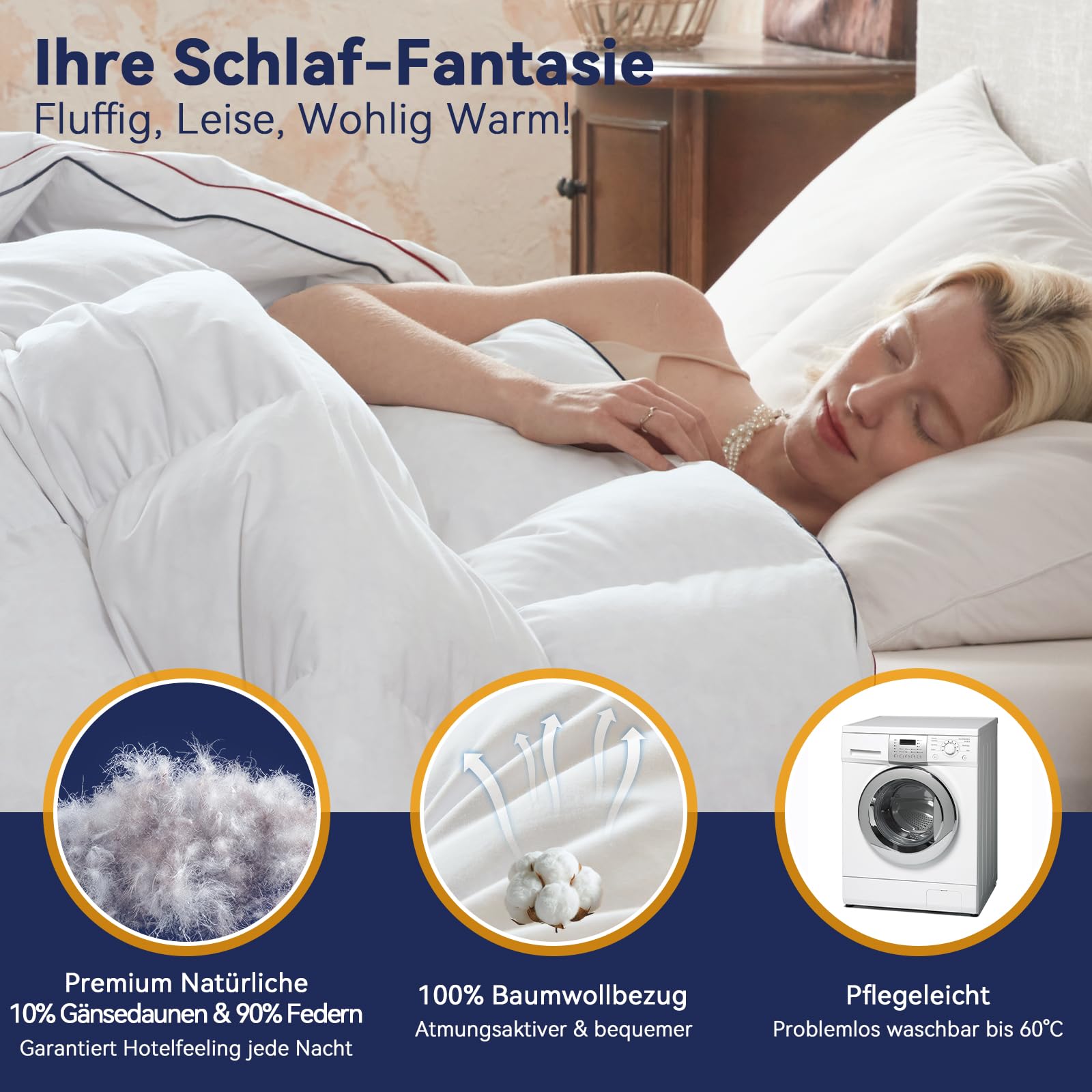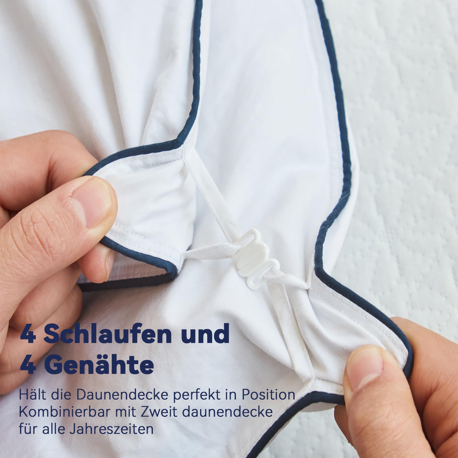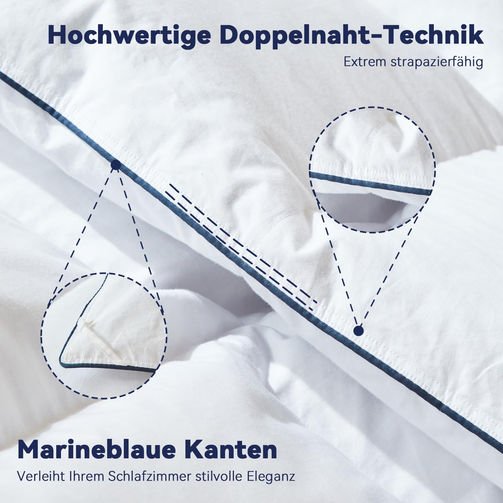 - Exquisite details - The innovative 3D chamber construction keeps the filling even and lump-free and ensures optimal insulation. 8 corner tabs keep the duvet perfectly in place and can be connected to a second duvet at any time of year. The high quality double stitching effectively prevents feathers from sticking out. Navy blue trims add stylish elegance to your bedroom
