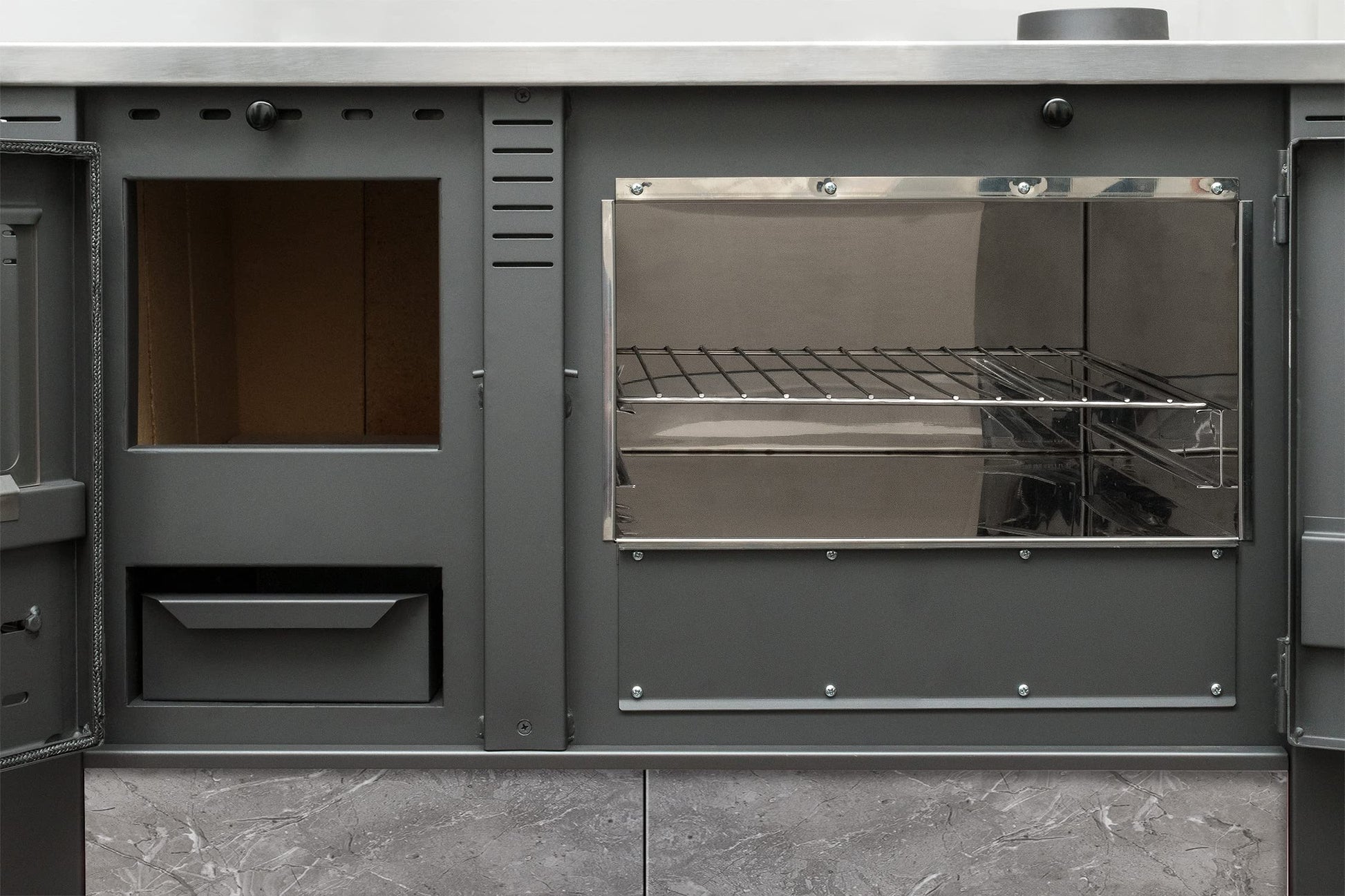 - The Panonia wood stove has 3 separate chambers. The firebox, the oven and the hotplate.