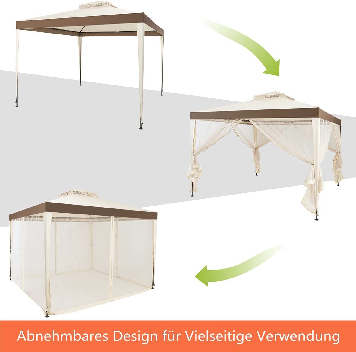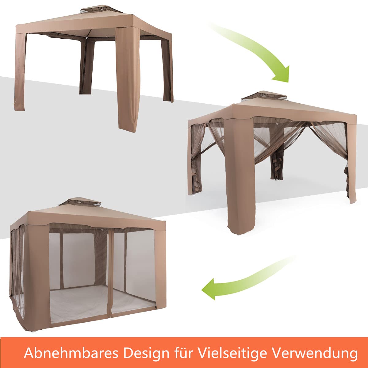RELAX4LIFE 3 x 3 m Gazebo, Garden Gazebo with Iron Frame & Mosquito Net, Garden Tent with 4 Side Walls & Double Roof, Waterproof & Sunproof Party Tent for Party Camping (Brown)
