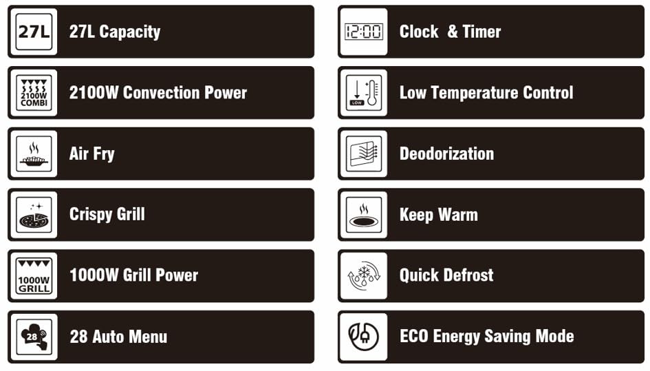 | Special feature | 10 automatic programmes, Automatic defrosting, Child Safety Lock, Children's safety lock, Grill Function, Hot air function See more |