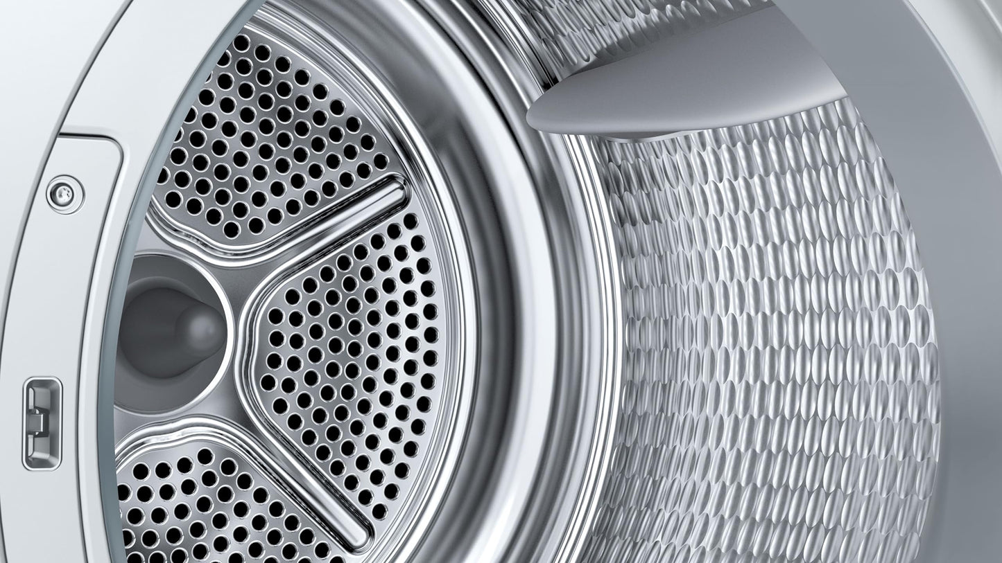 - softdry Trommelsystem: Die spezielle Trommelstruktur sorgt für eine besonders sanfte und schonende Trocknung der Wäsche dank innovativer Verteilung des Luftstroms.