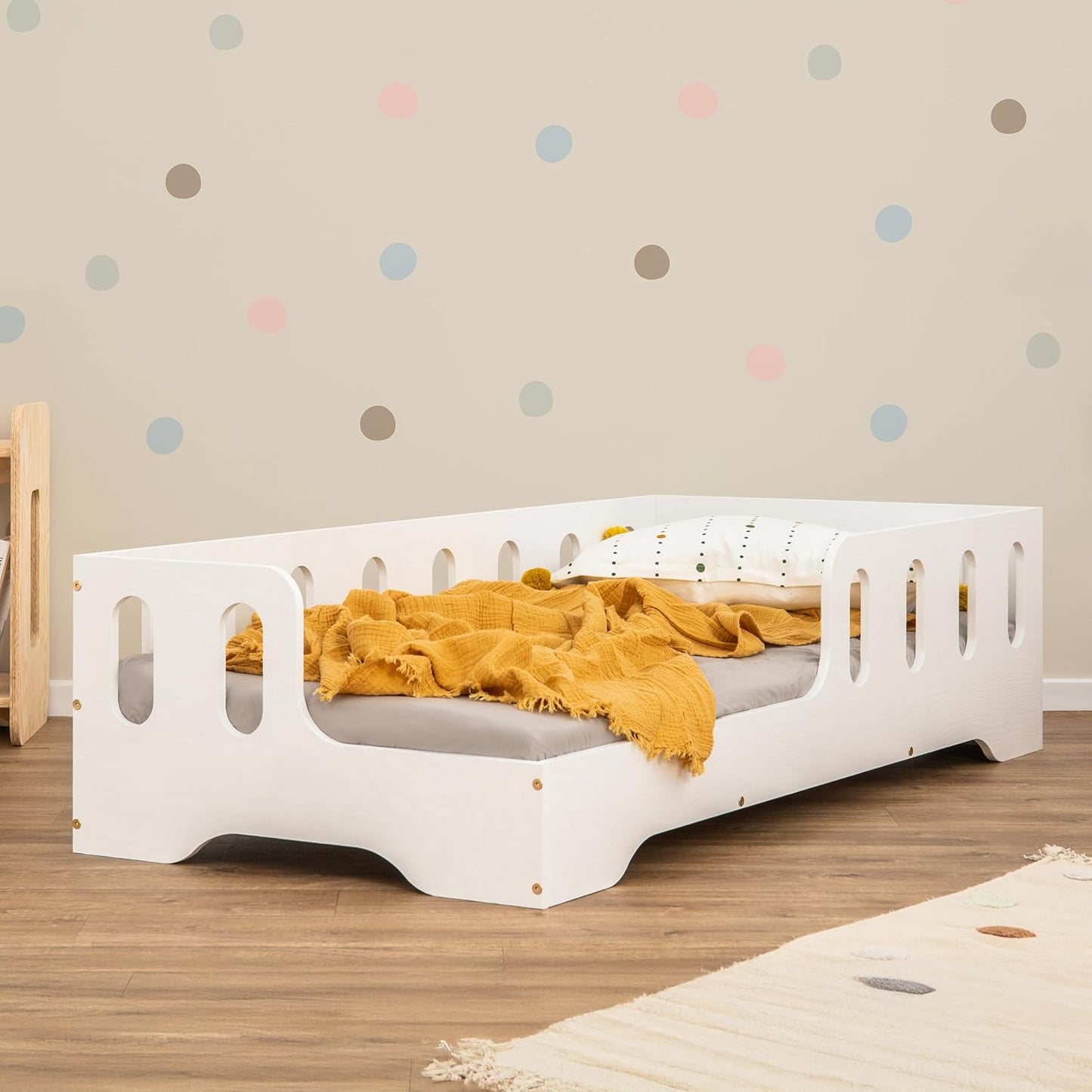 - Montessori Kinderbett mit Rausfallschutz - Bodenbett 80x160 mit einer niedrigen Einstiegshöhe von 18 cm erleichtert das selbstständige Ein- und Aussteigen nach Montessori-Prinzipien. Das Geländer ist auf der Hälfte des Bettes. Die Gesamthöhe der Konstruktion beträgt 40 cm