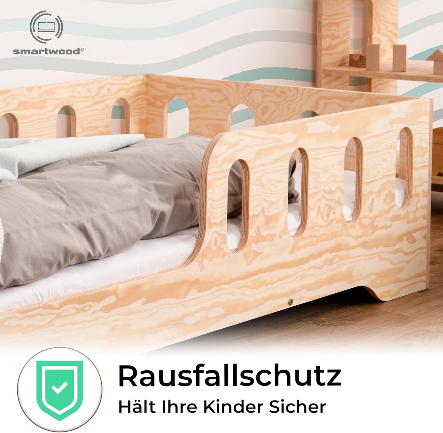 smartwood Kinderbett 80x160 Montessori Bett mit Rausfallschutz & Lattenrost - Kiefernsperrholz mit FSC-Zertifikat - für Jungen und Mädchen - Einfache Montage - TILA 1L