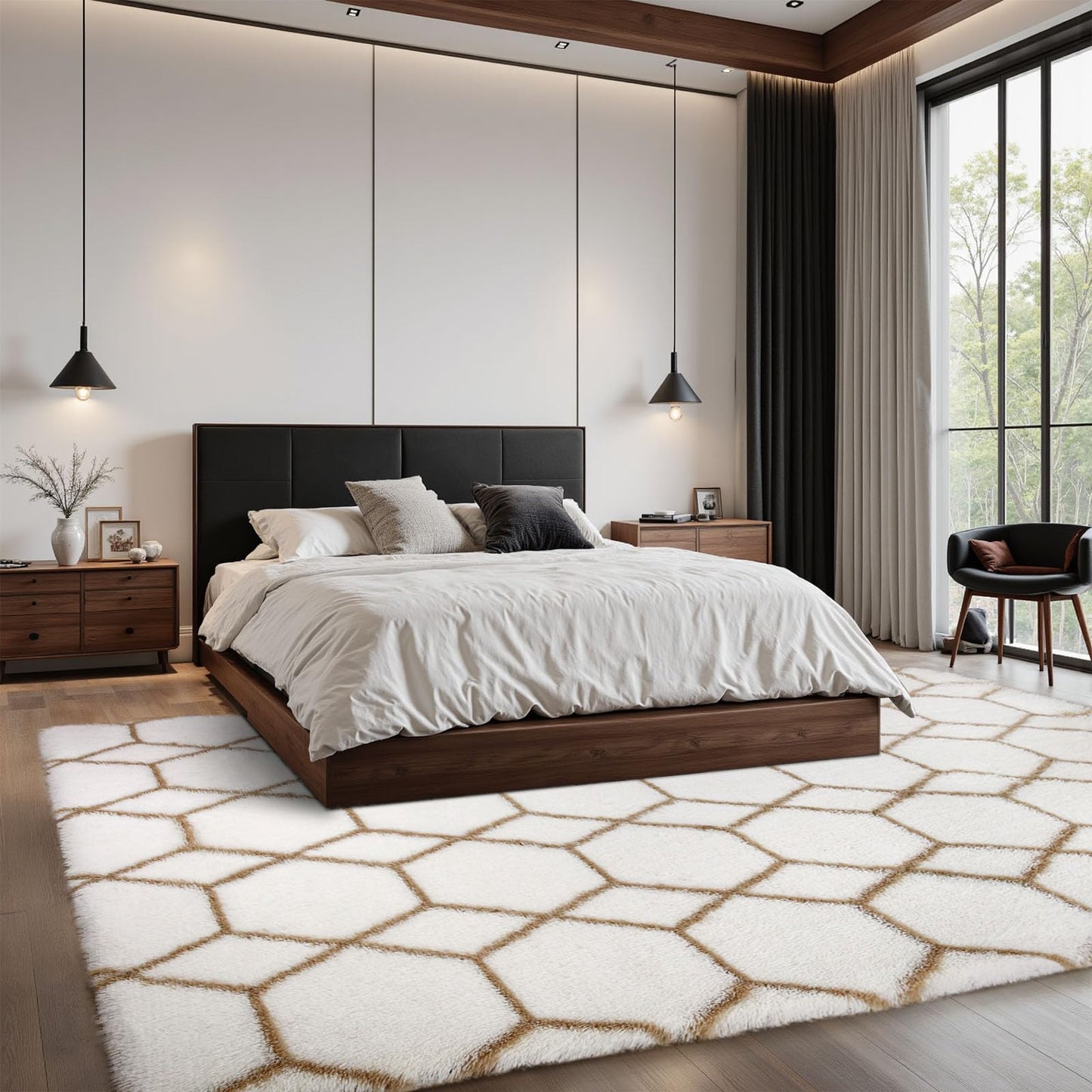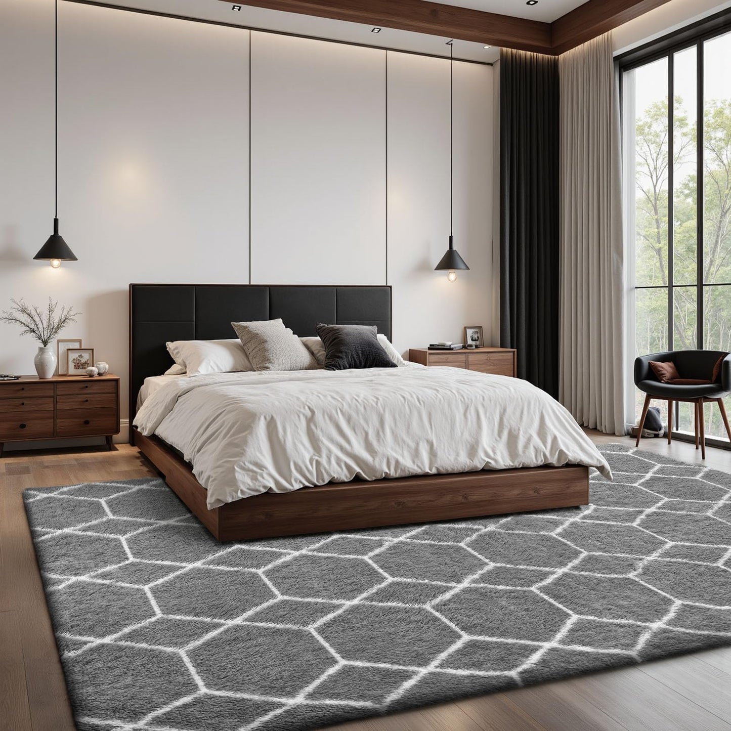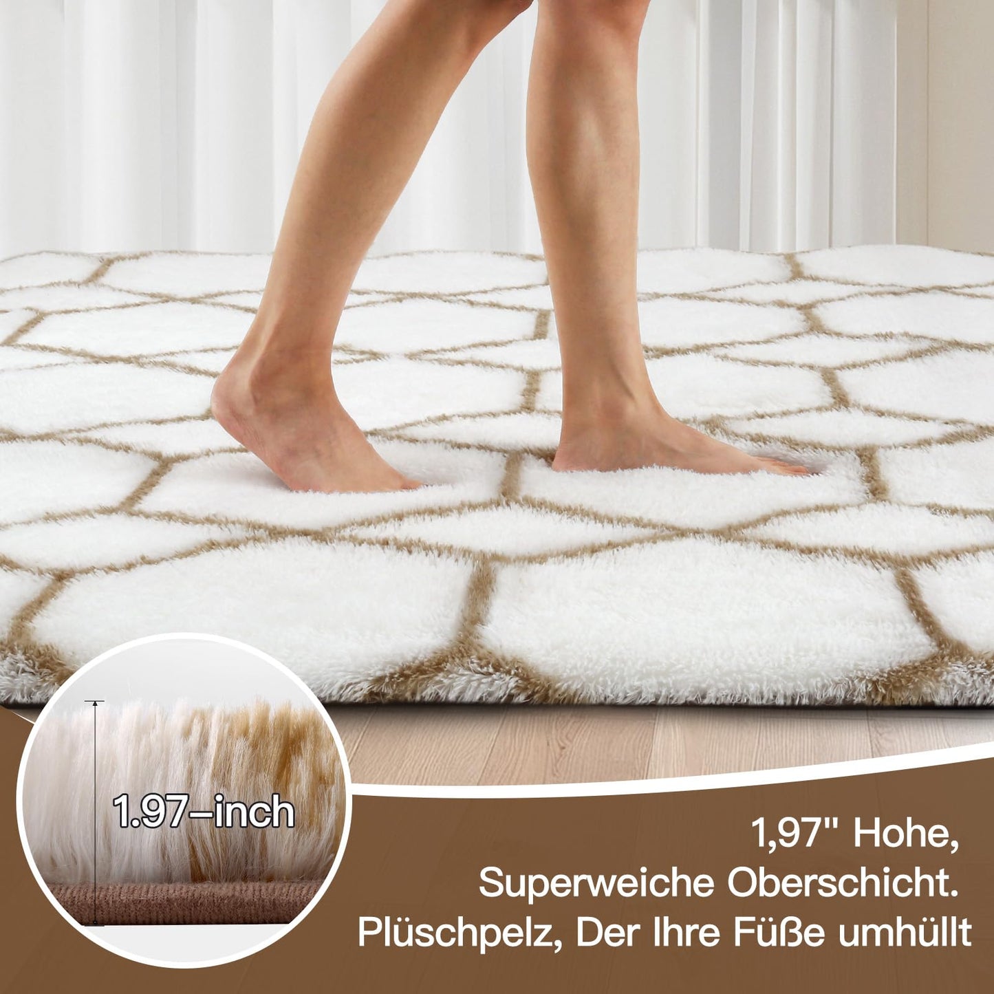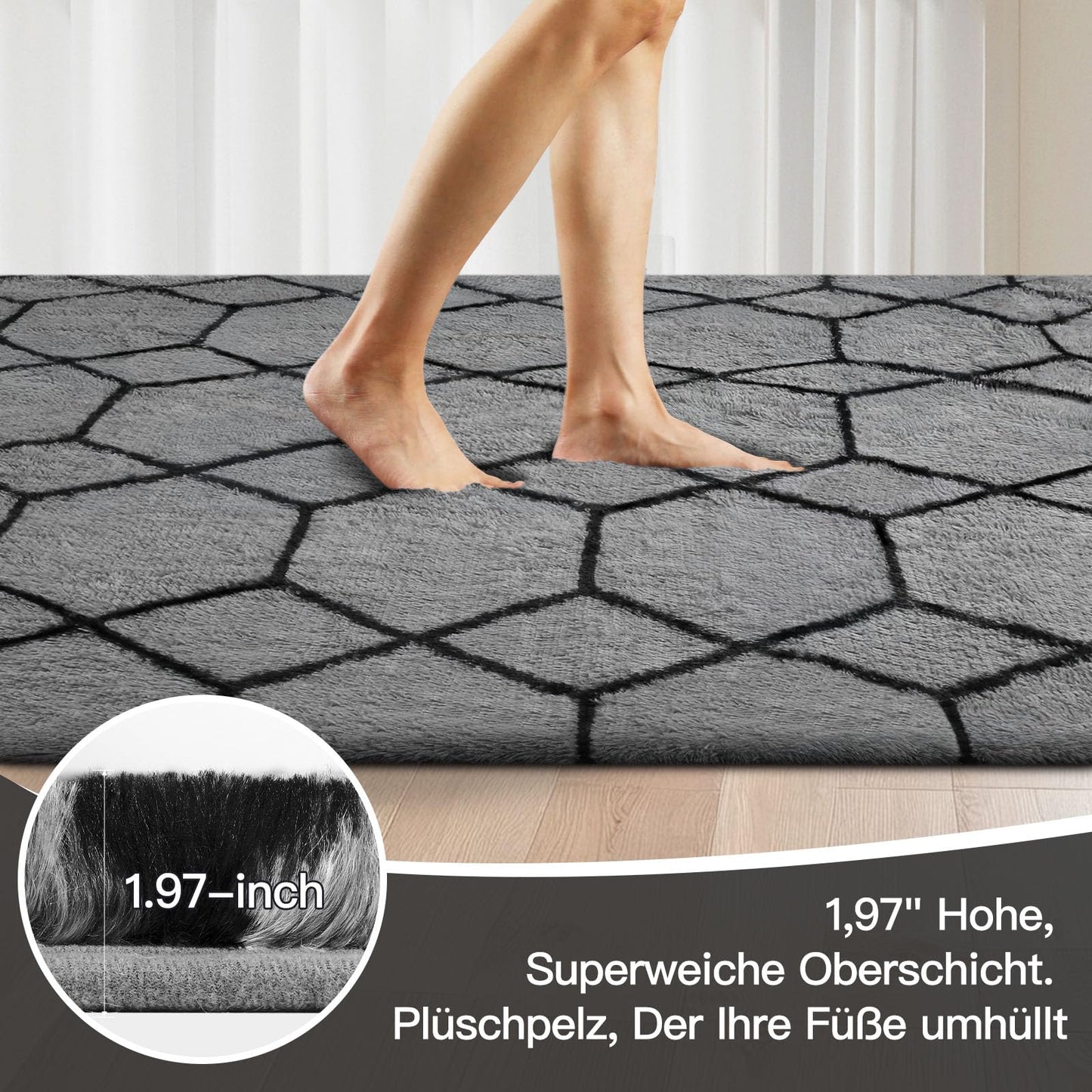 - 【EINZIGARTIGES DESIGN】 – Das sechseckige Muster des Teppichs ist schlicht und großzügig und verleiht ihm Persönlichkeit. Es passt perfekt zu Ihrem Wohn- und Schlafzimmer. Der Schlafzimmerteppich besteht aus besonders weichem Fasermaterial, und der Samt nimmt Staub auf. In der Mitte befindet sich ein hochelastischer Schwamm, der den Fußdruck reduziert und für mehr Weichheit sorgt.