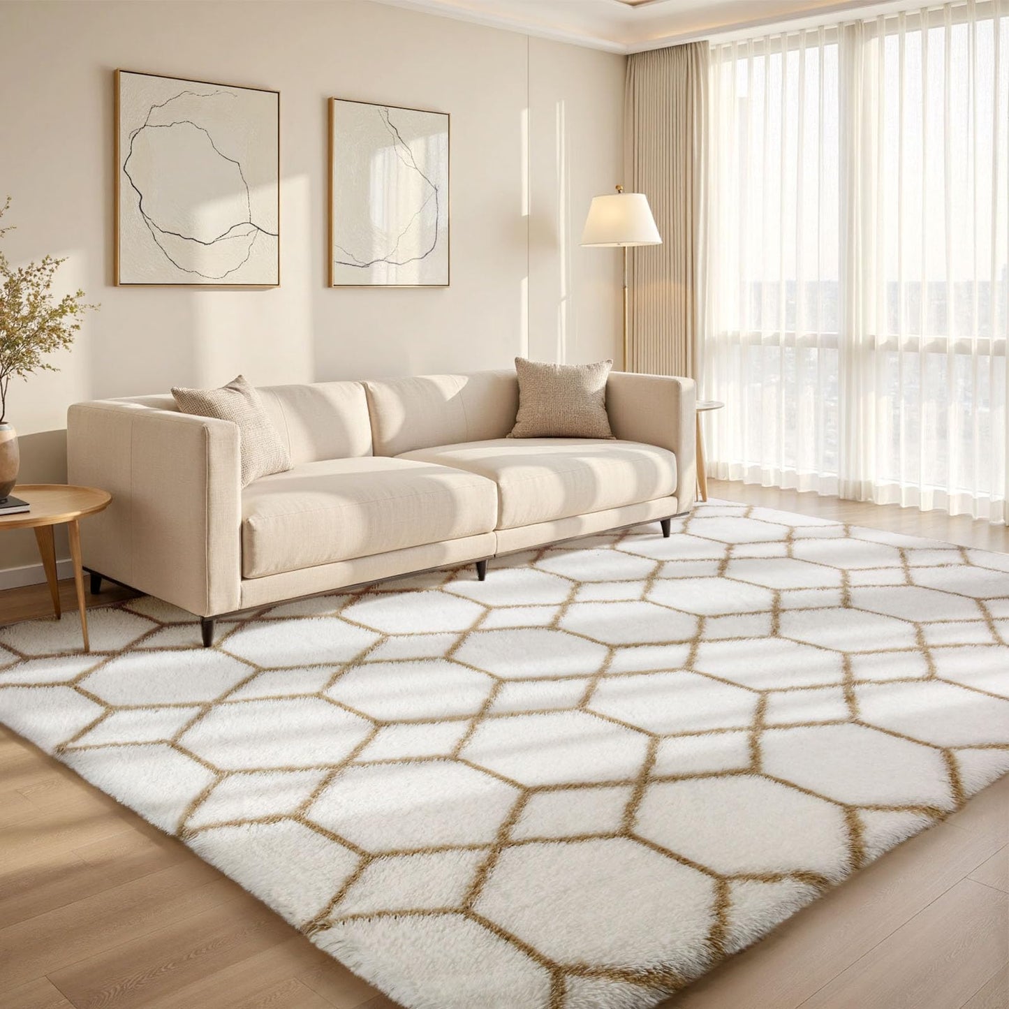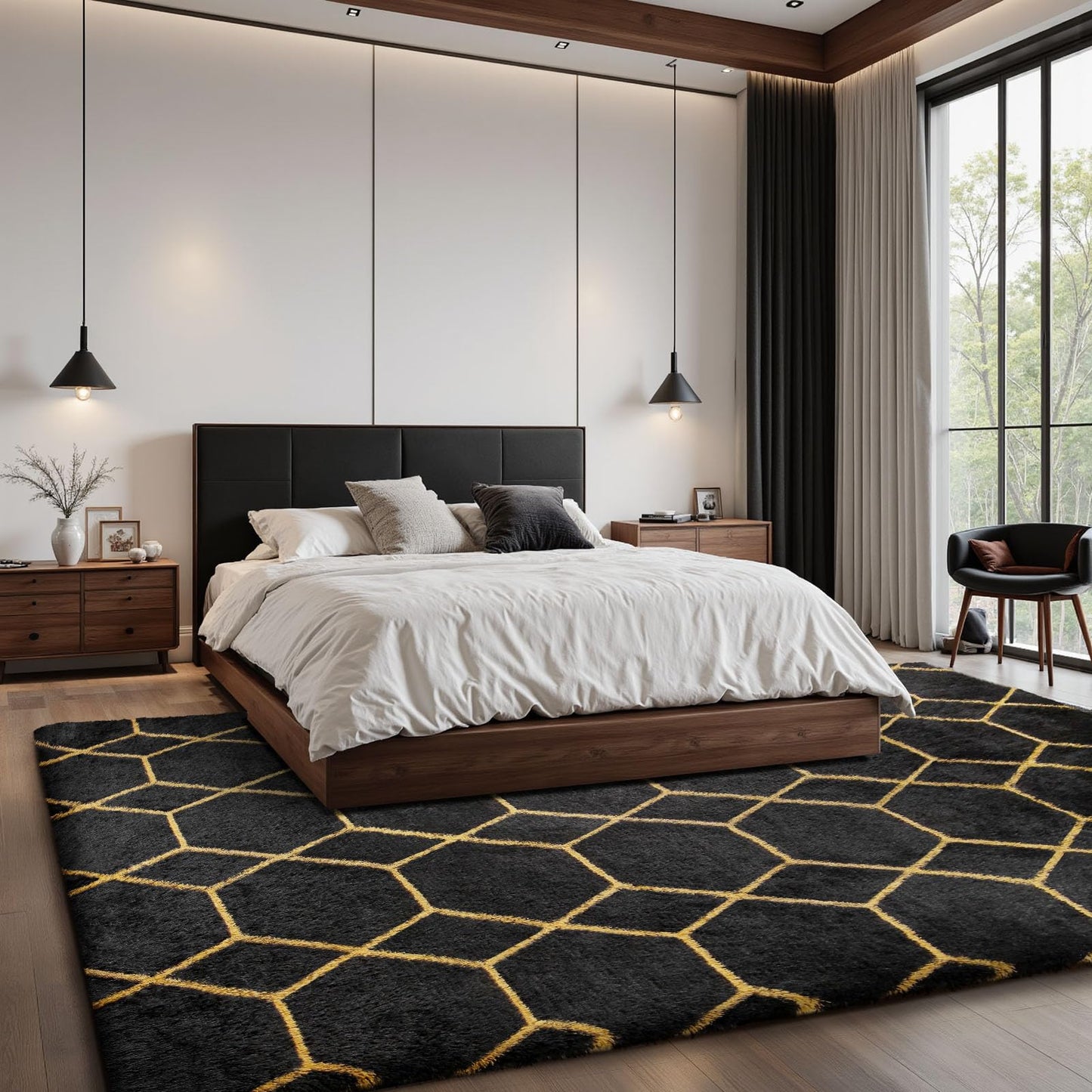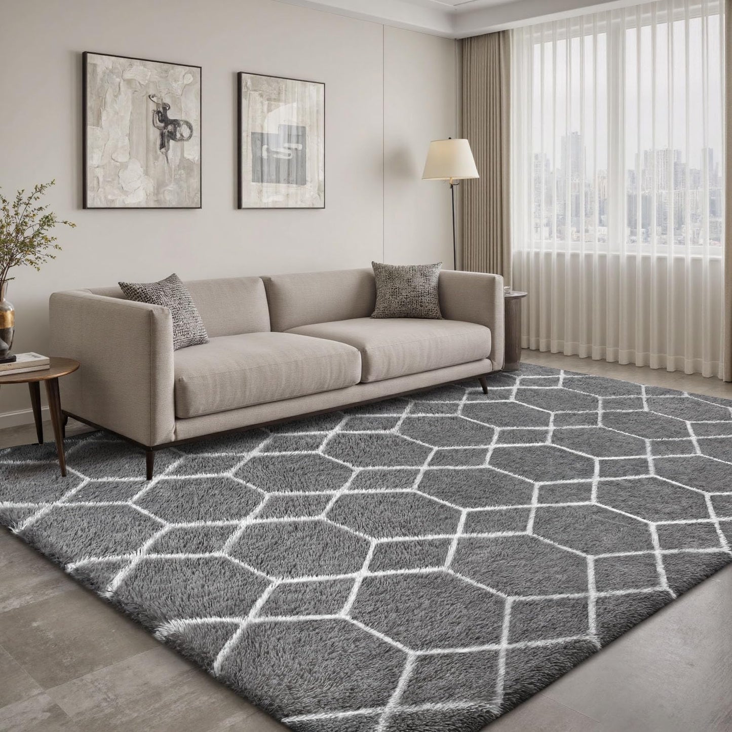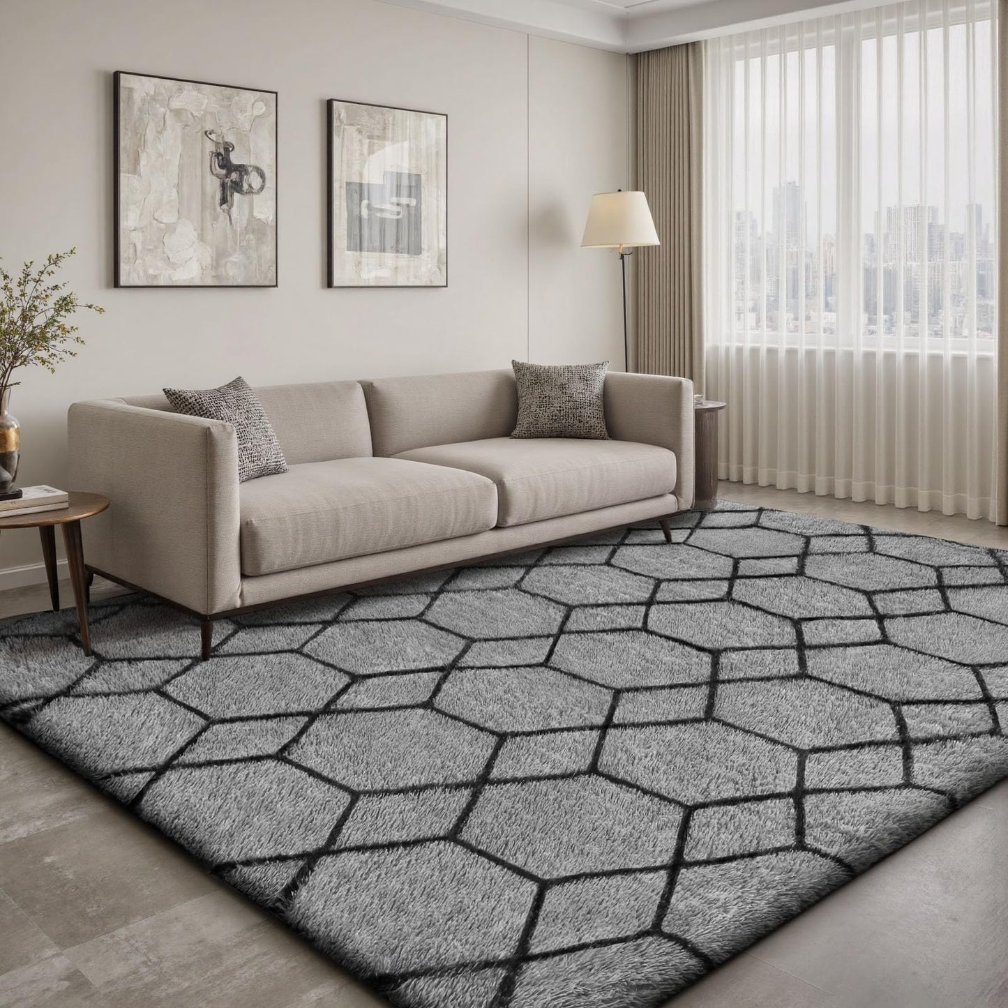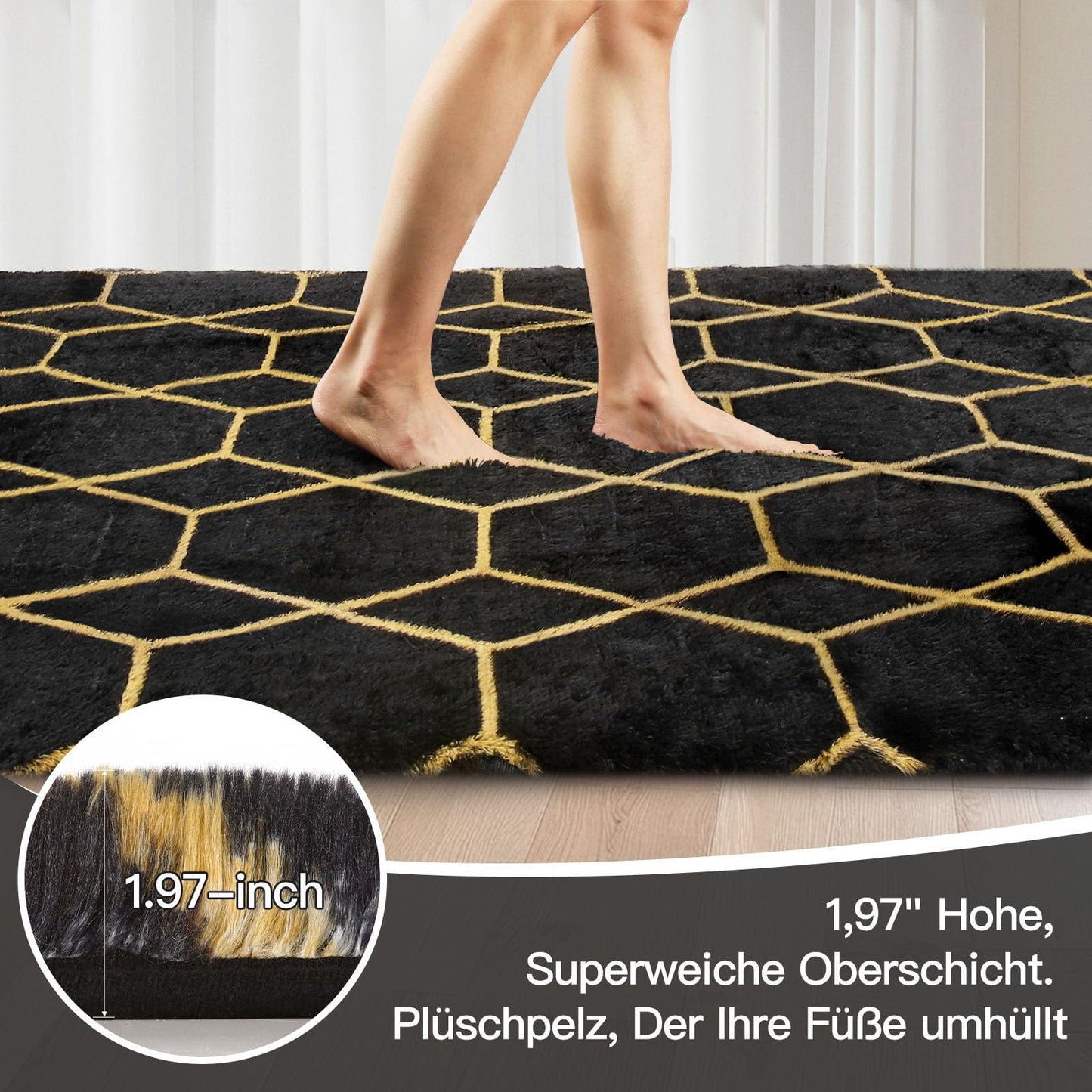 - 【EINZIGARTIGES DESIGN】 – Das sechseckige Muster des Teppichs ist schlicht und großzügig und verleiht ihm Persönlichkeit. Es passt perfekt zu Ihrem Wohn- und Schlafzimmer. Der Schlafzimmerteppich besteht aus besonders weichem Fasermaterial, und der Samt nimmt Staub auf. In der Mitte befindet sich ein hochelastischer Schwamm, der den Fußdruck reduziert und für mehr Weichheit sorgt.