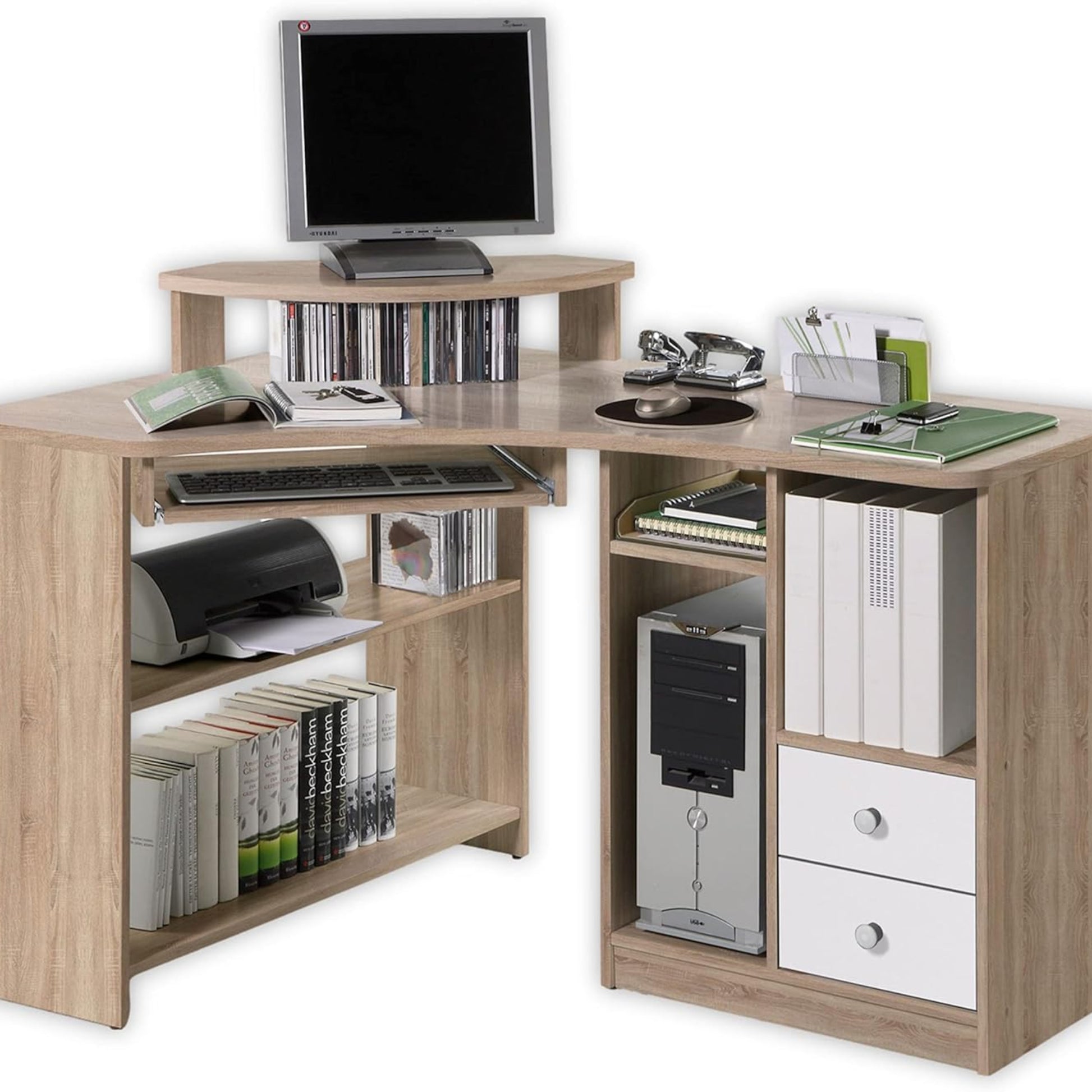 Tango Corner Desk with Keyboard Shelf and Wooden Decoration – Sonoma/White 135 x 94 x 95 cm