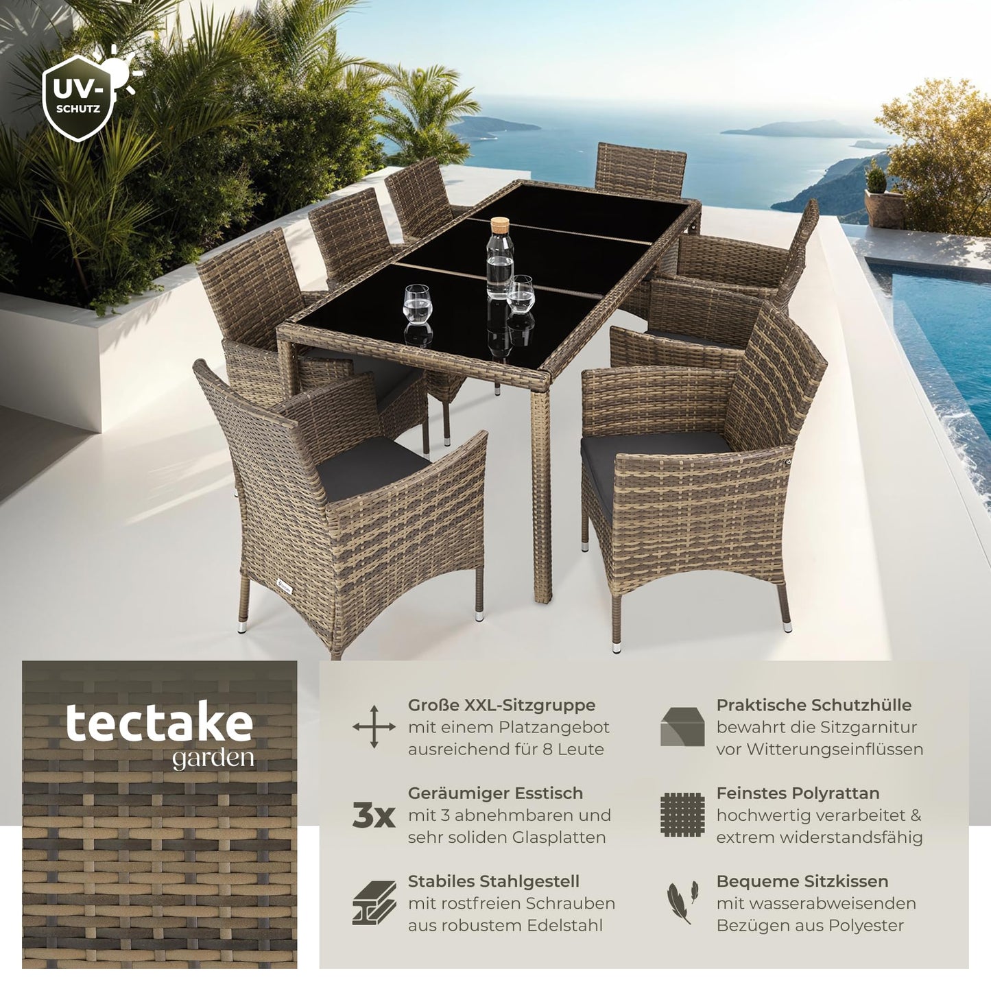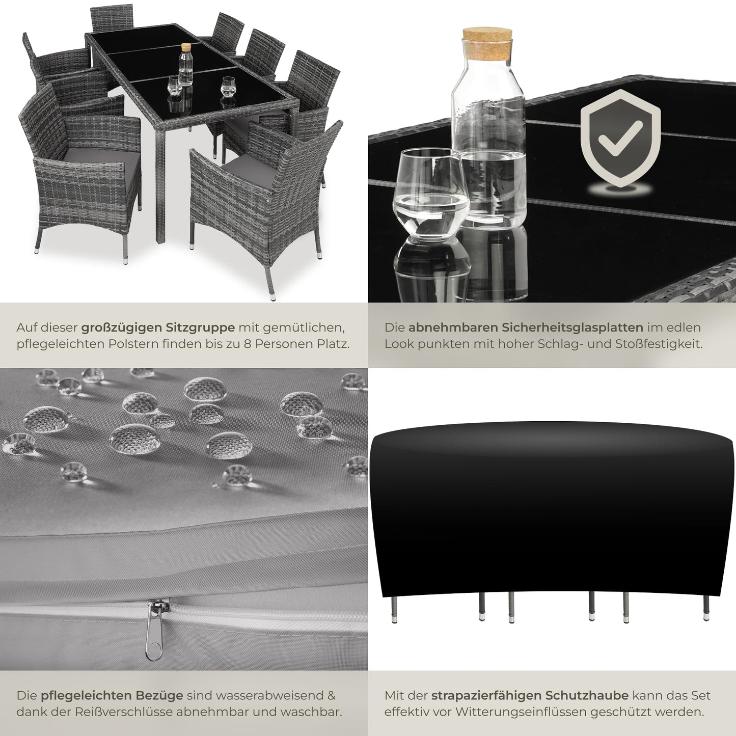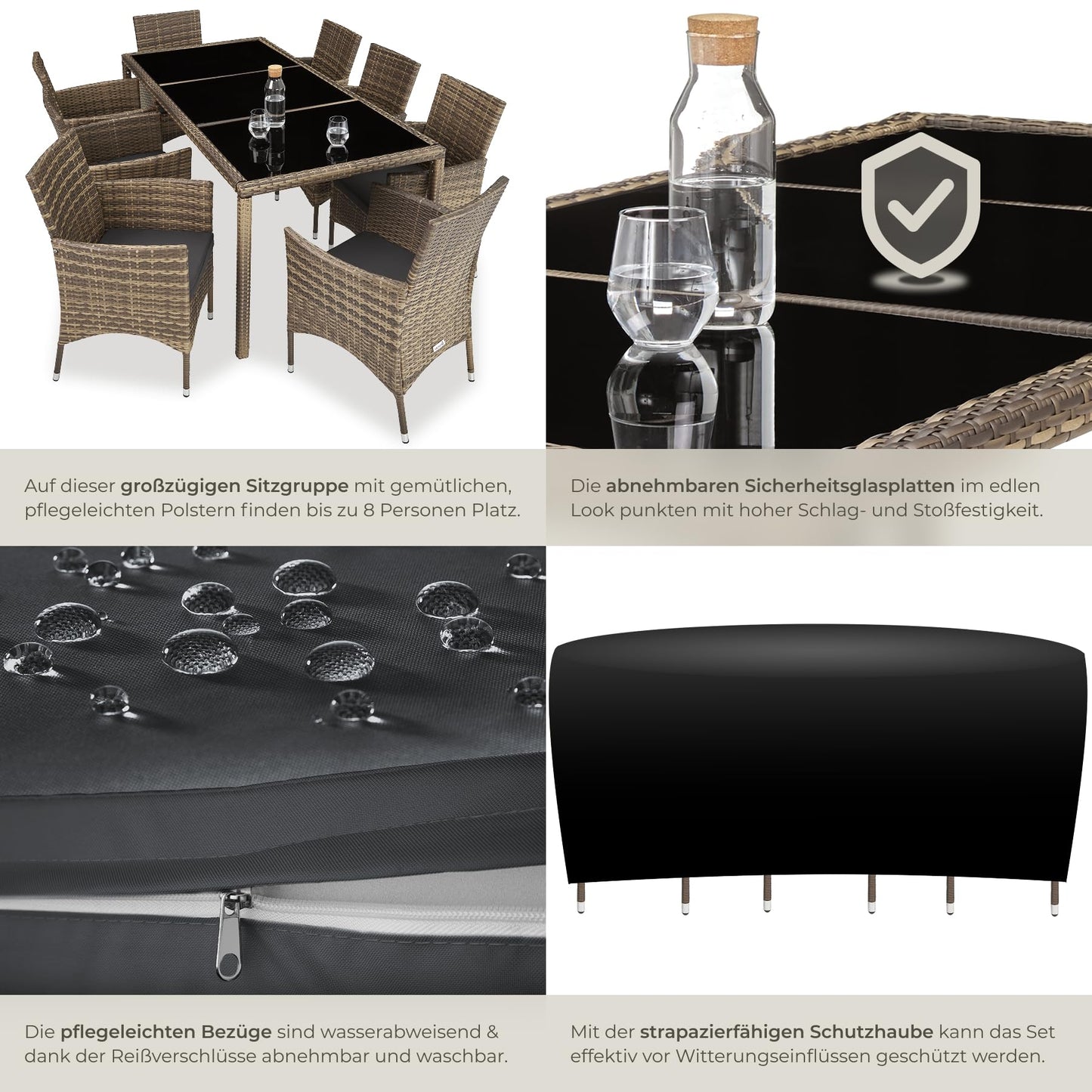 tectake® edles Outdoor Gartenmöbel Set Rattan Sitzgruppe mit Sessel und Tisch für 8 Personen, inkl. Schutzhülle und Polstern, Balkon Möbel wetterfest - Natur/dunkelgrau