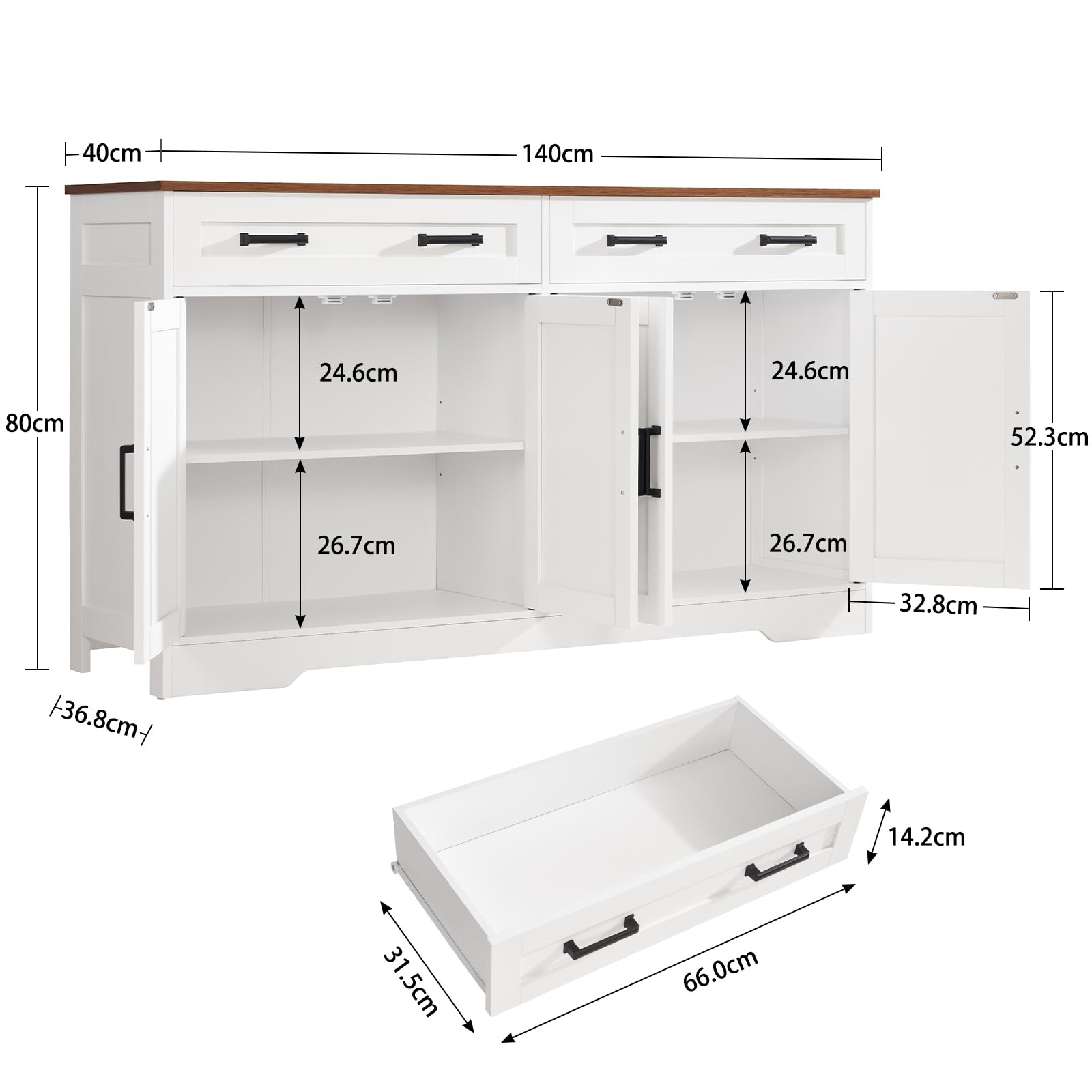 - Durable: Made of high-quality veneered wood and equipped with gently sliding rails made with excellent craftsmanship, this kitchen sideboard with drawers offers reliable stability and durability for everyday use. Overall dimensions: 140cm W x 40cm D x 80cm H