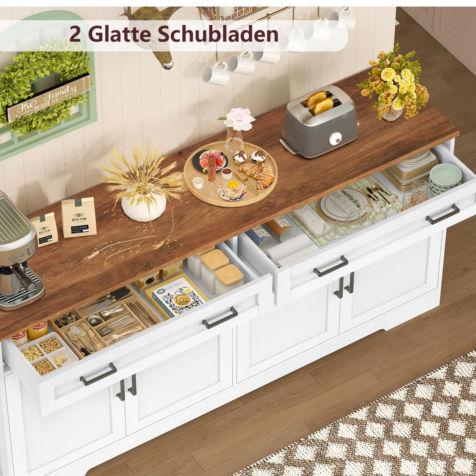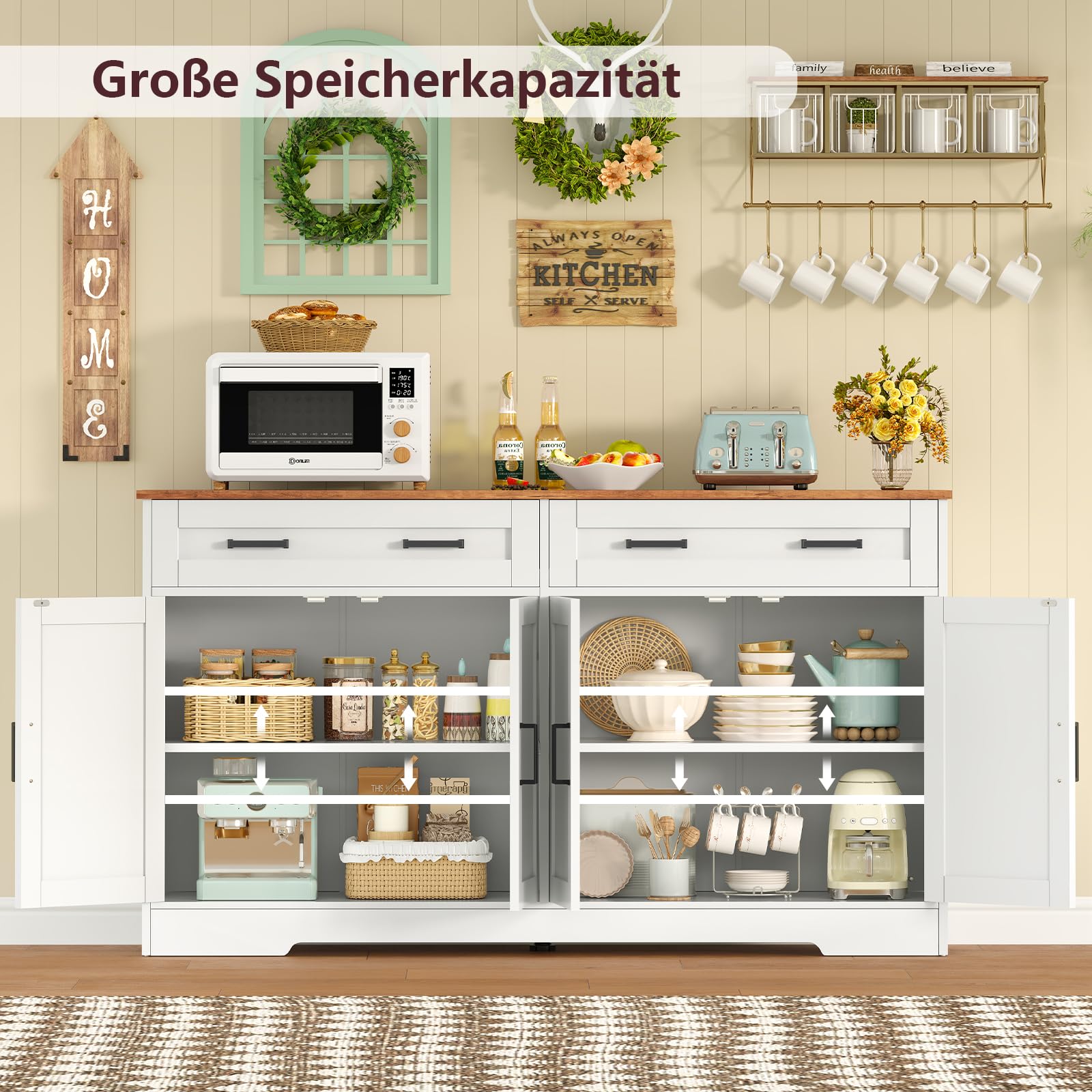 - Large storage space: with 4 doors and 2 spacious drawers, this kitchen cabinet is a stylish and functional storage solution for your home. The 140 cm wide table top is ideal for microwave or coffee machine. The drawers and bottom bracket provide plenty of storage space for dishes, glassware, bar utensils or household items, perfect as a sideboard and additional storage space for the kitchen