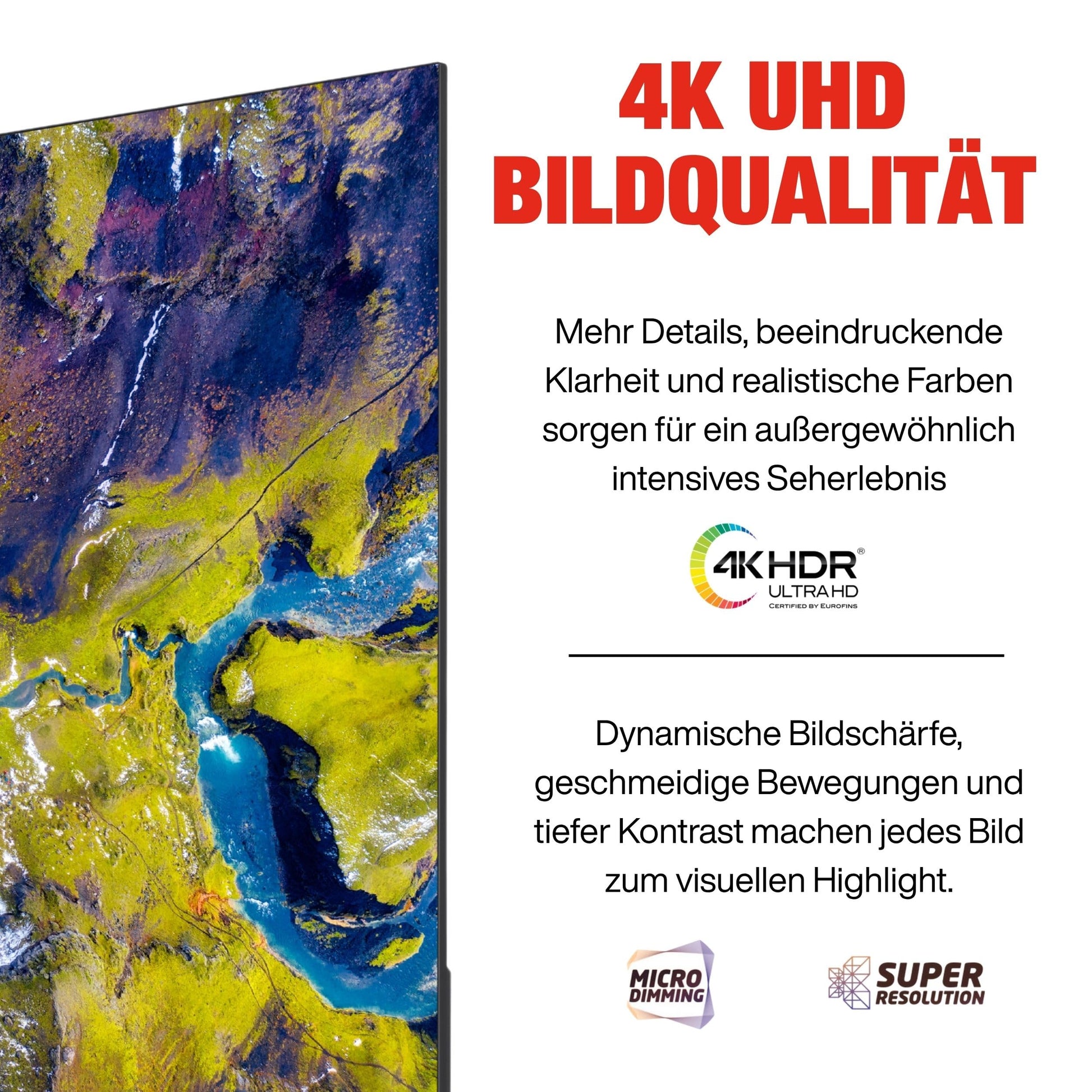 - Impressive details – The combination of Dolby Vision HDR, Super Resolution and Micro Dimming delivers particularly high-contrast shots with a natural colouring and impressive detail sharpness.
