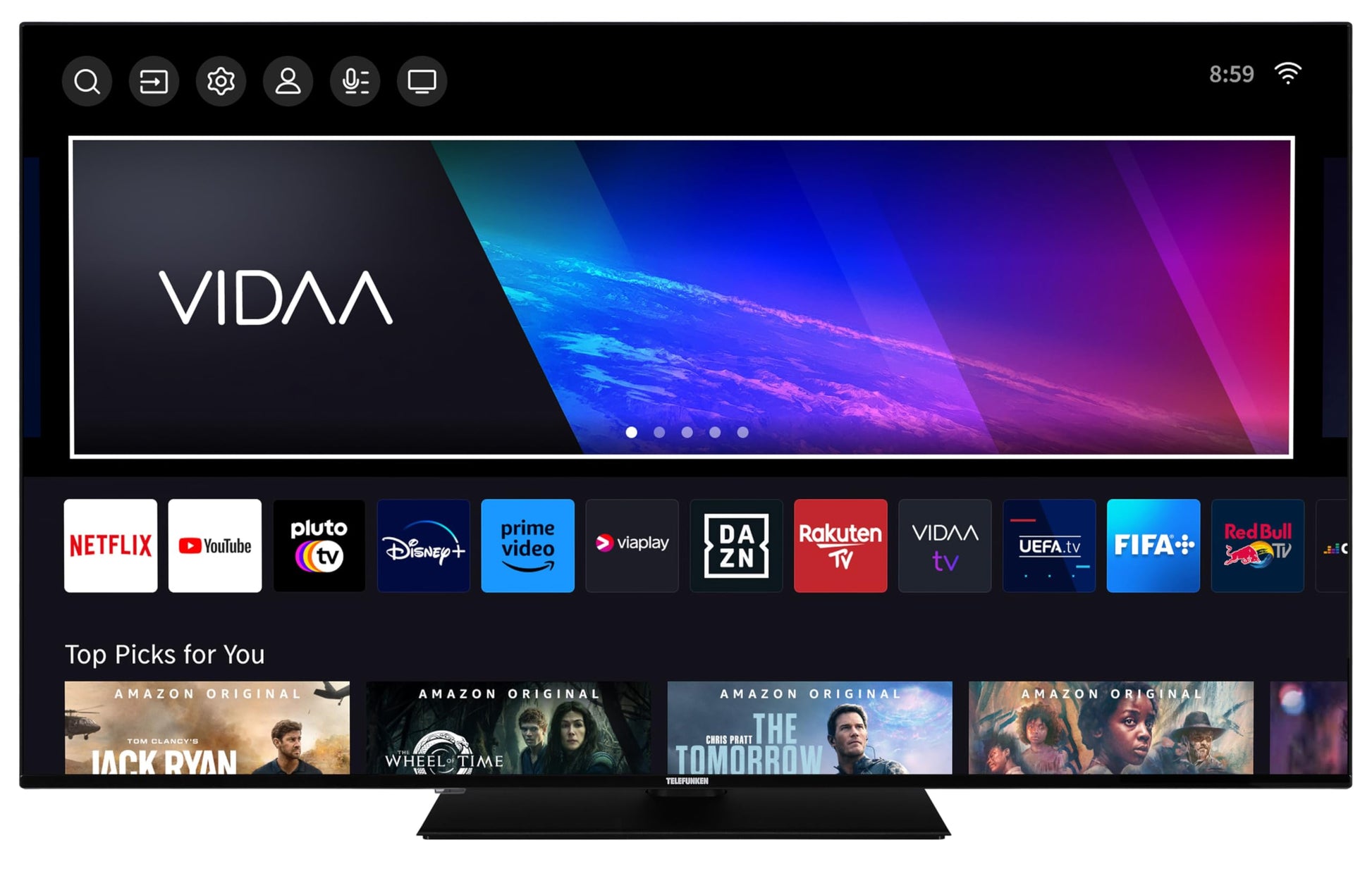 - Limitless entertainment – series marathon, movie night or top sports – enjoy the variety of VIDAA OS with numerous apps and media libraries such as Prime Video, Netflix, DAZN, Disney+, YouTube and much more