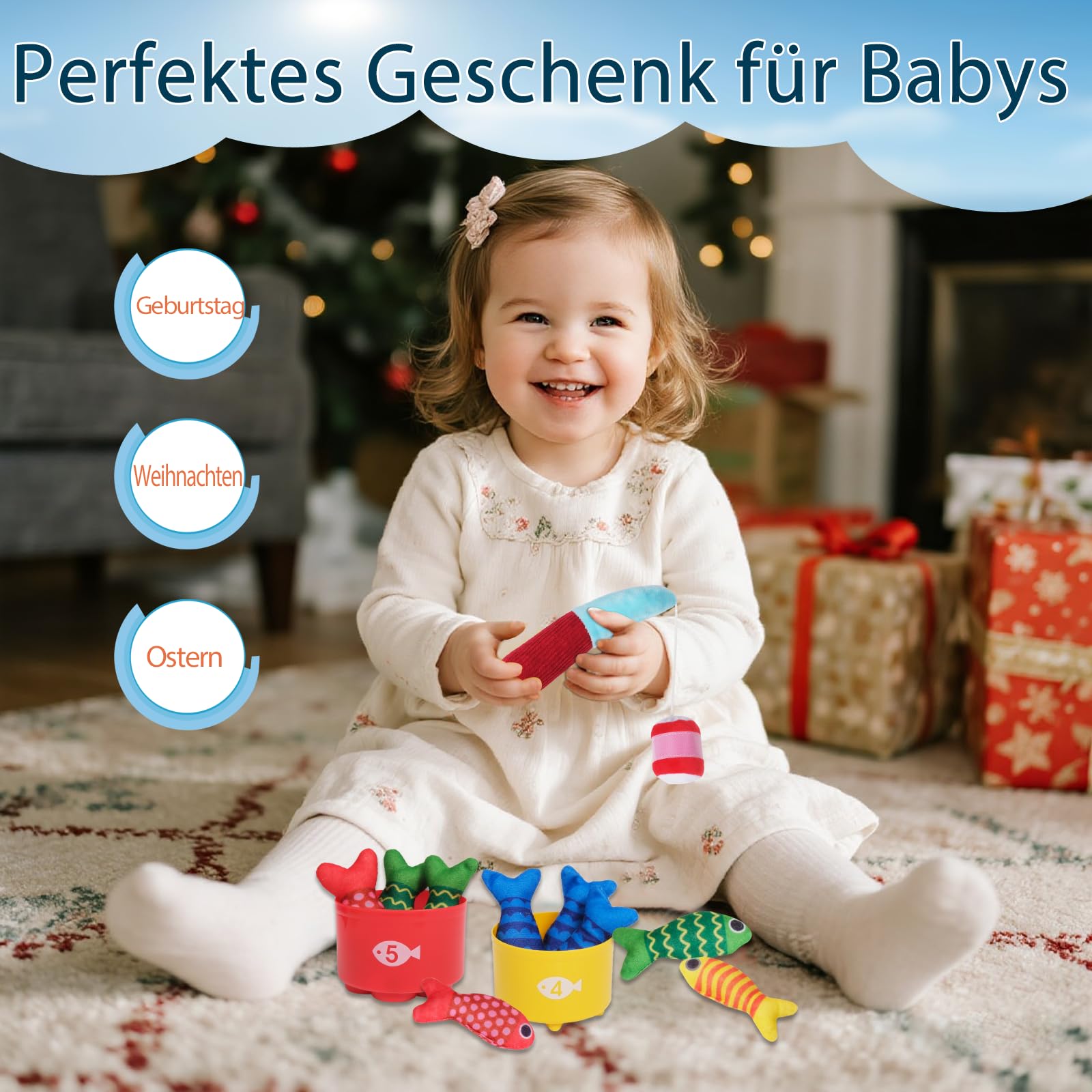 TenFans Montessori Fishing Game from 1 Year Made of Fabric - With Stacking Cups & Colour Sorting Set - First Birthday Gift - Travel Learning Toy with Sensory Activity