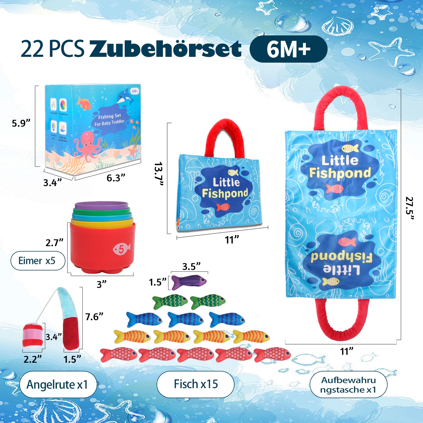 - 22-piece Montessori marine science set: self-directed exploration journey. Small captains control a sensory expedition: bell fishing rod (auditory), 15 rainbow fish, 5 size stacking cups + 2-in-1 sea mat/storage bag. Self-correcting station grows with you - from 6M+ touch experiences to 3J+ math missions, zero preparation!
