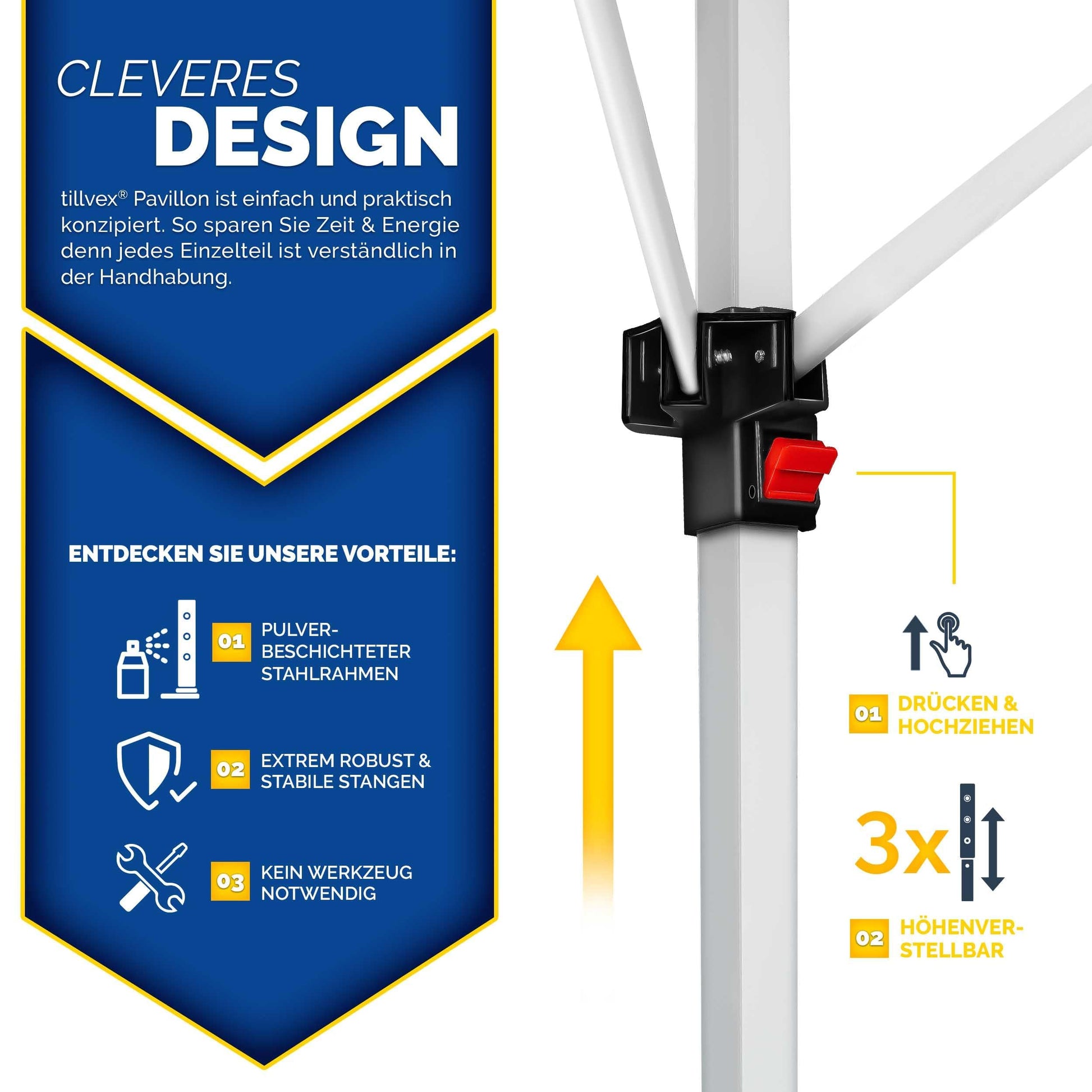 - High-quality materials: our tillvex folding gazebo has a frame made of steel with powder coating. In addition, it is adjustable to 3 different heights. The metal struts, anchored feet, pegs and guy ropes give extra stability.