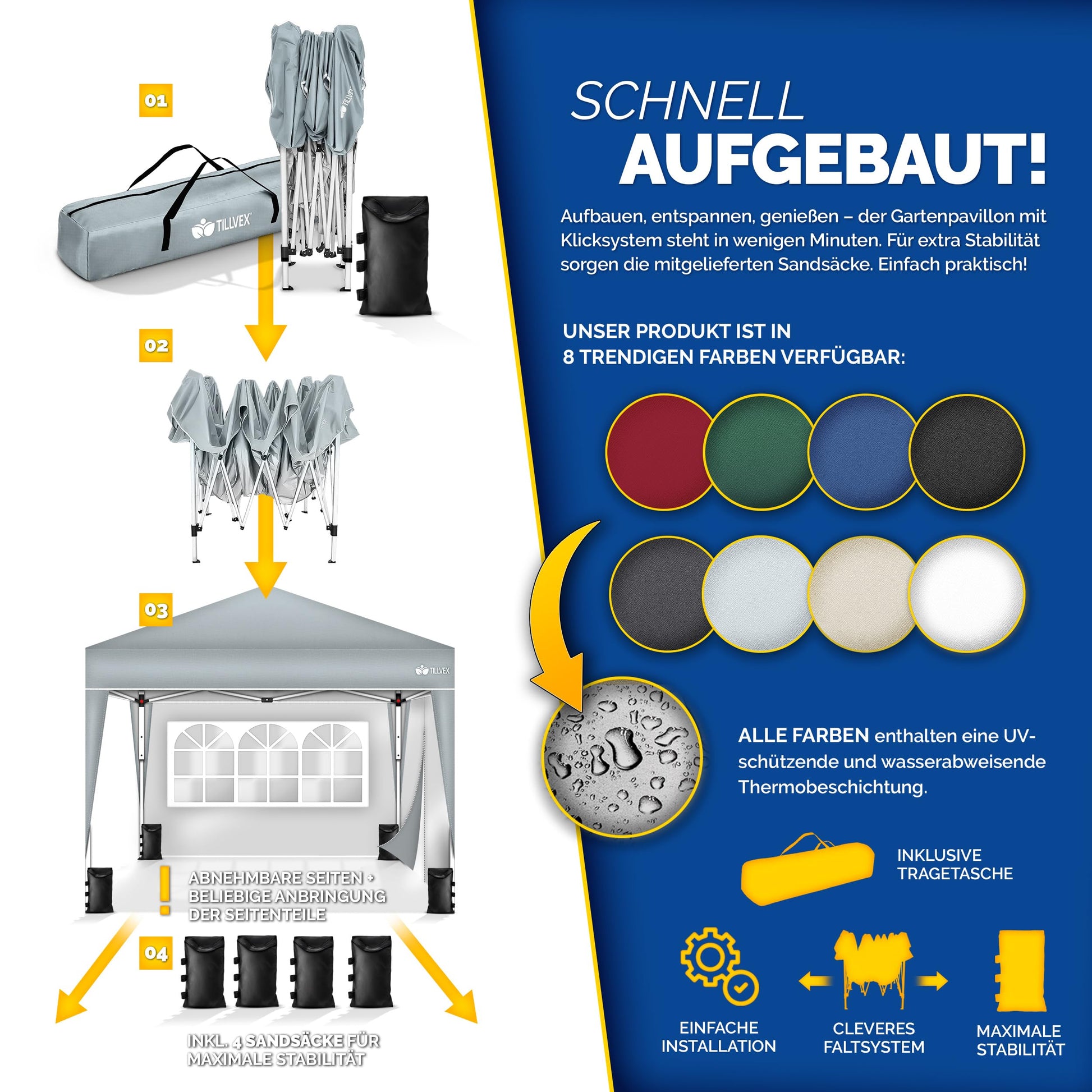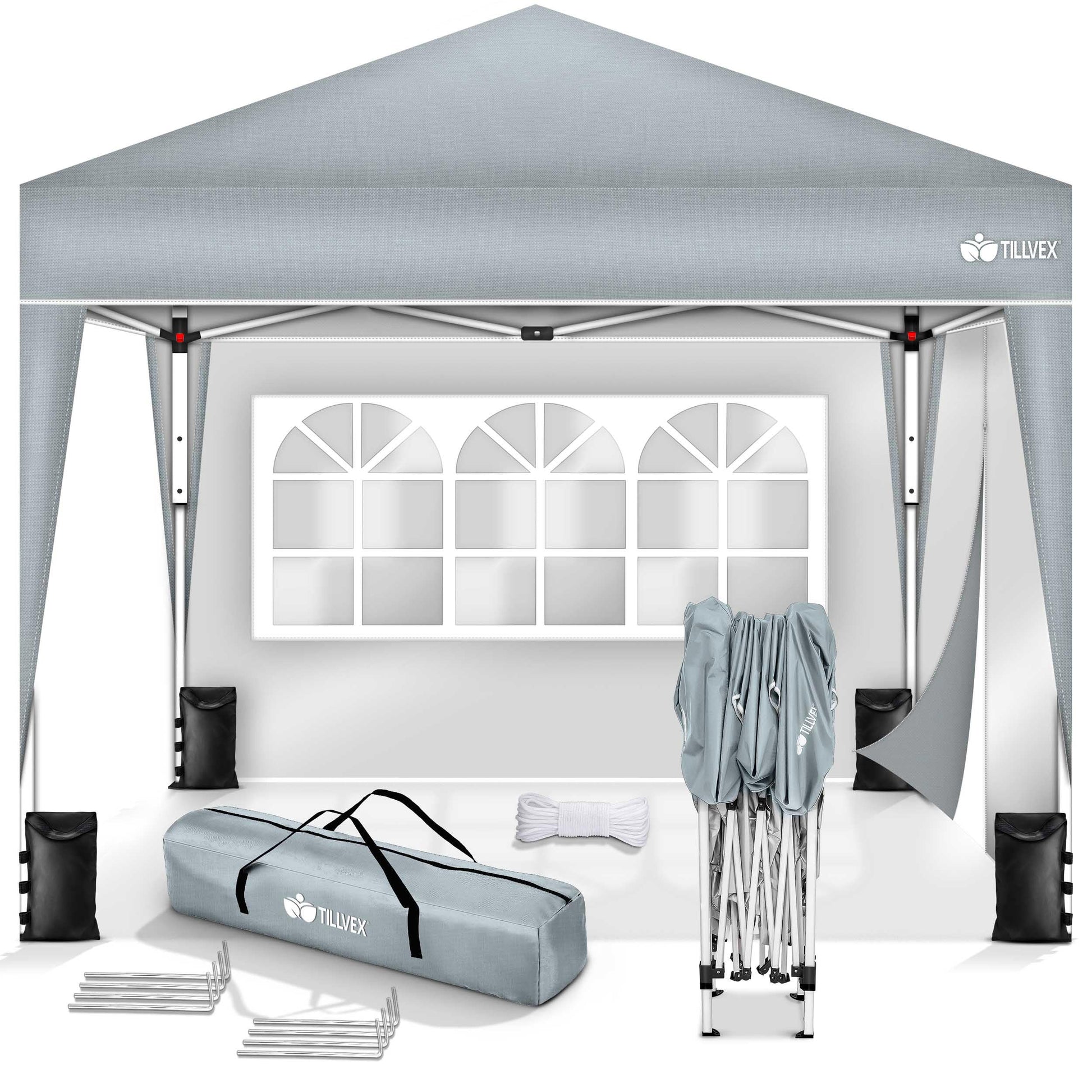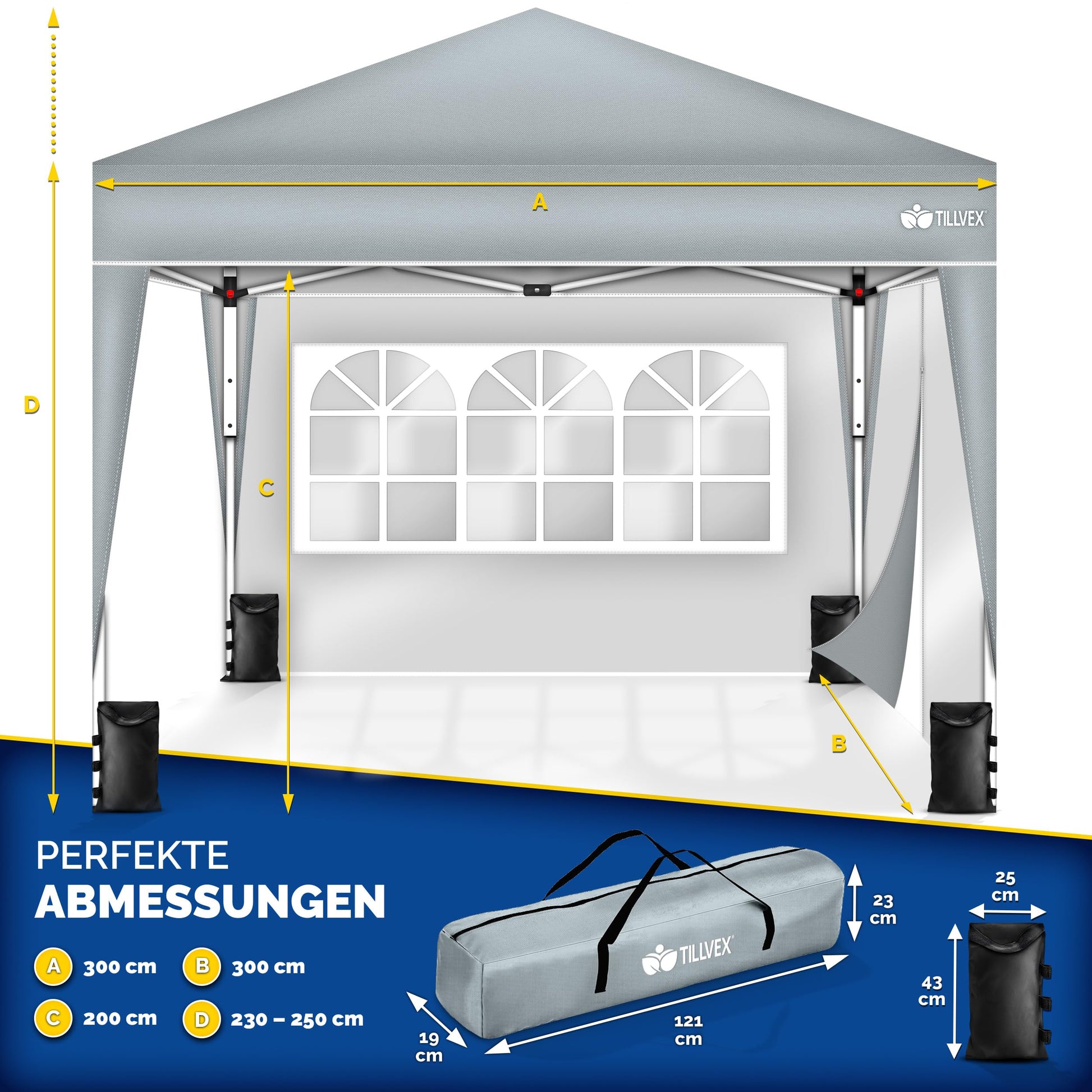tillvex Gazebo 3 x 3 m Waterproof with 4 Side Panels + Set of 4 Sandbags Pop-Up Folding Gazebo Stable & Height Adjustable Garden Tent UV Protection 50+ Party Tent with Bag for Garden, Grey