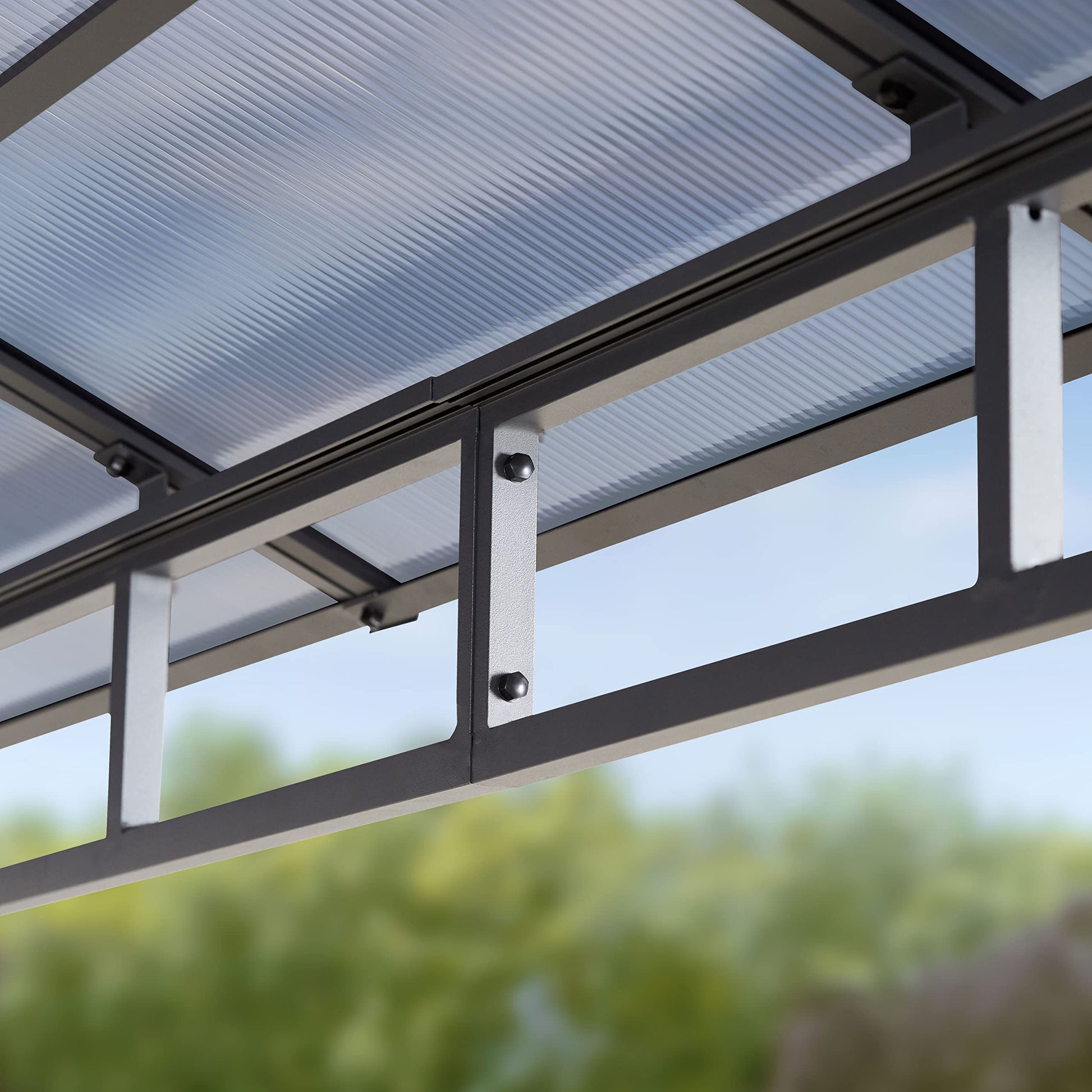 - Everything is included: Weather-proof aluminium frame. Polycarbonate roof panels. 4 side panels including a hook for hanging. 8 concrete anchors for secure attachment at the base. Assembly tools. Easy-to-understand assembly instructions (English language not guaranteed).