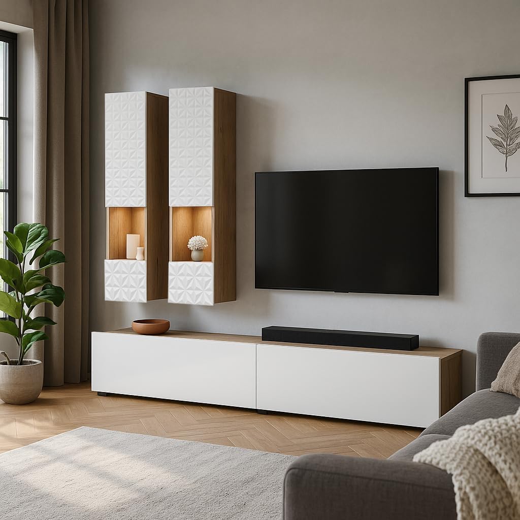 The stylish wall set in Artisan oak and matt white combines modern design with high functionality. Consisting of two hanging display cases and two TV lowboards, it offers plenty of storage space and an elegant look. The doors with soft-close function allow for silent closing, while the handle-less design provides a minimalist aesthetic. The high-quality milling on the fronts set stylish accents and give the piece of furniture a special depth. The TV lowboard can be mounted both standing and hanging and adapts flexibly to individual needs. With an overall size of 241 x 200 x 30 cm, the set blends harmoniously into any modern living room and creates an elegant living atmosphere. Perfect for style-conscious interior lovers who value quality and design.