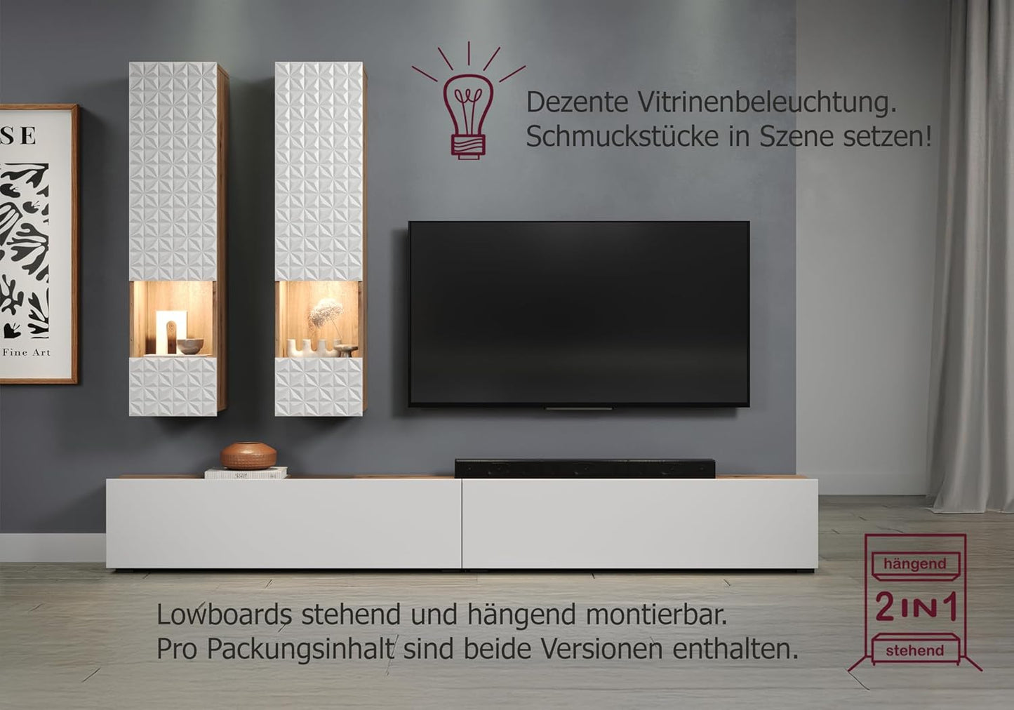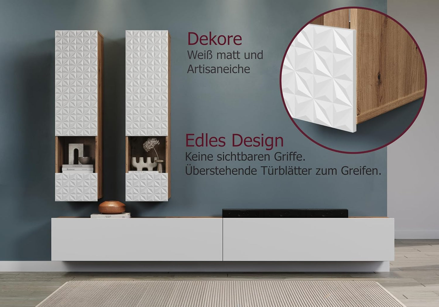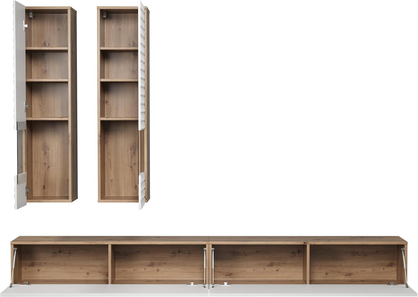 - Description - This elegant living wall set for stylish living rooms combines 2 hanging display cabinets each with 1 door and 1 TV lowboard with 2 flaps to create a modern, handle-free design with functional storage. Harmonious colouring in warm Artisan oak and elegant white matt sets accents and creates order - ideal for contemporary furnished living rooms