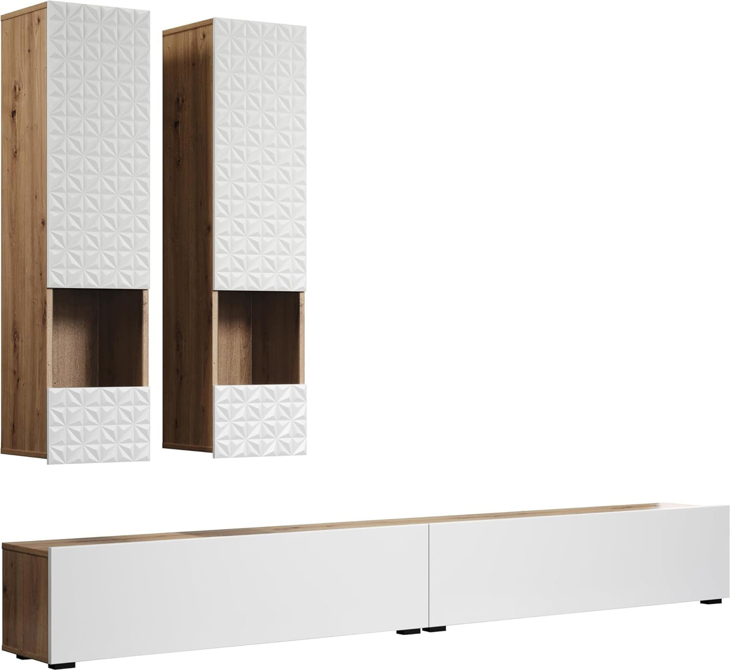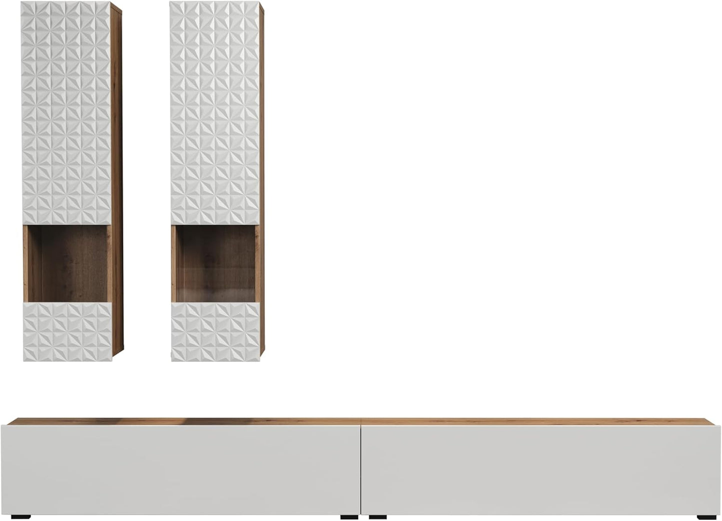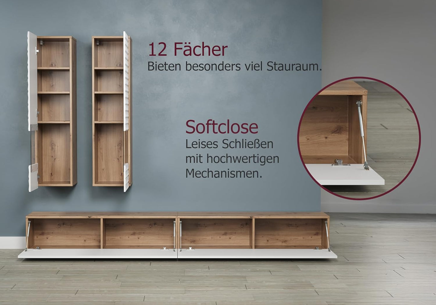 - Description - This elegant living wall set for stylish living rooms combines 2 hanging display cabinets each with 1 door and 1 TV lowboard with 2 flaps to create a modern, handle-free design with functional storage. Harmonious colouring in warm Artisan oak and elegant white matt sets accents and creates order - ideal for contemporary furnished living rooms