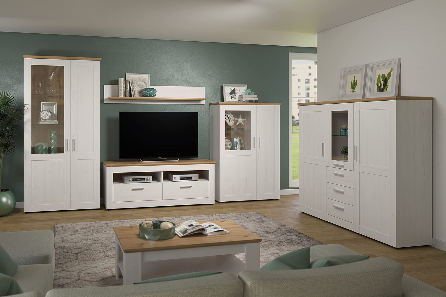 - Durchdachte Aufteilung – Das Set umfasst ein TV-Unterteil, 2 Vitrinen, ein Wandboard und bietet 4 Türen, 2 Schubladen, 2 offene Fächer sowie 7 Einlegeböden und 3 Glaseinlegeböden für eine perfekte Kombination aus Funktionalität und Design
