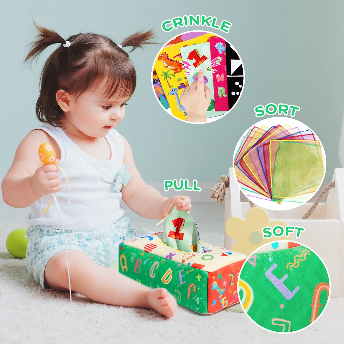 - PERFECT GIFT FOR BABY BOYS & GIRLS We believe you will have a happy time playing with your kids with these toys. Regardless of age and gender you plan to give as a gift, our tissue box is ideal newborn development toy for 0 - 12 months toddlers, perfect gift for birthdays and Christmas.