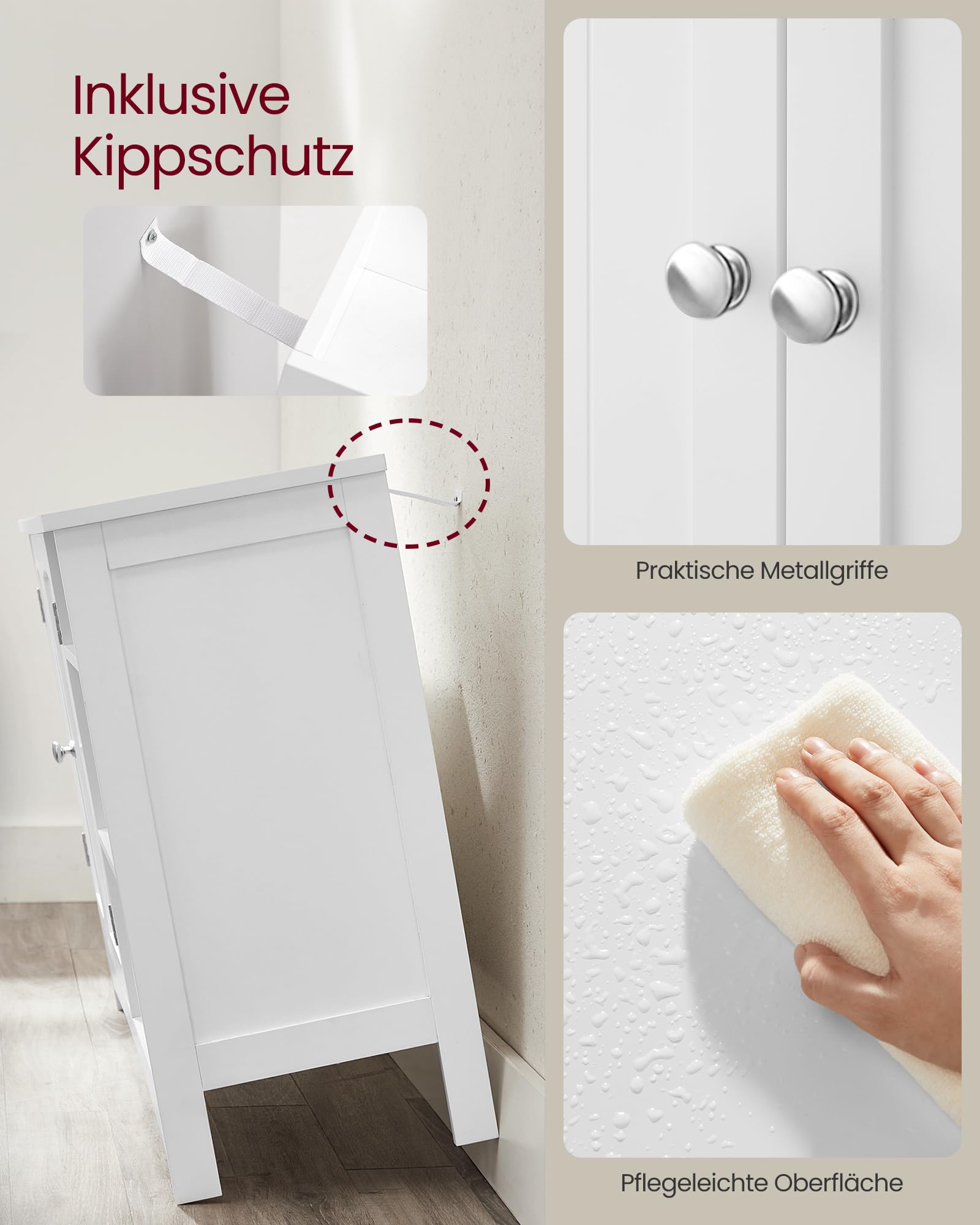 - Fresh wind for the bathroom: The white colour, the cabinet doors with special grooves and the chrome-plated metal handles give this bathroom cabinet a distinctive look. From now on, a fresh wind blows in your bathroom