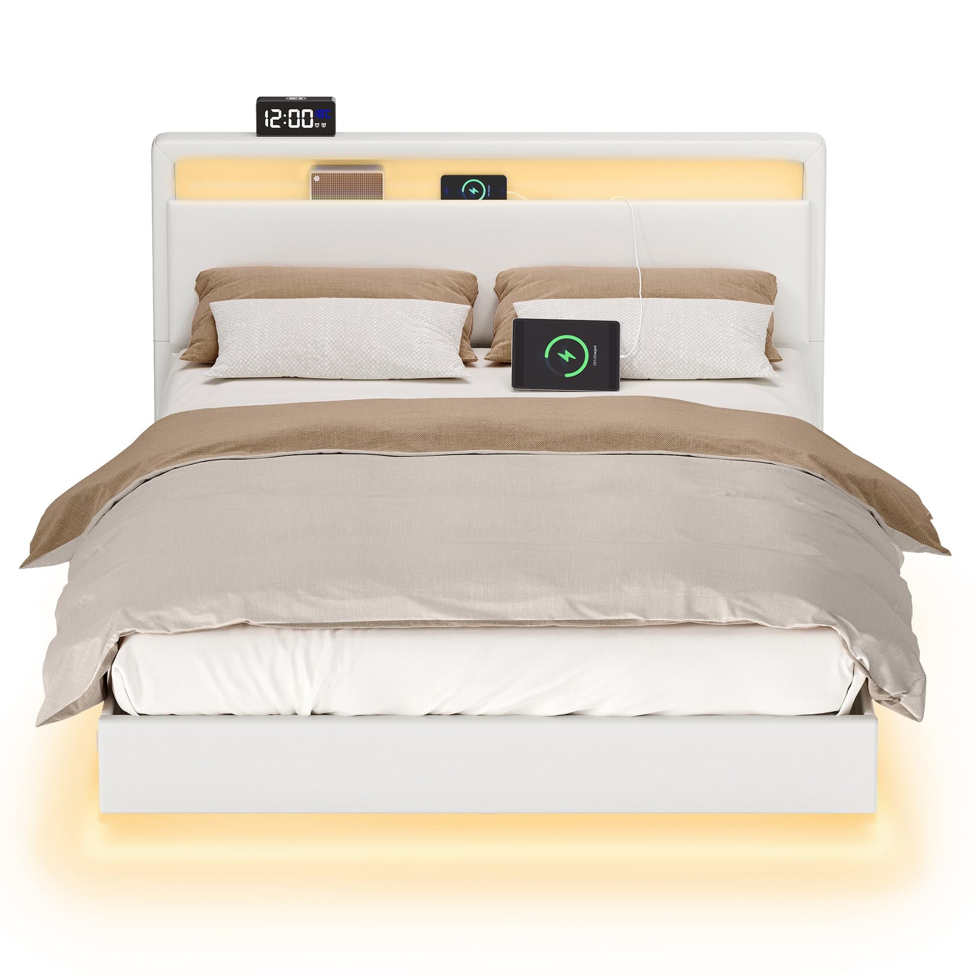 VASAGLE Double Bed Frame 140 x 200 cm Floating Visual Effect Bed with LED Lighting High Headboard Charging Station Modern Cloud White RMB864W01