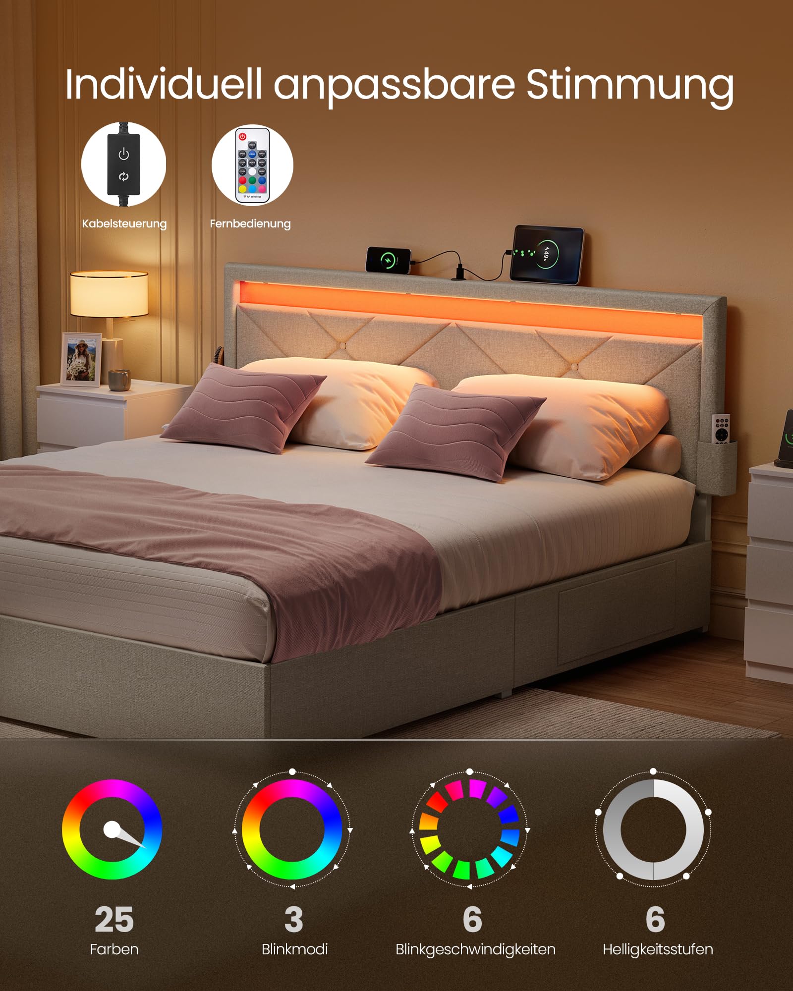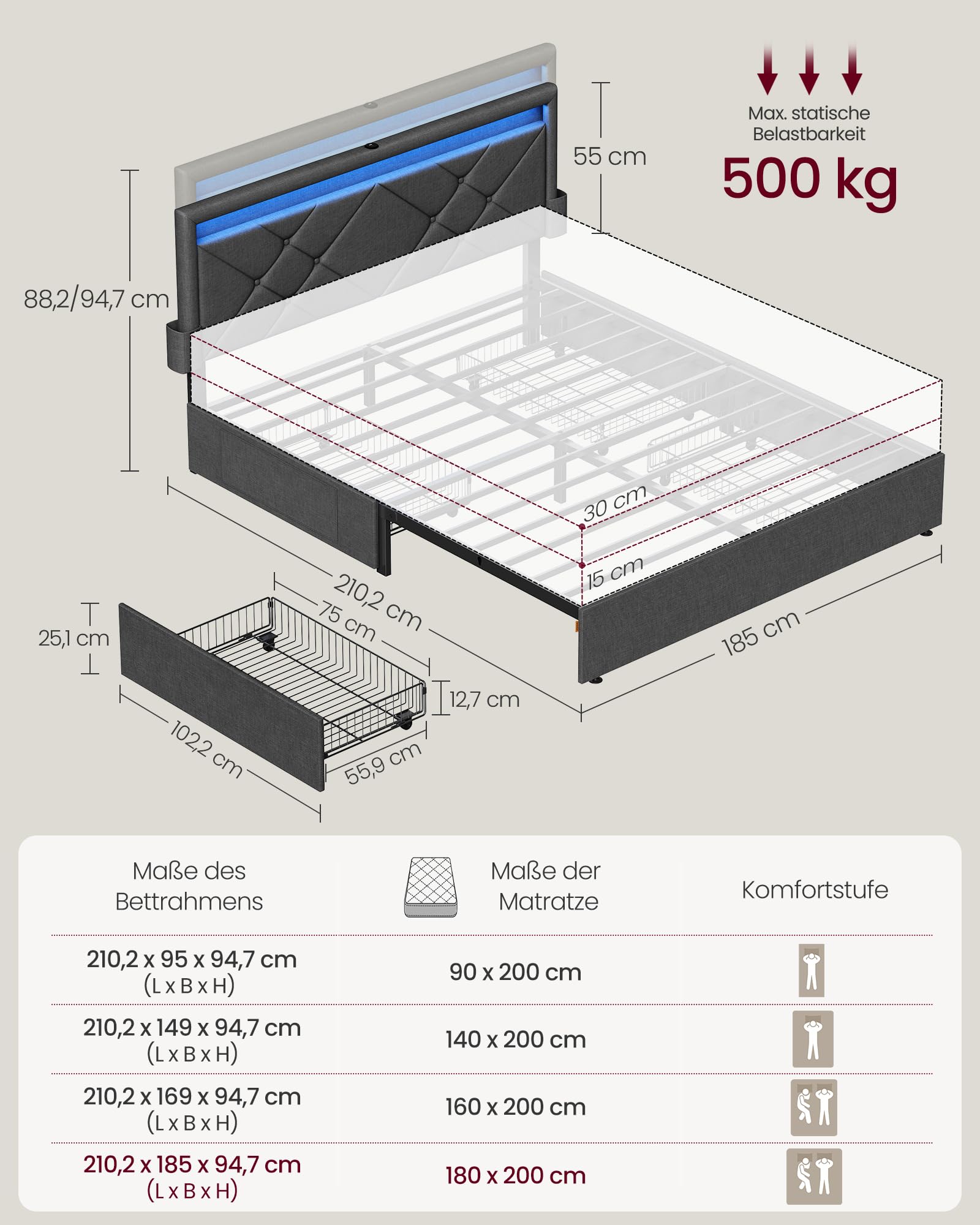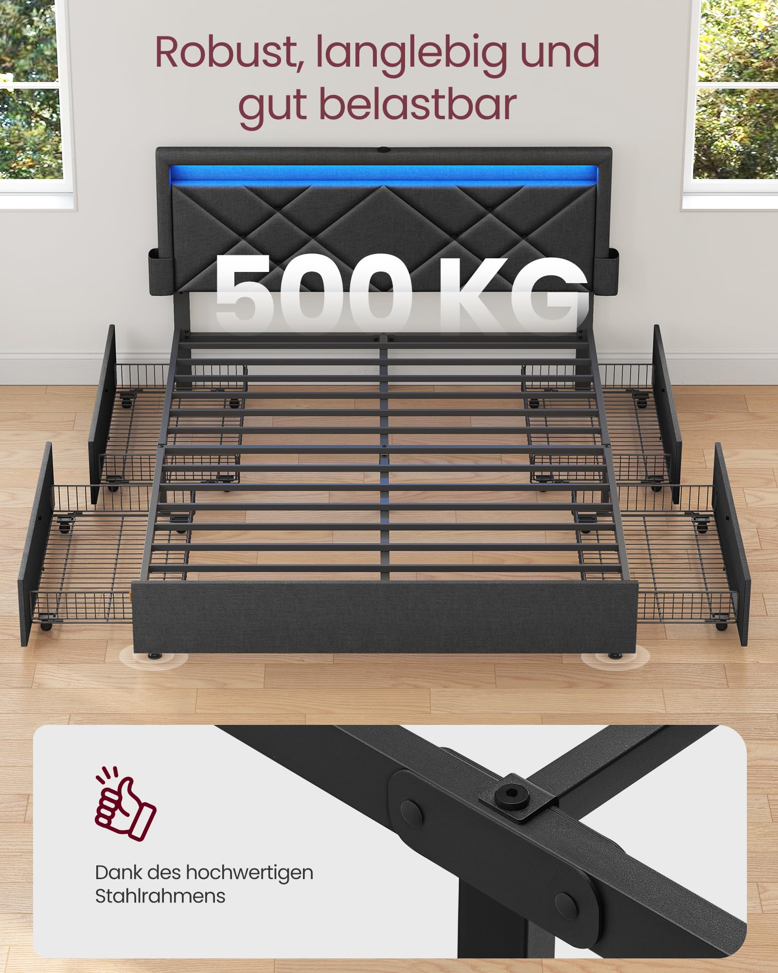 VASAGLE Double Bed Frame - Fits 140 x 200 cm Mattress - LED Metal Bed - 4 Drawers - Charging Station - Adjustable Padded Headboard - Slate Grey RMB827G02