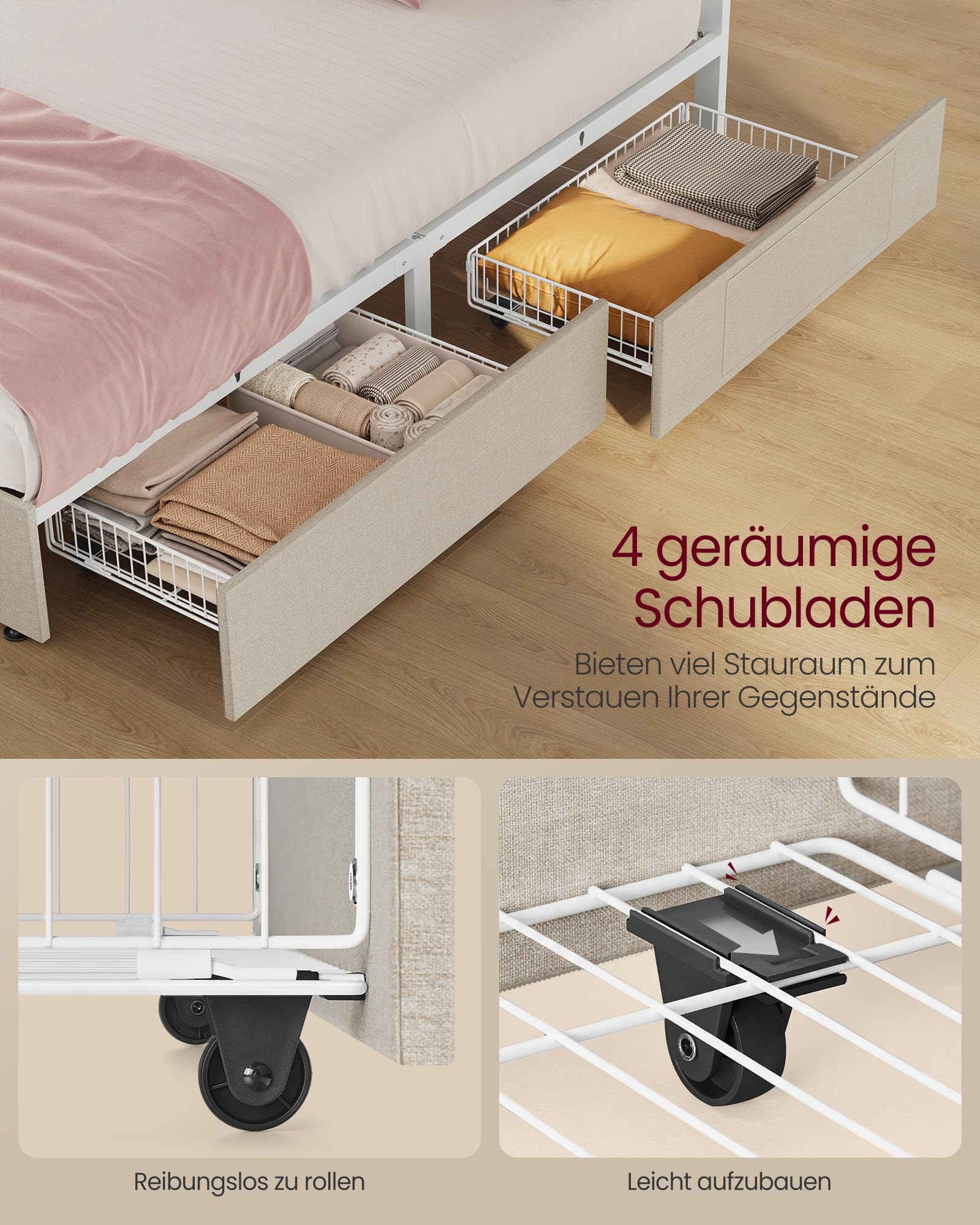 - Versatile storage space: 4 large drawers for your clothes, 2 organisers for your books and 2 side pockets for your glasses and knick-knacks - all your items have their own space