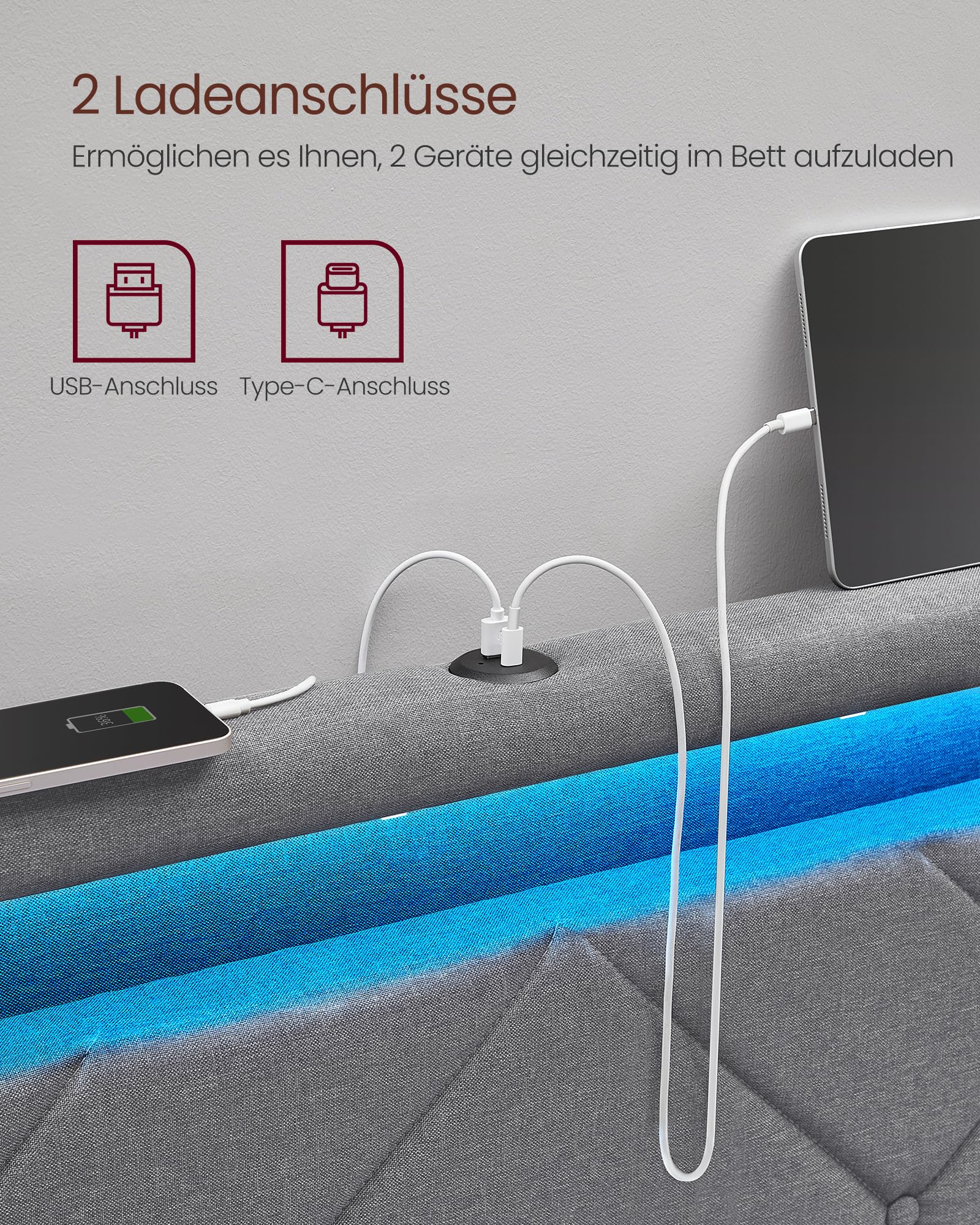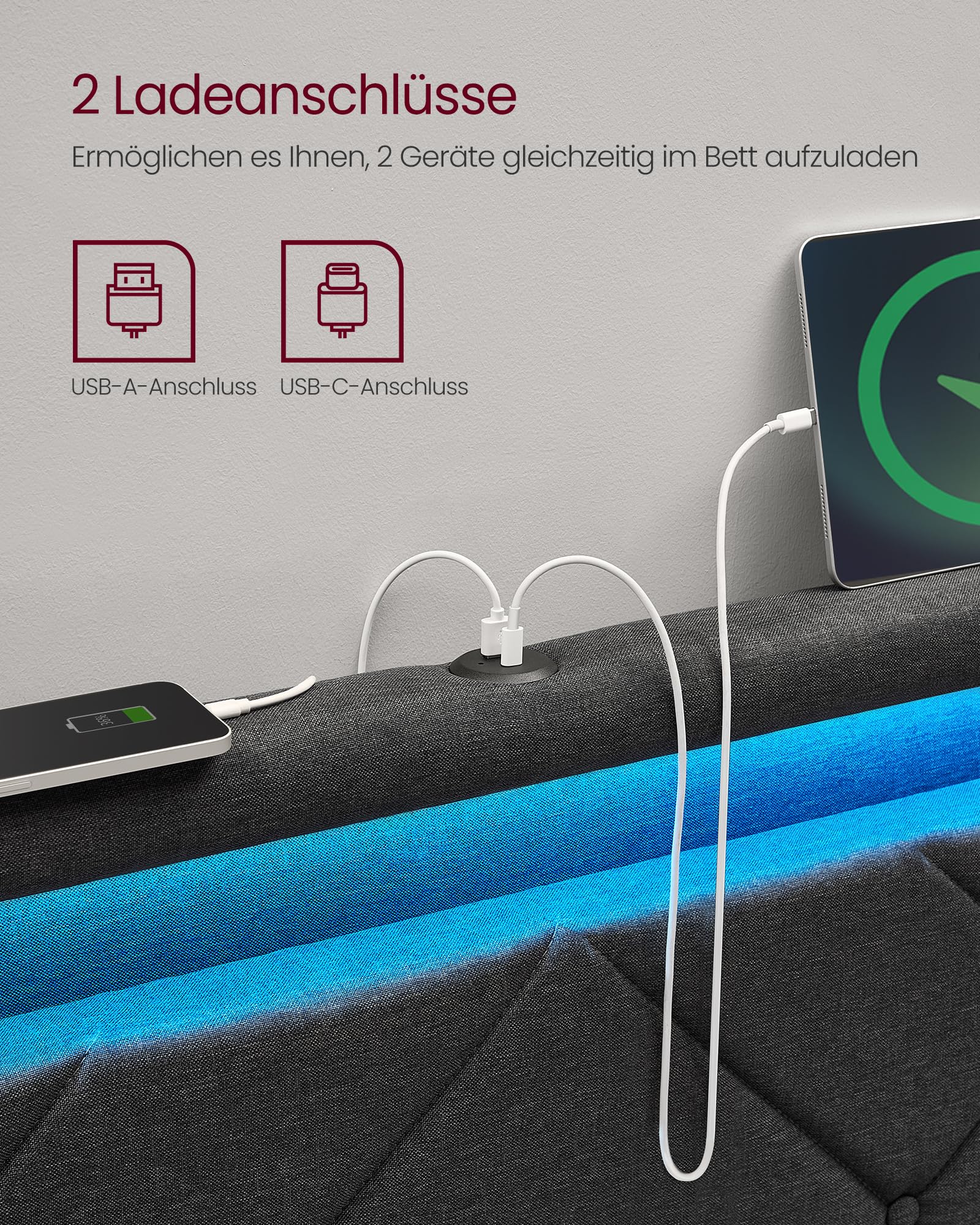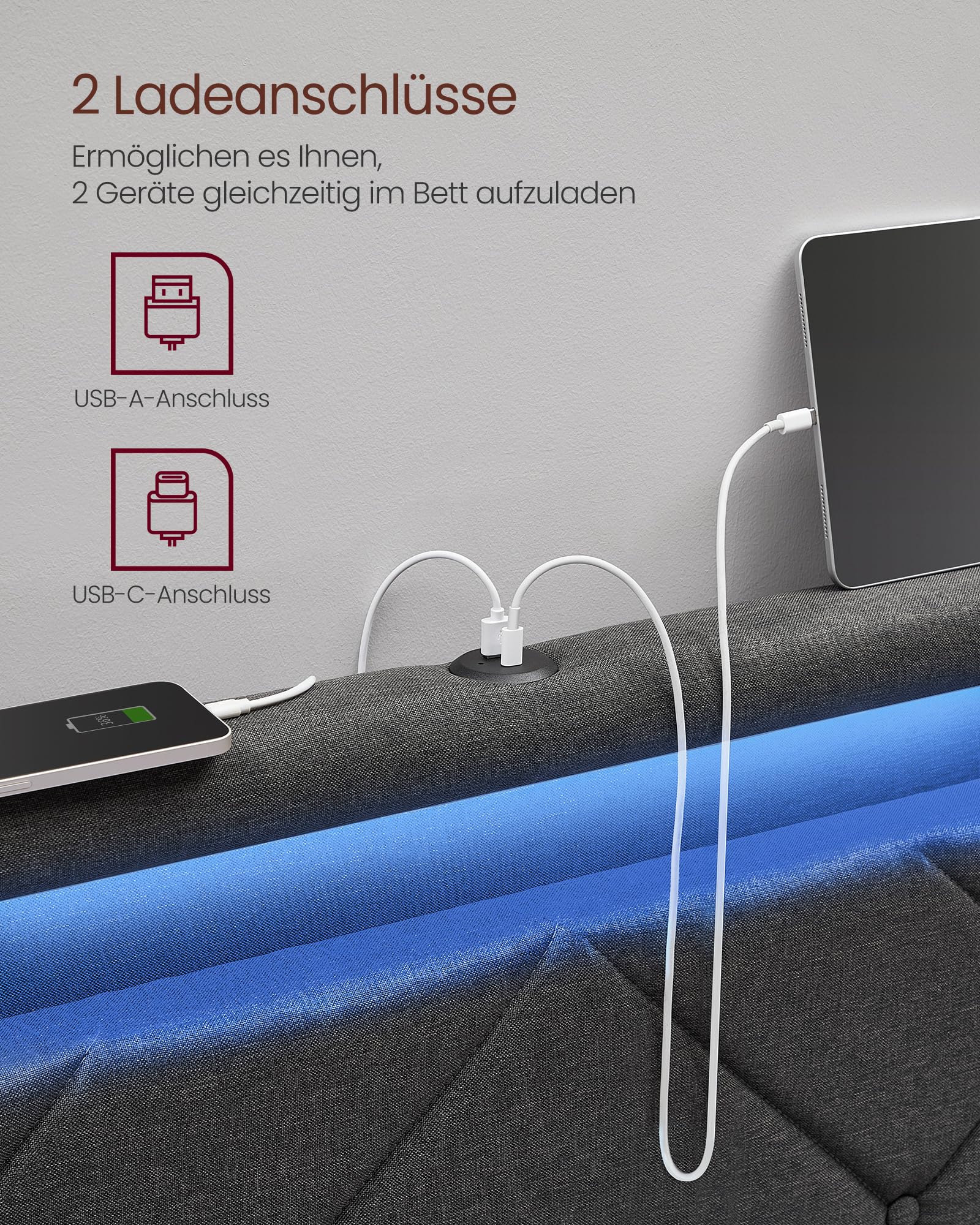 - Practical charging station: the headboard of this bed frame has 1 USB-A port and 1 USB-C port, so you can charge 2 devices at the same time. You can always watch your favourite shows or play video games in bed with full battery!